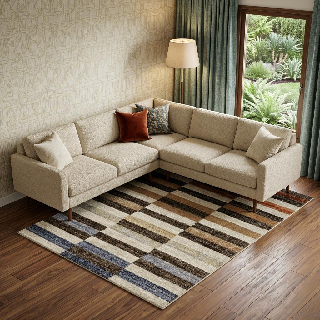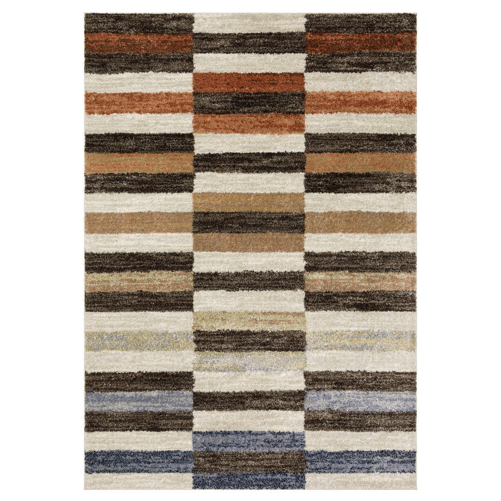 MID-CENTURY GEOMETRIC STRIPE RUG, MACHINE WOVEN POLYPROPYLENE BASE, MULTI COLORED & BROWN GEMMA CARPET, GEOMETRIC STRIPE PATTERNS,MID-CENTURY CONTEMPORARY STYLE MAT, LOW PROFILE CONSTRUCTION |
