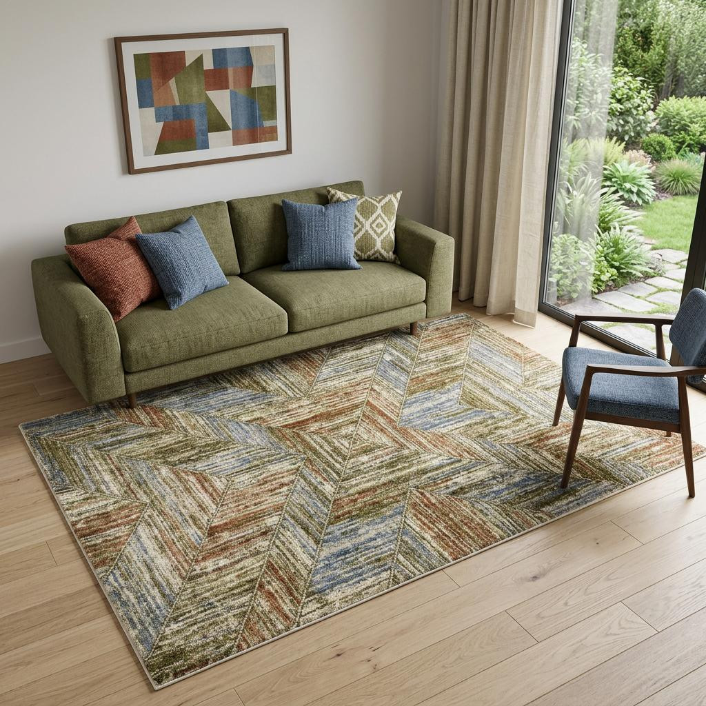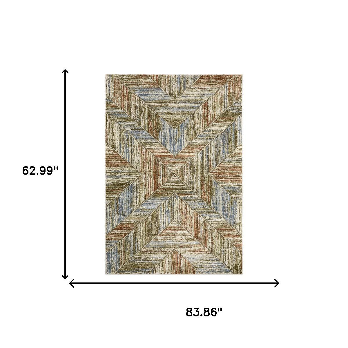 Add some artistry to your room with this 5-foot x 7-foot blue and rust geometric area rug. Ideal for spaces with kids and pets, this rug is stain resistant to help repel dirt and spilled liquids. Built to last, this rug crafted from polypropylene fibers is known for its durability and long lasting appeal. This larger sized, modern styled rug is ready to create a focal point or statement piece in your room. 62.99-inch h x 83.86-inch w x 0.55-inch d.