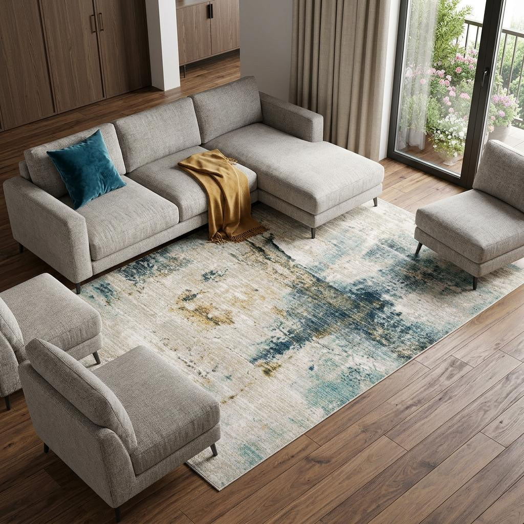 MODERN ABSTRACT RUG, MACHINE WOVEN BASE, IVORY BLUE POLYPROPYLENE BLEND, NON-SLIP BACKING CAVET CARPET, MODERN & CONTEMPORARY ABSTRACT PATTERNS, LOW PROFILE CONSTRUCTION |