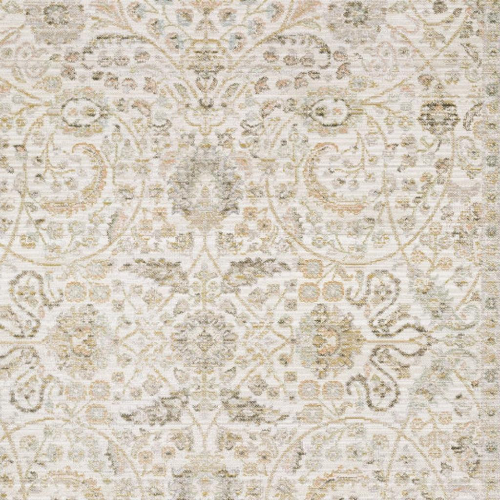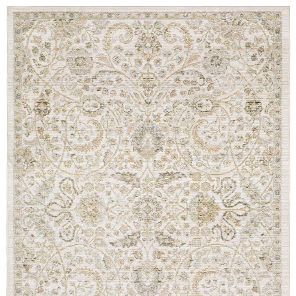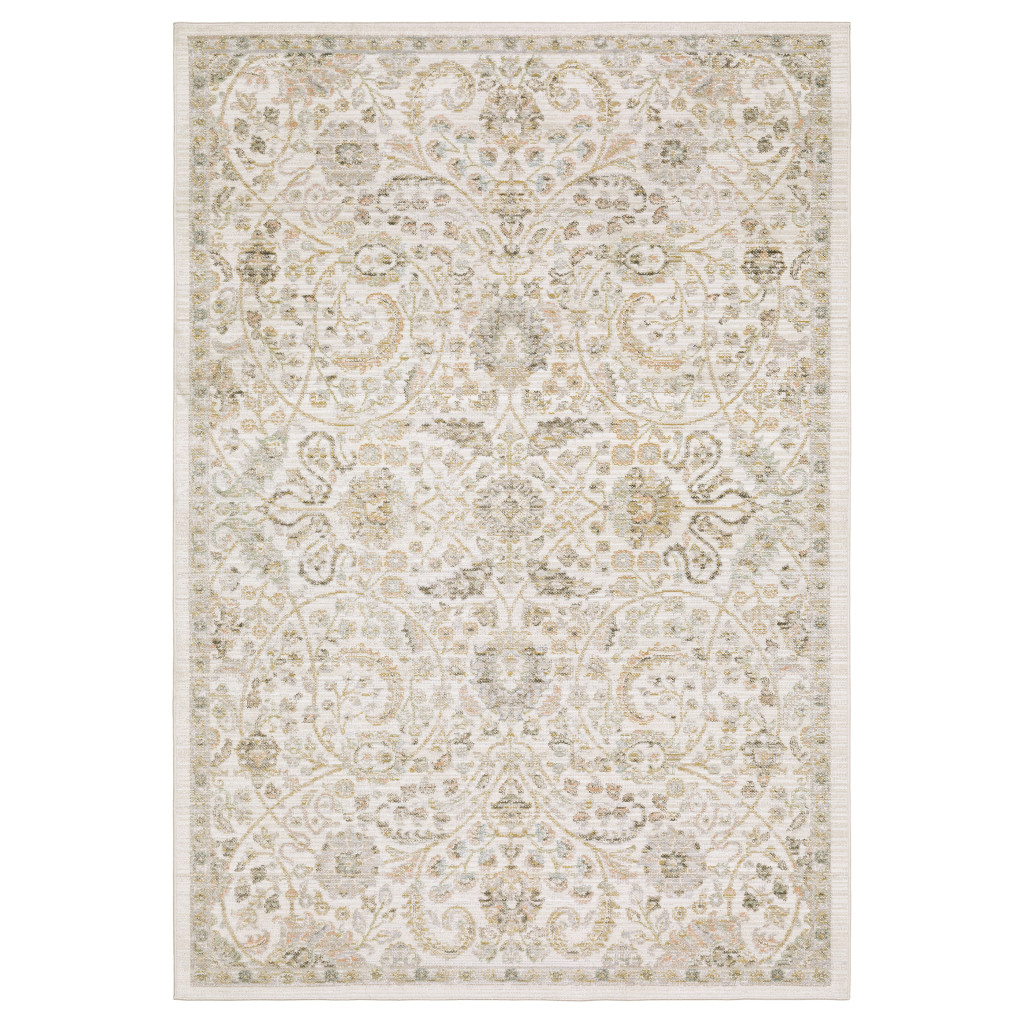 This 8-foot x 11-foot ivory and gold floral area rug, is a great way to add warmth to a room. Ideal for spaces with kids and pets, this rug is stain resistant to help repel dirt and spilled liquids. Built to last, this rug crafted from polypropylene blend fibers is known for its durability and long lasting appeal. This larger sized, traditional styled rug is ready to create a focal point or statement piece in your room. 94.49-inch h x 129.92-inch w x 0.20-inch d.
