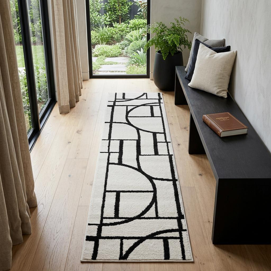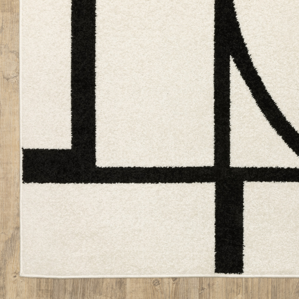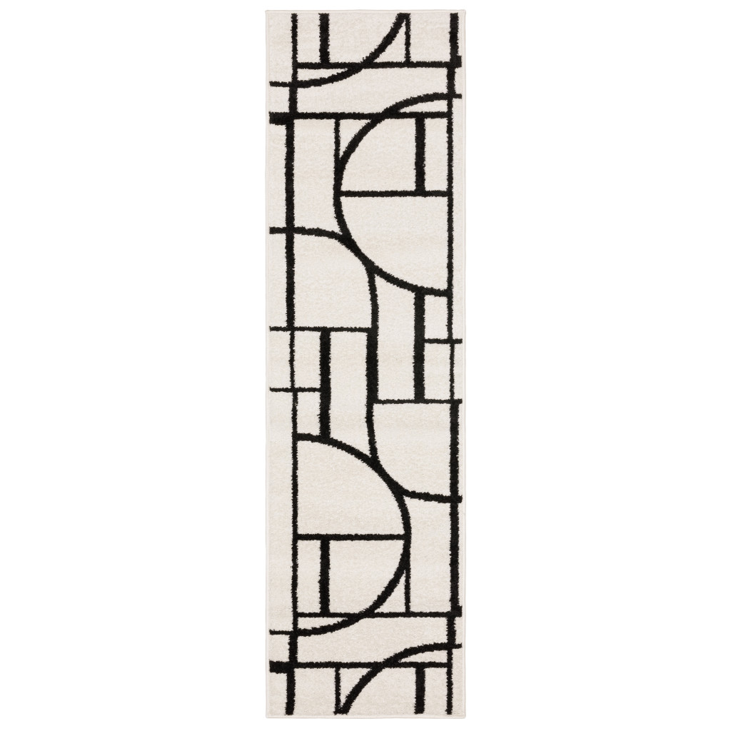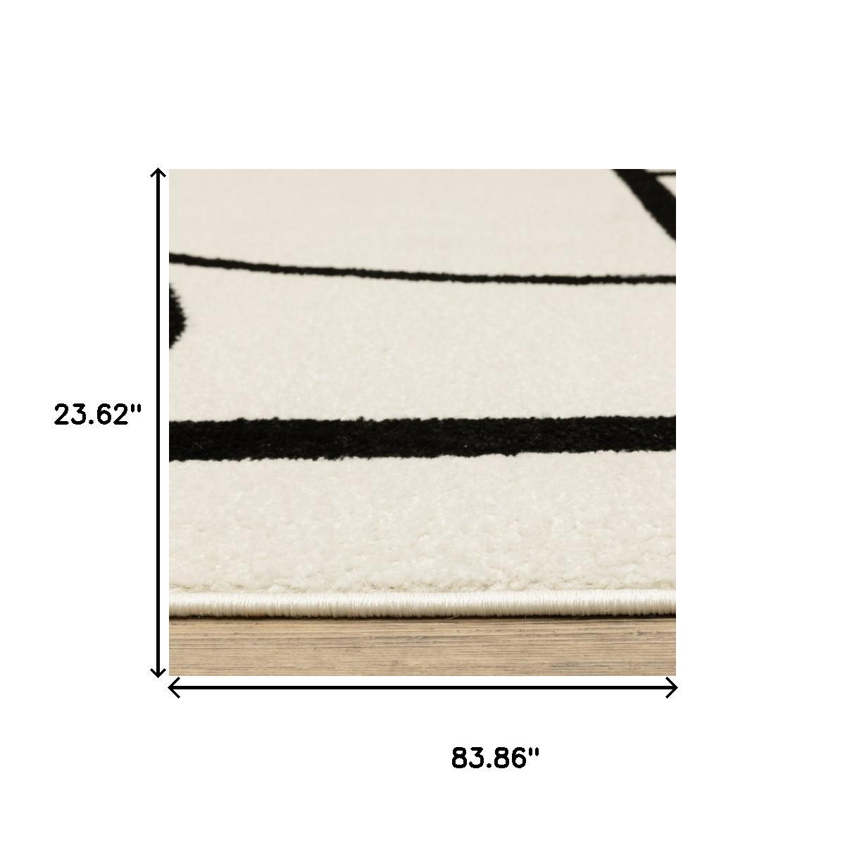 This 7-foot ivory and black geometric runner rug, is a great way to add warmth to a room. Ideal for spaces with kids and pets, this rug is stain resistant to help repel dirt and spilled liquids. Built to last, this rug crafted from polypropylene fibers is known for its durability and long lasting appeal. This modern style runner makes a great accent for the hallway, in front of cabinets, in the laundry room, or any other space you need a narrow and long rug. 23.62-inch h x 83.86-inch w x 0.35-inch d.
