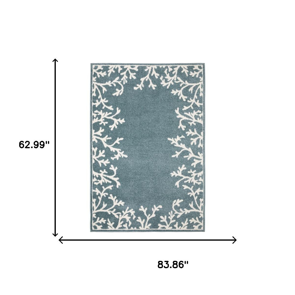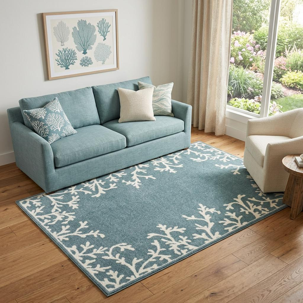 Set an inviting tone in your space with this 5-foot x 7-foot blue and ivory seashell and coral area rug. Ideal for spaces with kids and pets, this rug is stain resistant to help repel dirt and spilled liquids. Built to last, this rug crafted from polypropylene fibers is known for its durability and long lasting appeal. This larger sized, casual styled rug is ready to create a focal point or statement piece in your room. 62.99-inch h x 83.86-inch w x 0.35-inch d.
