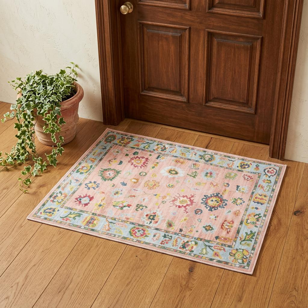 TRADITIONAL ORIENTAL RUG, MACHINE WASHABLE PRINTED BASE, PINK BLUE POLYESTER, NON-SLIP BACKING ADDISON CARPET, ORIENTAL DISTRESSED PATTERNS, TRADITIONAL BOHEMIAN CASUAL STYLE MAT, LOW PROFILE CONSTRUCTION |