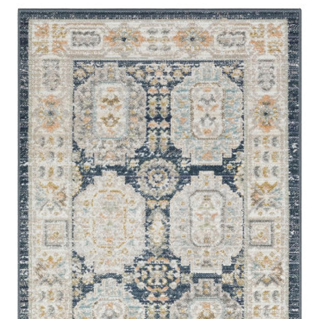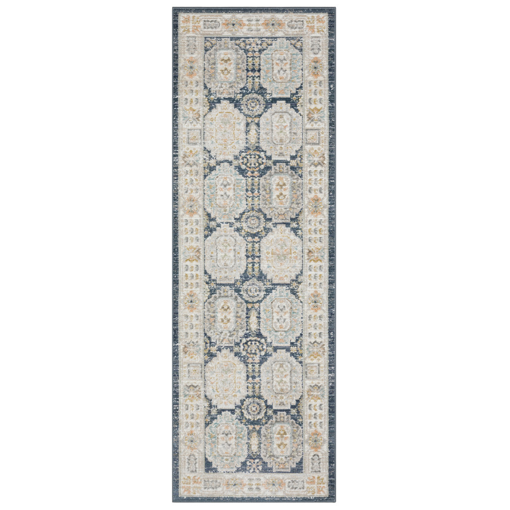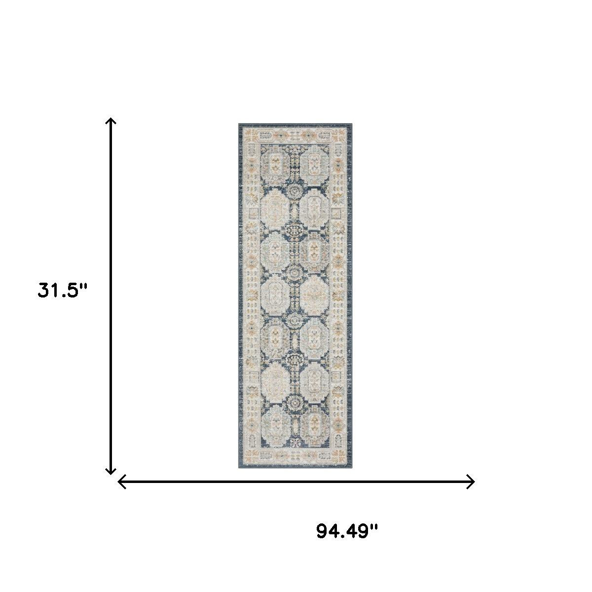 This 8-foot navy blue and ivory oriental runner rug, is a great way to add warmth to a room. Ideal for spaces with kids and pets, this rug is stain resistant to help repel dirt and spilled liquids. Built to last, this rug crafted from polypropylene blend fibers is known for its durability and long lasting appeal. This traditional style runner makes a great accent for the hallway, in front of cabinets, in the laundry room, or any other space you need a narrow and long rug. 31.50-inch h x 94.49-inch w x 0.20-inch d.