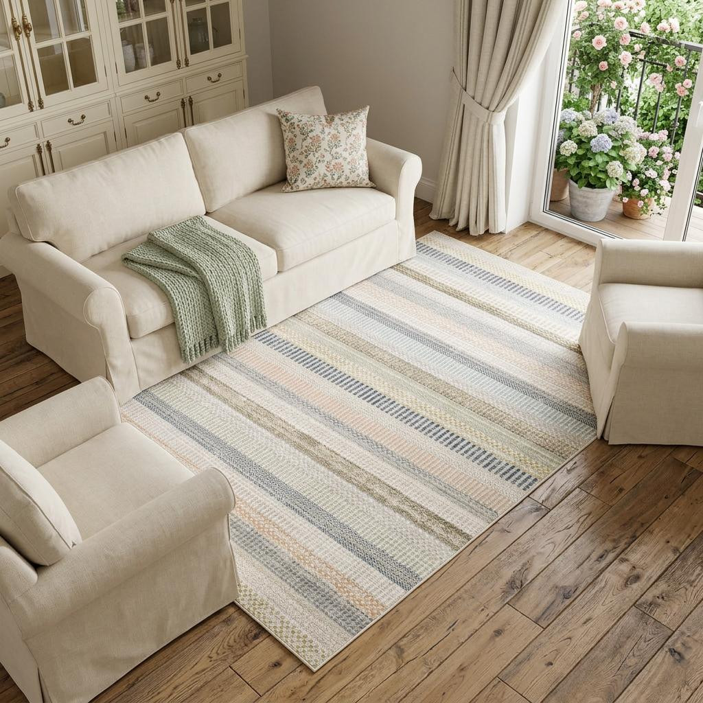 COTTAGE STRIPE RUG, MACHINE WOVEN BASE, IVORY MULTI POLYPROPYLENE BLEND, NON-SLIP BACKING CAVET CARPET, STRIPE GEOMETRIC PATTERNS, COTTAGE & TRANSITIONAL STYLE, LOW PROFILE CONSTRUCTION |