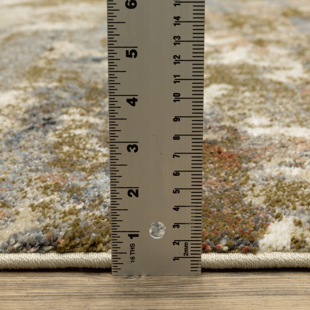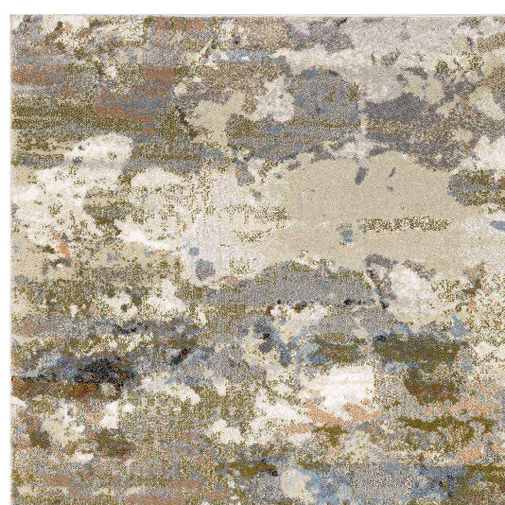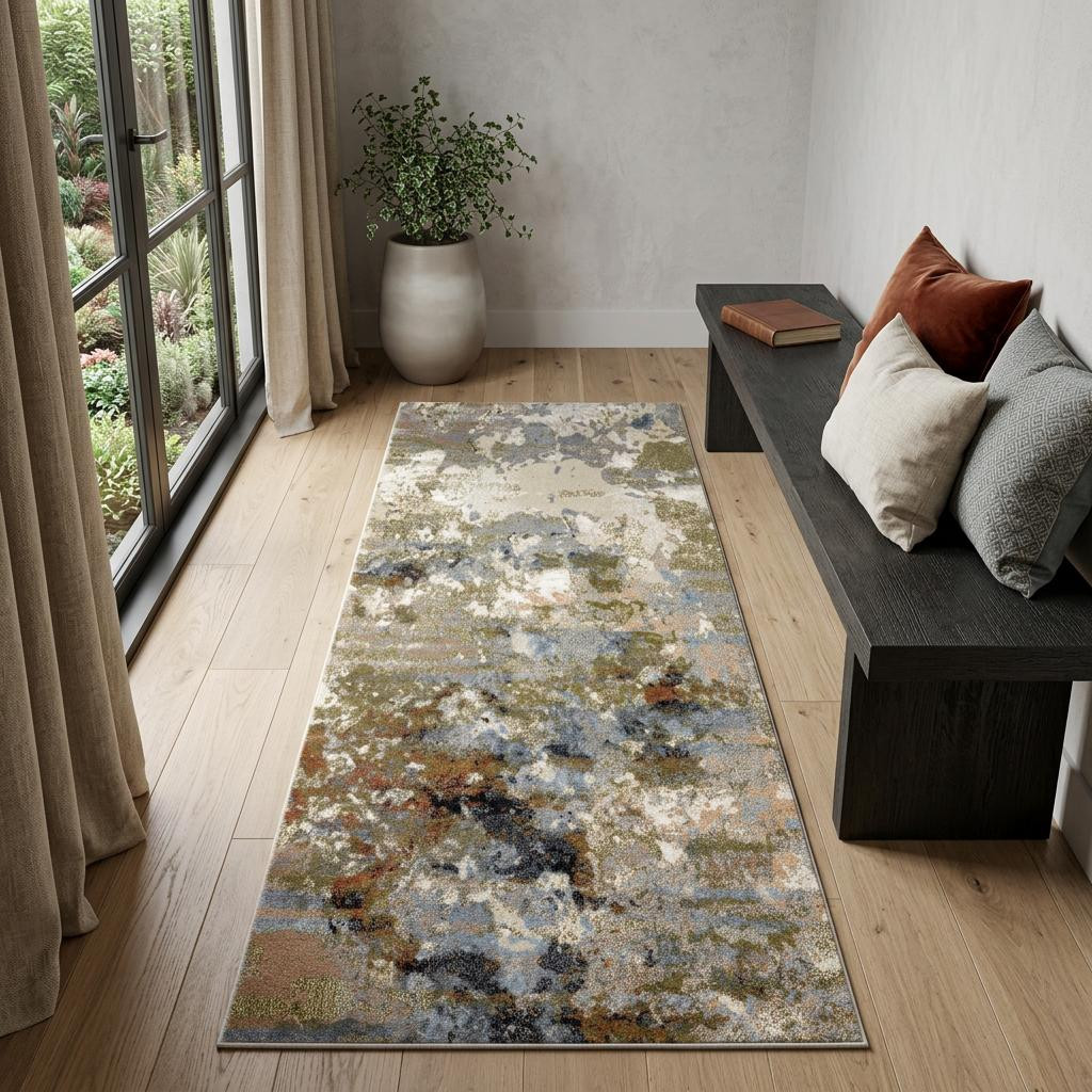 This 7-foot olive green and blue abstract runner rug, is a great way to add warmth to a room. Ideal for spaces with kids and pets, this rug is stain resistant to help repel dirt and spilled liquids. Built to last, this rug crafted from polypropylene fibers is known for its durability and long lasting appeal. This contemporary style runner makes a great accent for the hallway, in front of cabinets, in the laundry room, or any other space you need a narrow and long rug. 26.77-inch h x 83.86-inch w x 0.55-inch d.