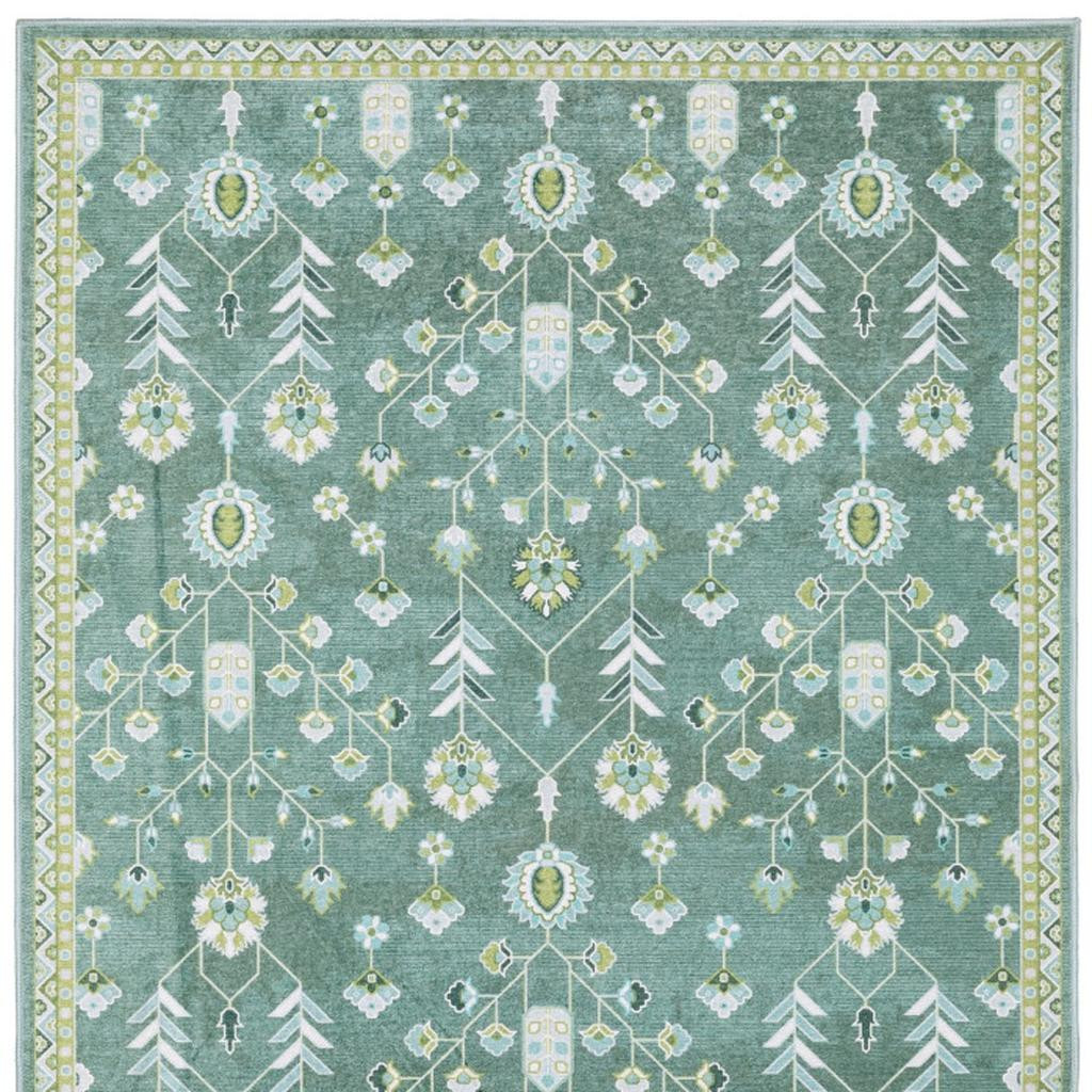 Add some artistry to your room with this 10-foot x 13-foot teal and green oriental washable area rug. Ideal for spaces with kids and pets, this rug is stain resistant to help repel dirt and spilled liquids. Built to last, this rug crafted from polyester fibers is known for its durability and long lasting appeal. This larger sized, traditional styled rug is ready to create a focal point or statement piece in your room. 118.11-inch h x 143.70-inch w x 0.12-inch d.