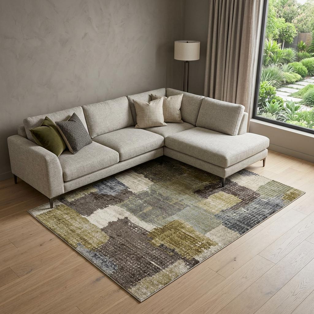 CONTEMPORARY ABSTRACT RUG, GREEN & BROWN POLYPROPYLENE MACHINE WOVEN BASE, HIGH PILE TEXTURE GEMMA CARPET, ABSTRACT COLORFUL PATTERNS, CONTEMPORARY MODERN STYLE MAT, LOW PROFILE CONSTRUCTION |
