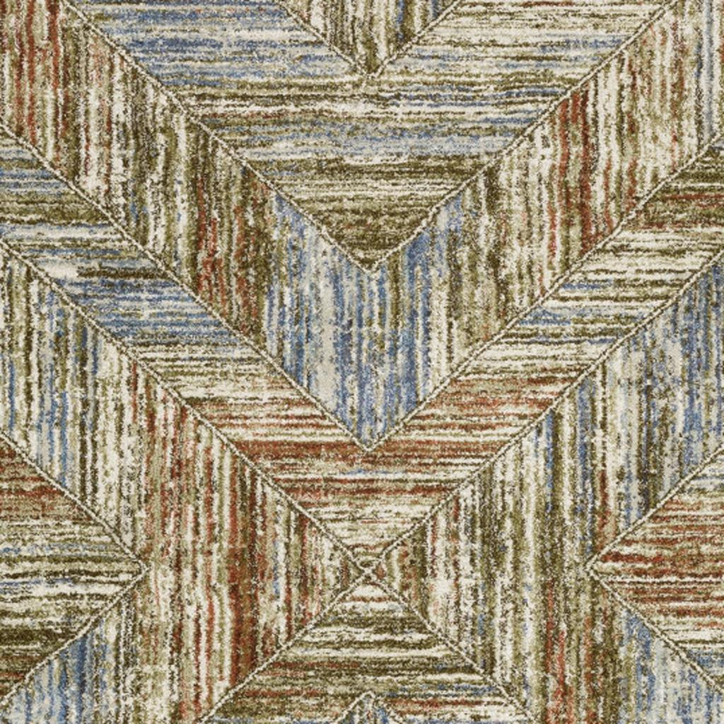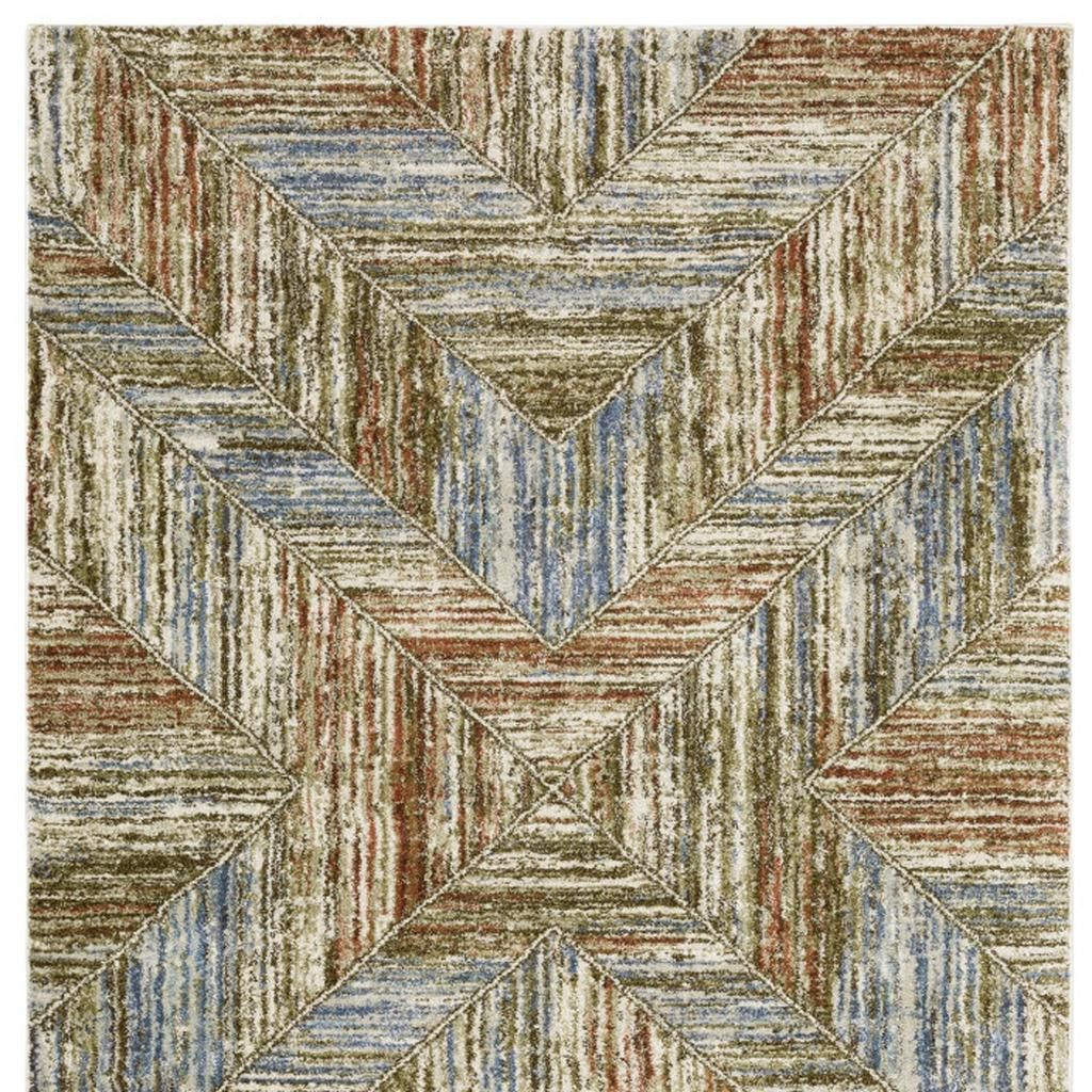 Add some artistry to your room with this 10-foot x 13-foot blue and rust geometric area rug. Ideal for spaces with kids and pets, this rug is stain resistant to help repel dirt and spilled liquids. Built to last, this rug crafted from polypropylene fibers is known for its durability and long lasting appeal. This larger sized, modern styled rug is ready to create a focal point or statement piece in your room. 118.11-inch h x 149.61-inch w x 0.55-inch d.