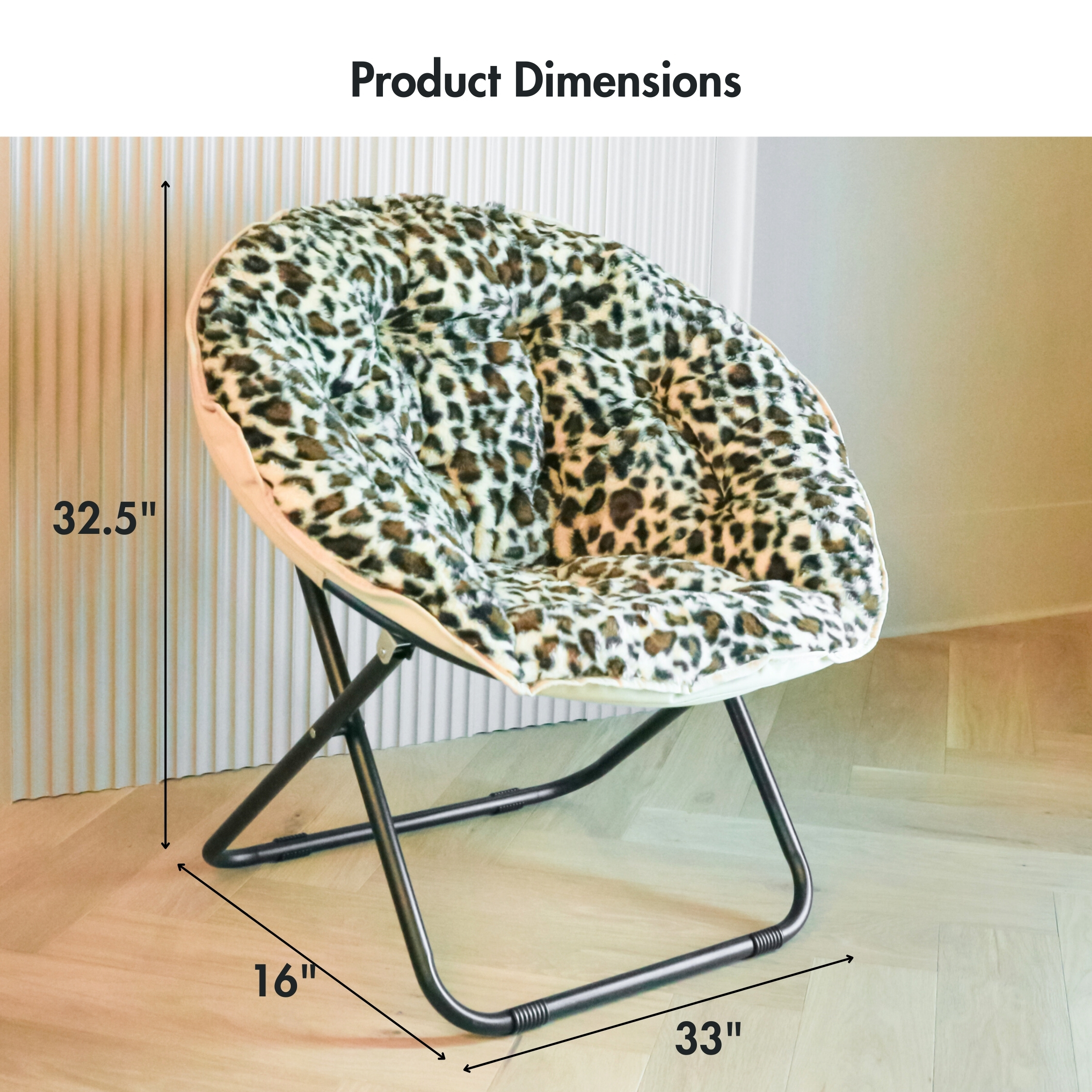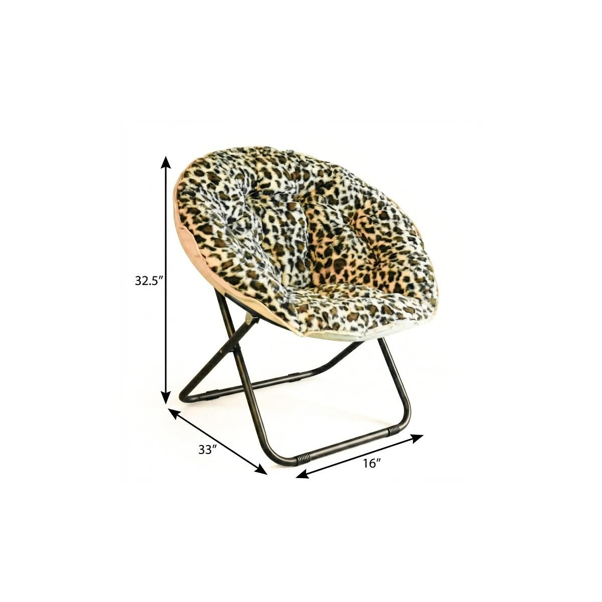 Unique and decorative, this 16-inch brown beige and black tufted faux fur and metal animal print folding lounge chair will leave a lasting impression. This updated and modern brown, beige, and black animal print design lounge chair is masterfully upholstered in durable faux fur. Giving the chair stability and structure, the inner frame is constructed with high quality metal and features a cushion back that comes complete with soft and comfortable cushioning. The tufted cushions add fine designer detailing. 32.50-inch h x 16.00-inch w x 33.00-inch d.