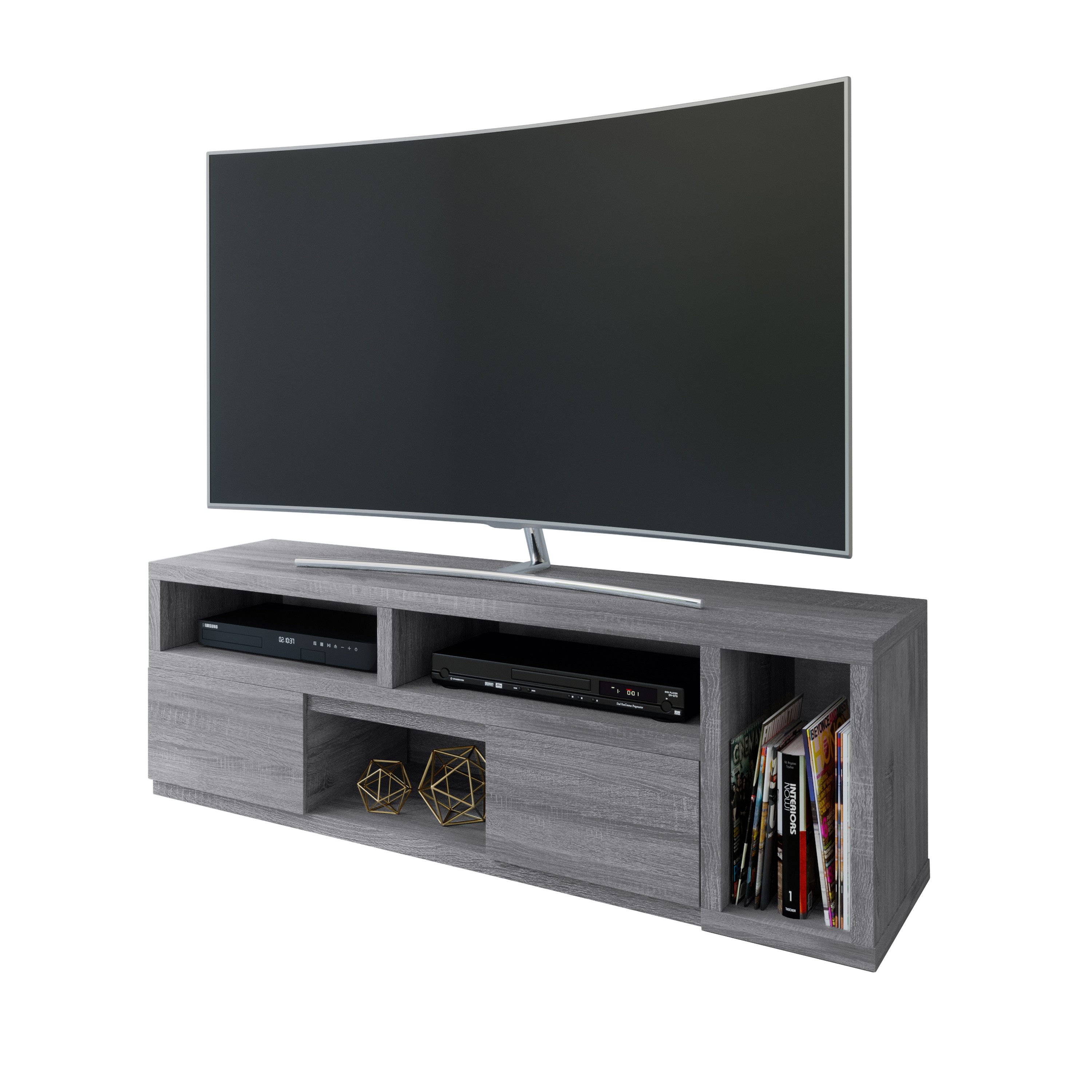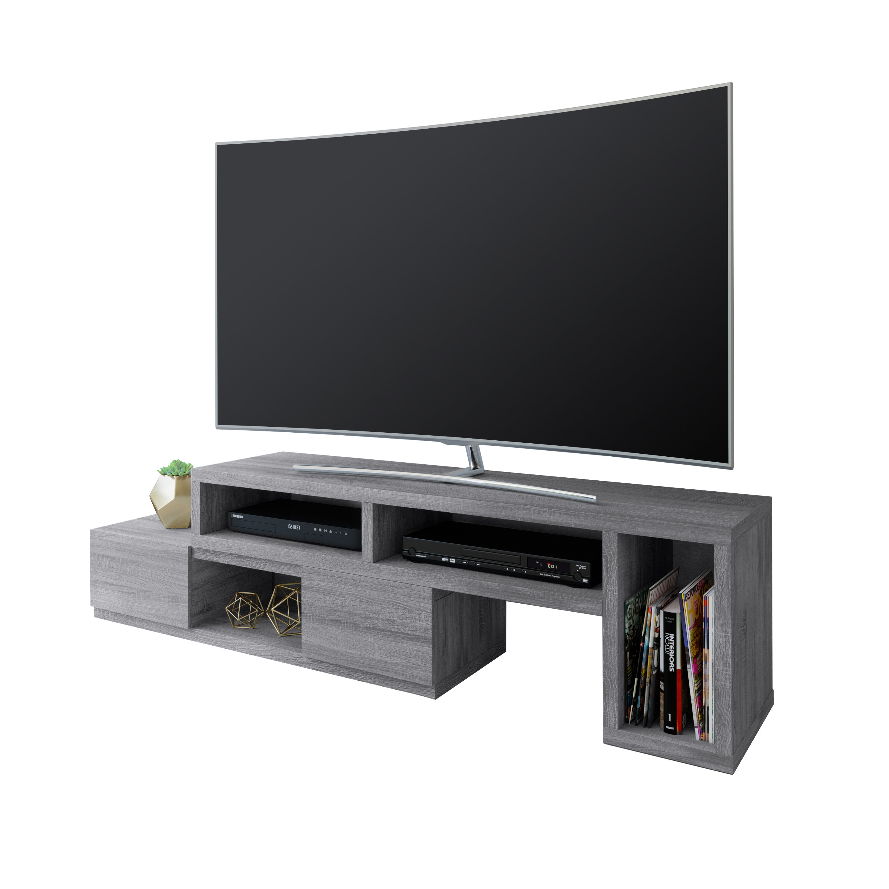 Create the ultimate blend of style, function, and design with this 54-inch gray wood enclosed and open storage tv stand. Designed to be sturdy and long lasting, this versatile furniture piece is crafted from durable manufactured wood and features a modern design style. To add to the versatility, this piece features open non-concealed storage that can be used for not only storage but display as well. A cord cut out hole is ideal for wire and cable management to keep your space look tidy. Ideal for tv placement and storage in your living room, bedroom or office. 18.00-inch h x 53.50-inch w x 15.25-inch d.