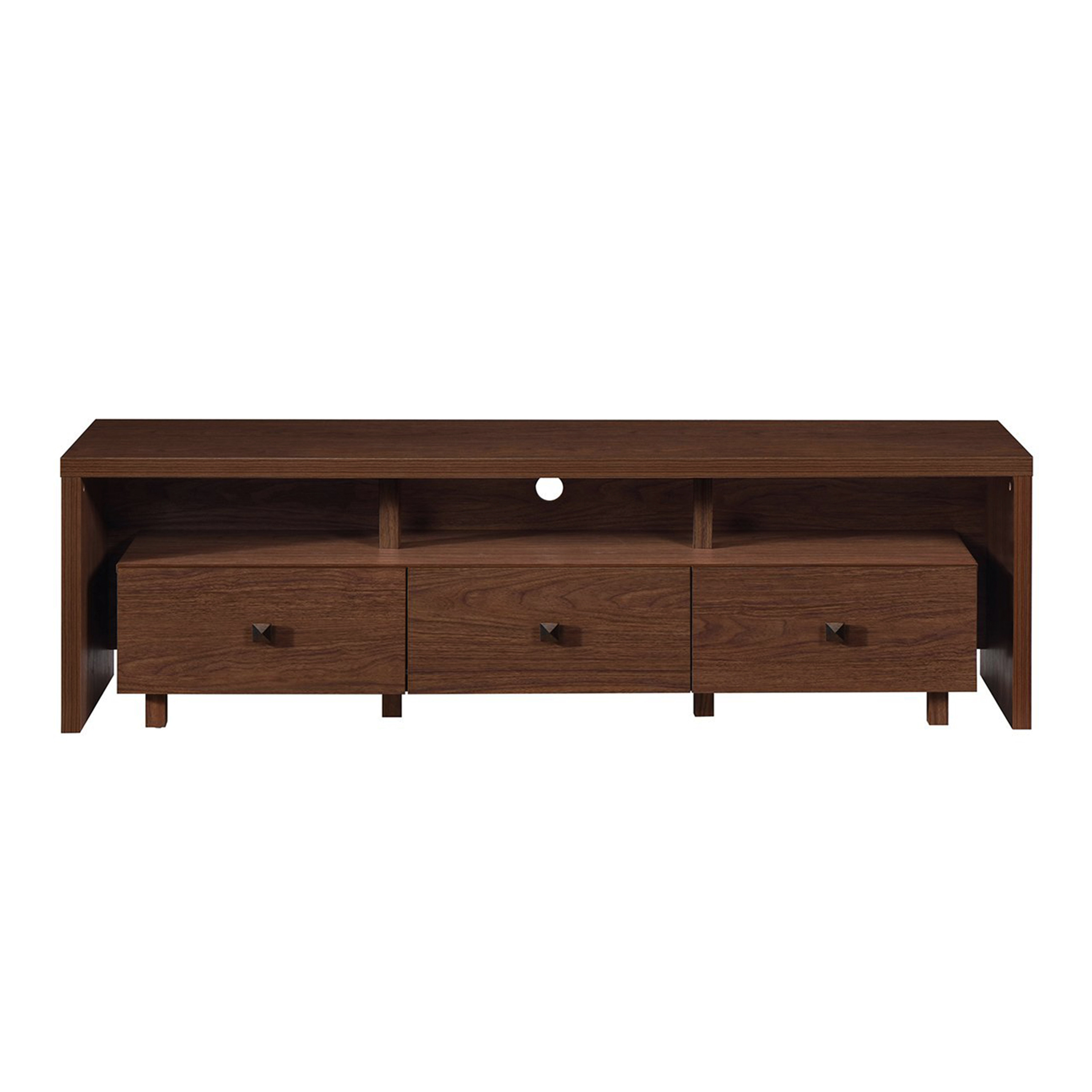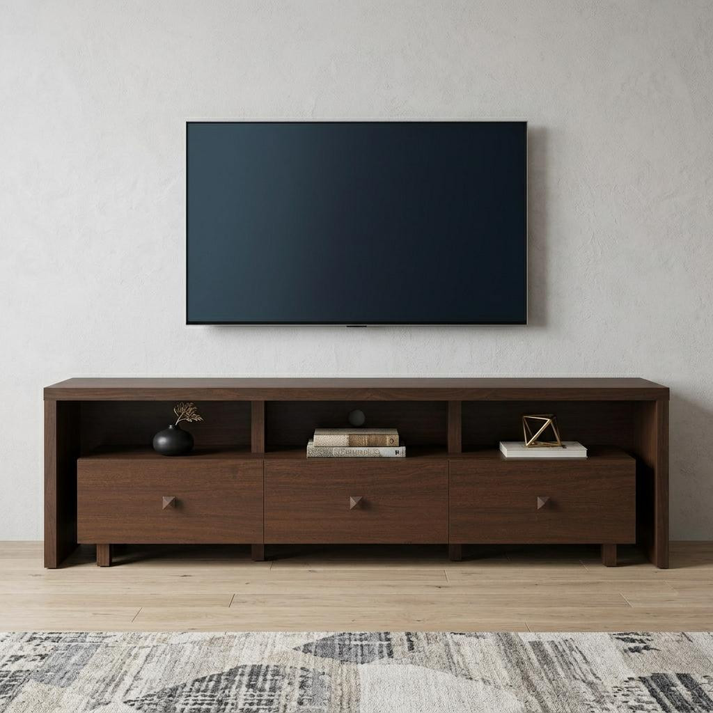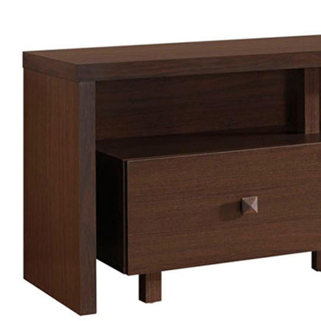 Ready to be enjoyed in your living room, family room, or recreation room, this 71-inch brown wood enclosed and open storage tv stand is a practical and good looking piece of furniture that will help to anchor your room. Designed to be sturdy and long lasting, this versatile furniture piece is crafted from durable manufactured wood and features a modern design style. To add to the versatility, this piece features open non-concealed storage that can be used for not only storage but display as well. A cord cut out hole is ideal for wire and cable management to keep your space look tidy. Ideal for tv placement and storage in your living room, bedroom or office. 20.00-inch h x 70.75-inch w x 15.25-inch d.