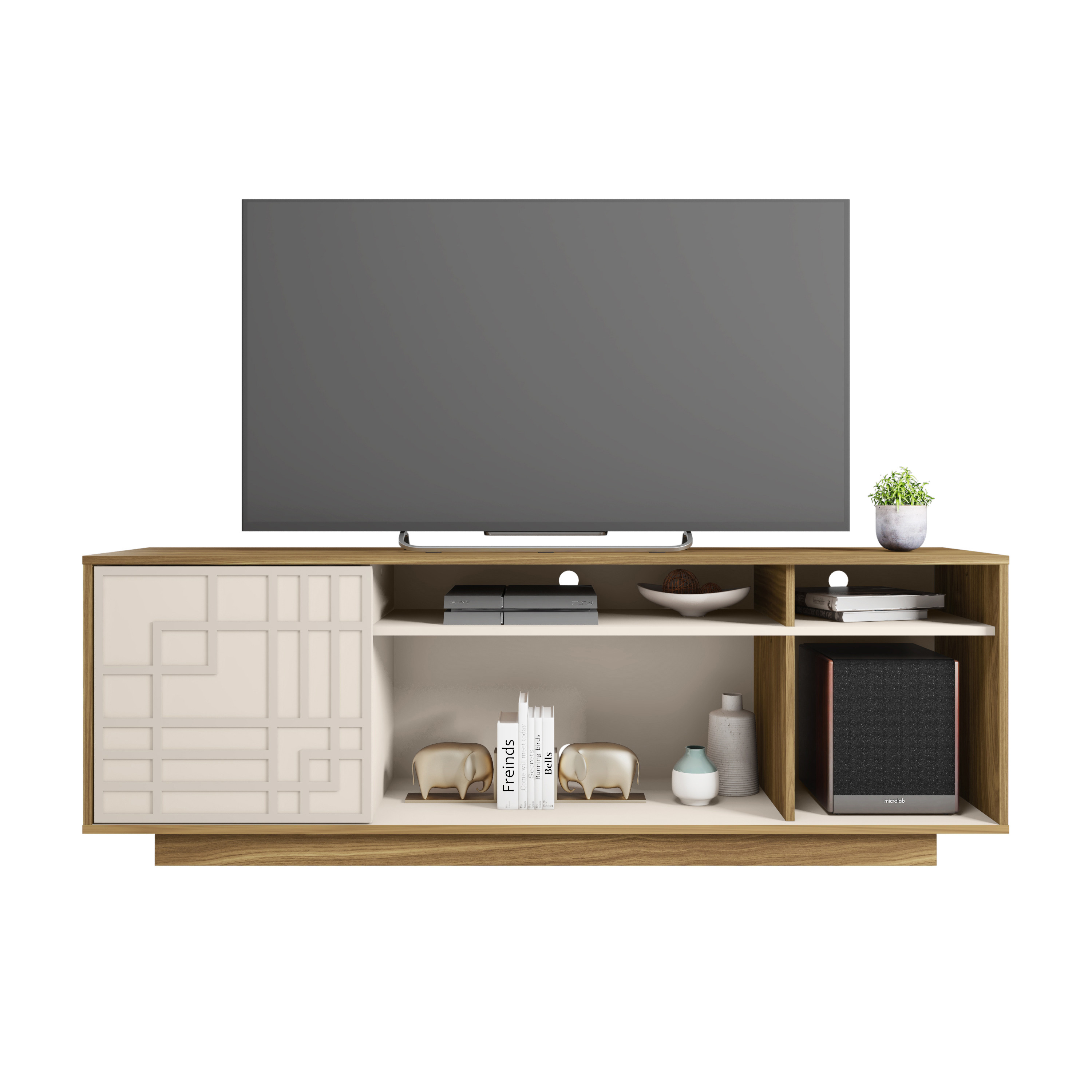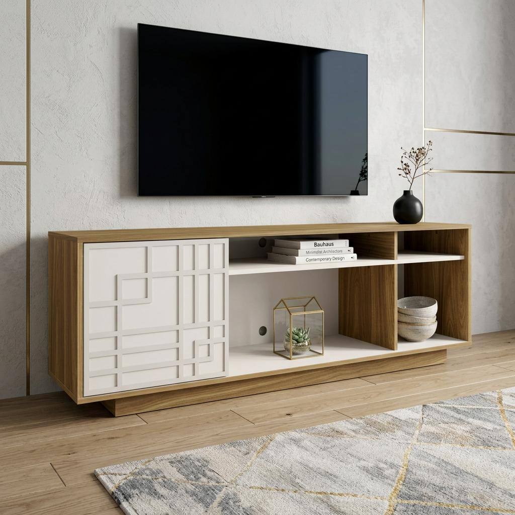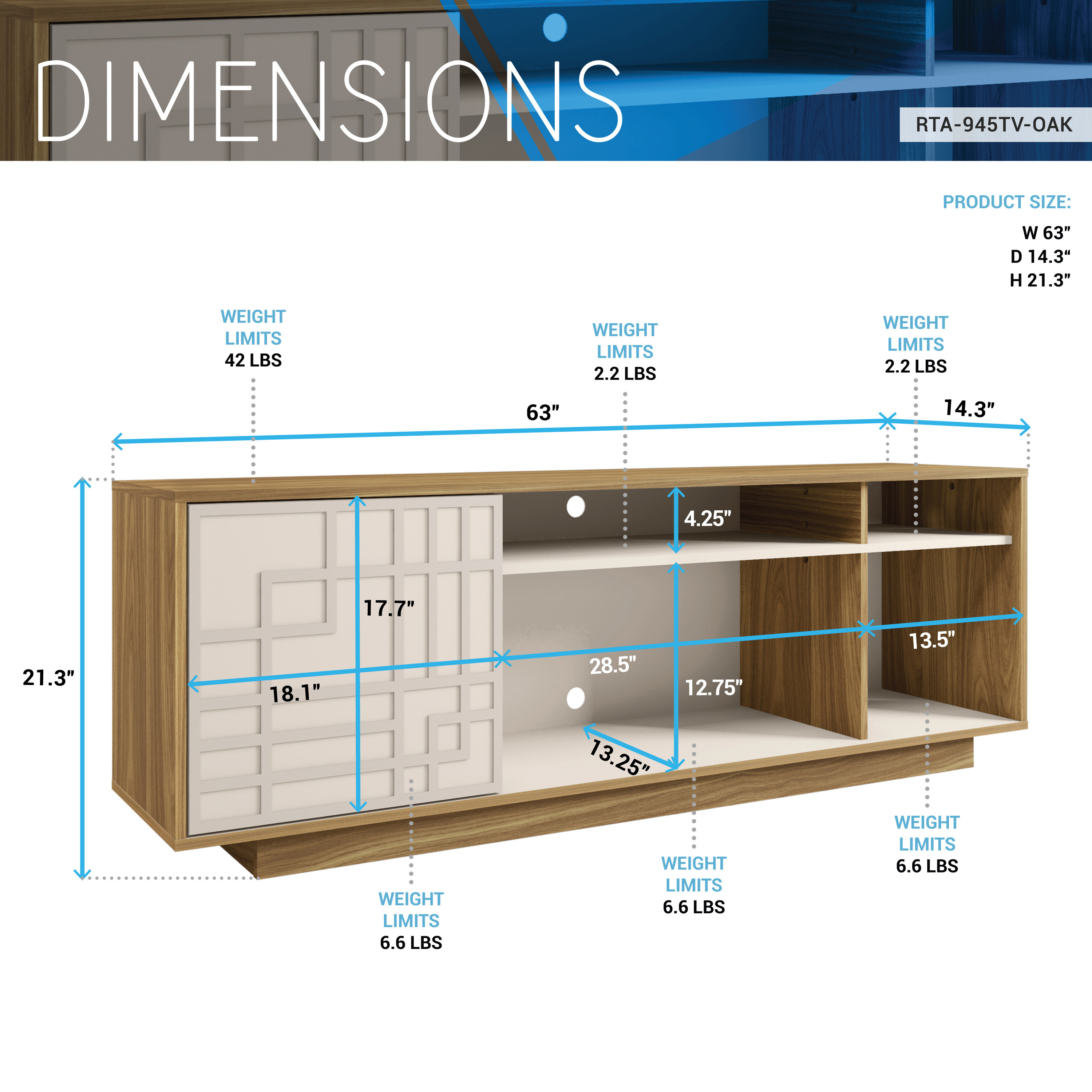 Practical, space saving, and good looking, this 63-inch oak and white carved geometric wood enclosed and open storage tv stand is a versatile media storage solution. Designed to be sturdy and long lasting, this versatile furniture piece is crafted from durable manufactured wood and features a contemporary design style. To add to the versatility, this piece features open non-concealed storage that can be used for not only storage but display as well. A built-in cable and wire management helps to keep those unseemly wires at bay. Convert your room into a special place with your favorite collectibles and tv accessories that is suitable for living room, bedroom, or office. 21.25-inch h x 63.00-inch w x 14.25-inch d.