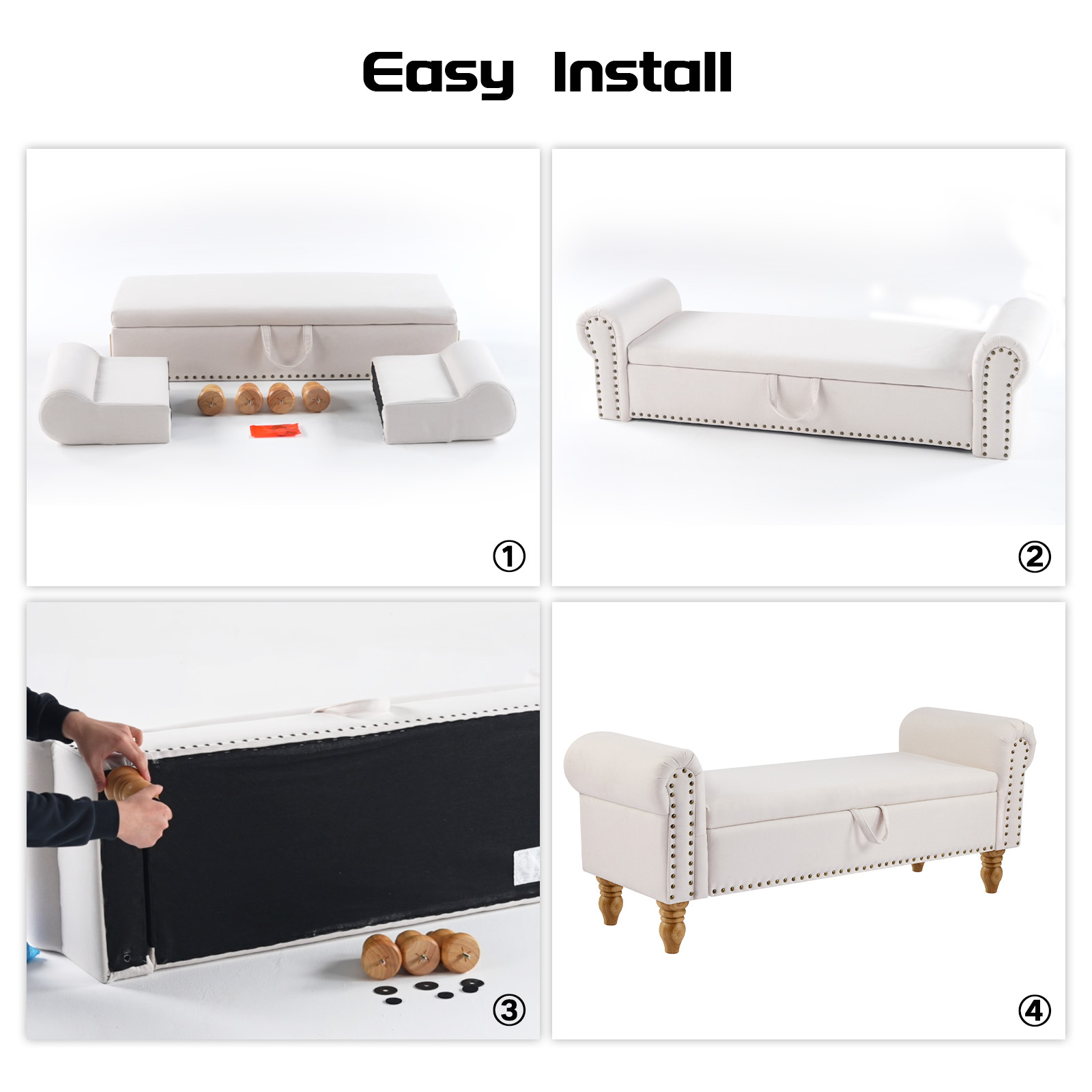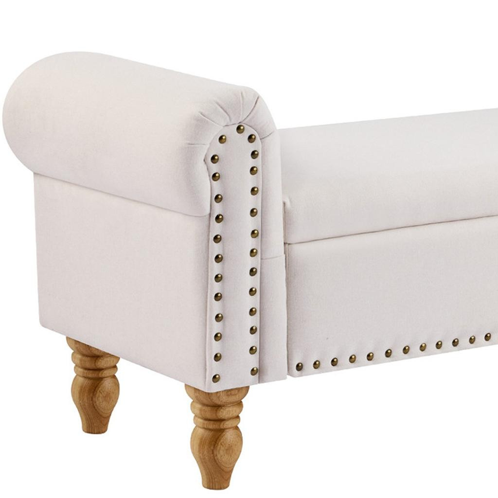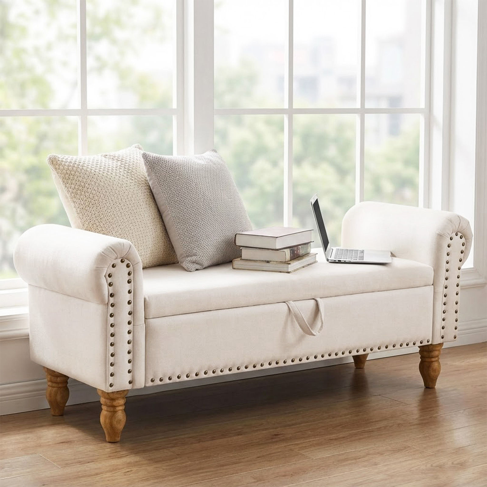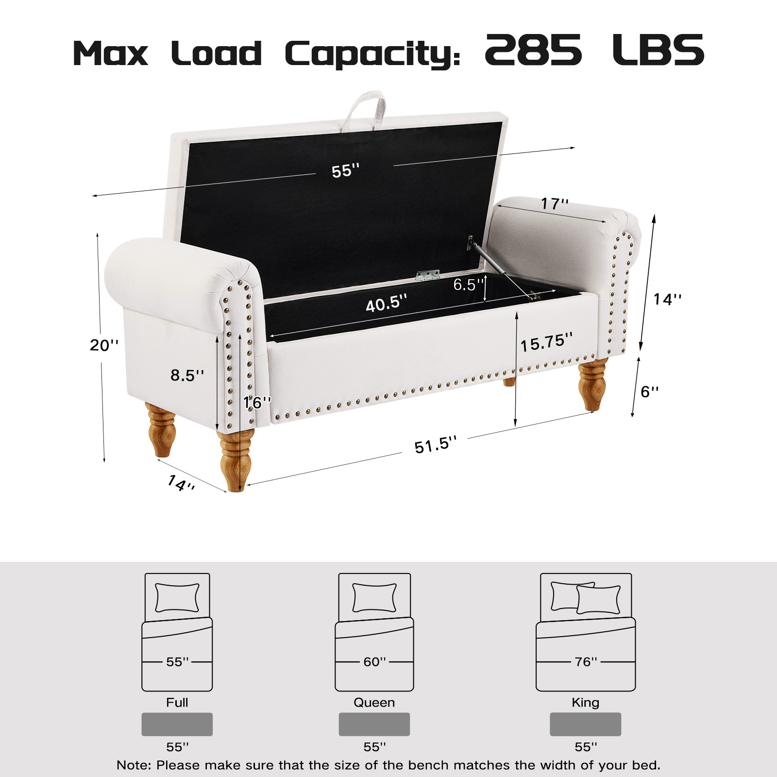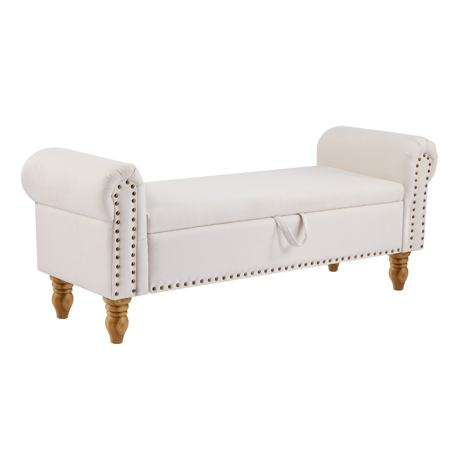Optimize your space and add some charm to your room with the 55-inch beige and brown linen and solid wood upholstered storage bench with flip top. The beige upholstery top of this bench is a nice contrast to the high quality, brown curved solid wood legs. With cozy round arms on either side to add stability and style, this good looking accent is expertly upholstered with padding in a soft solid color linen and accented by nail head trim detailing. A convenient lift up top gives this bench multi-functionality, housing a hidden storage compartment to help keep your space neat and tidy. 20.00-inch h x 55.00-inch w x 17.00-inch d.