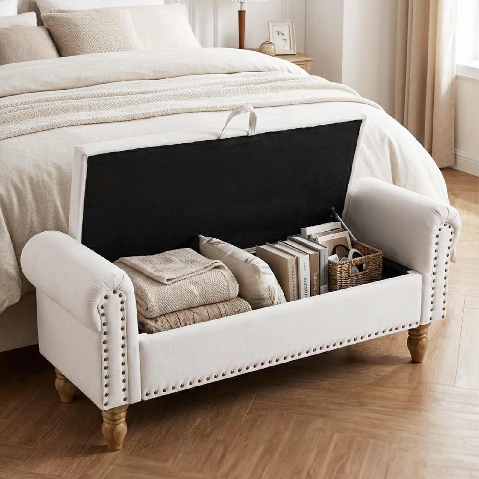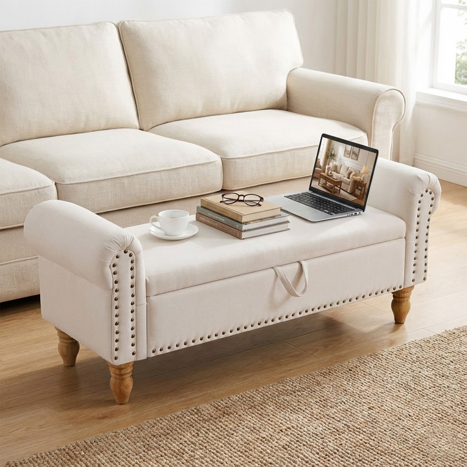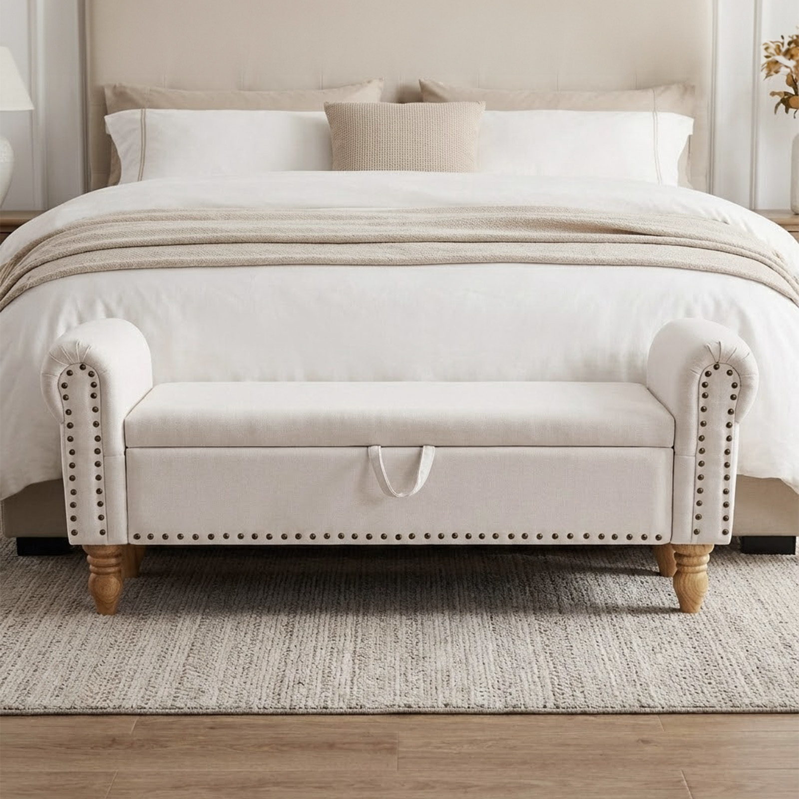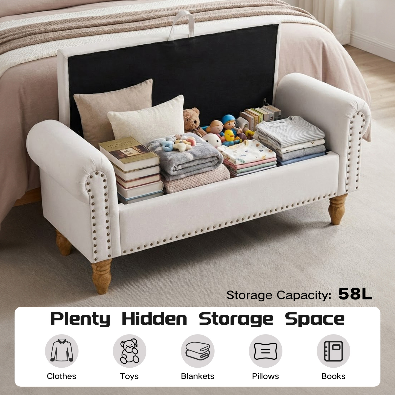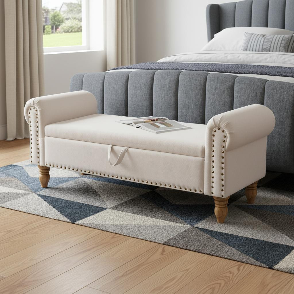 Optimize your space and add some charm to your room with the 55-inch beige and brown linen and solid wood upholstered storage bench with flip top. The beige upholstery top of this bench is a nice contrast to the high quality, brown curved solid wood legs. With cozy round arms on either side to add stability and style, this good looking accent is expertly upholstered with padding in a soft solid color linen and accented by nail head trim detailing. A convenient lift up top gives this bench multi-functionality, housing a hidden storage compartment to help keep your space neat and tidy. 20.00-inch h x 55.00-inch w x 17.00-inch d.
