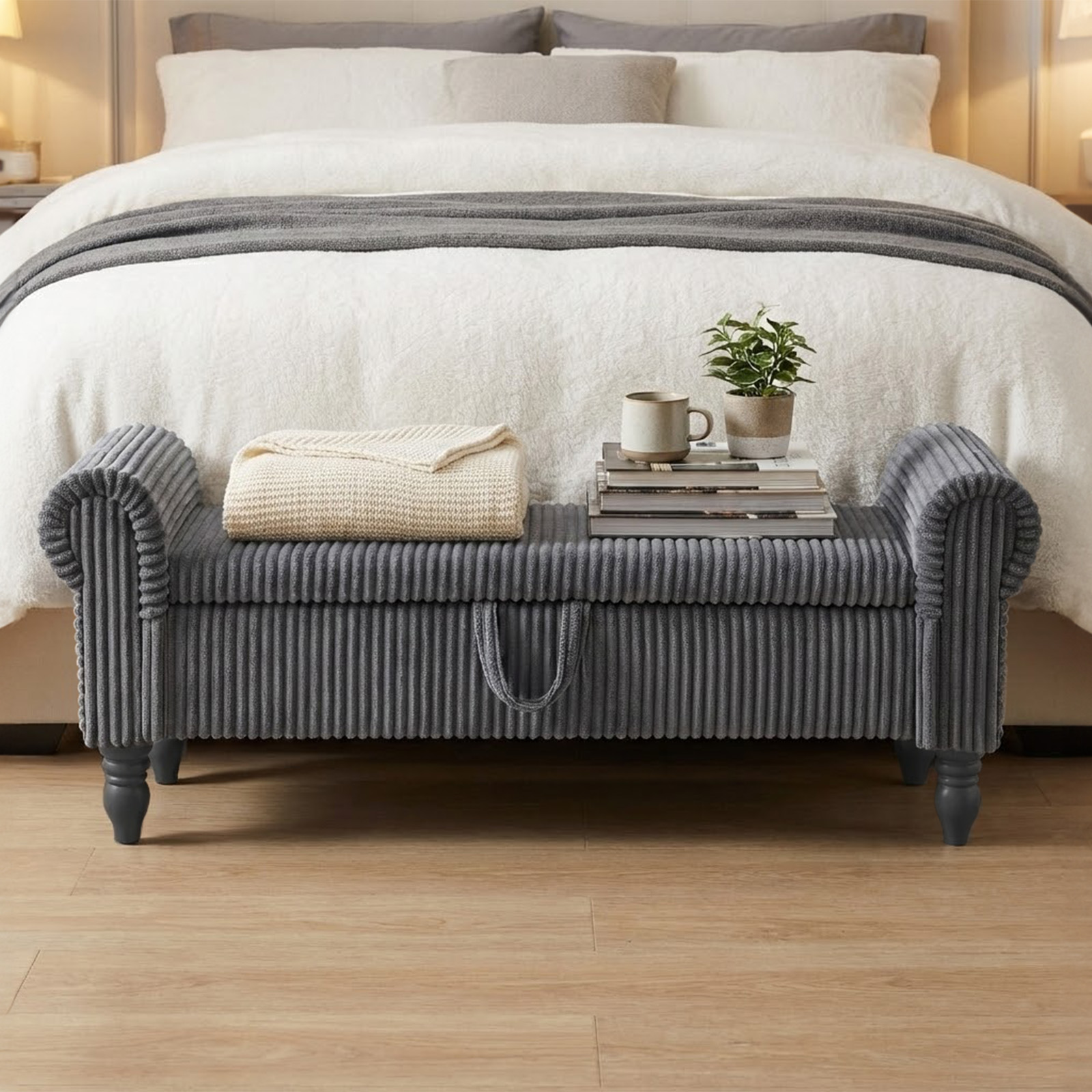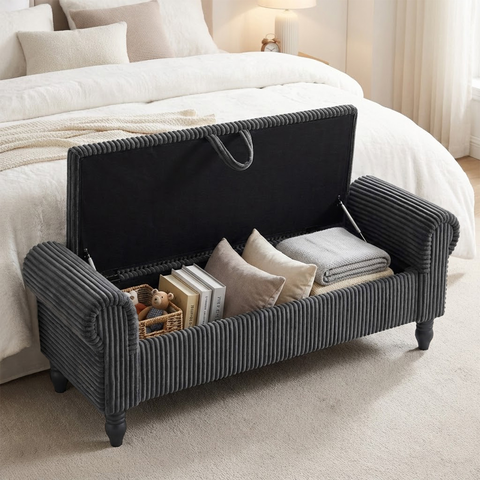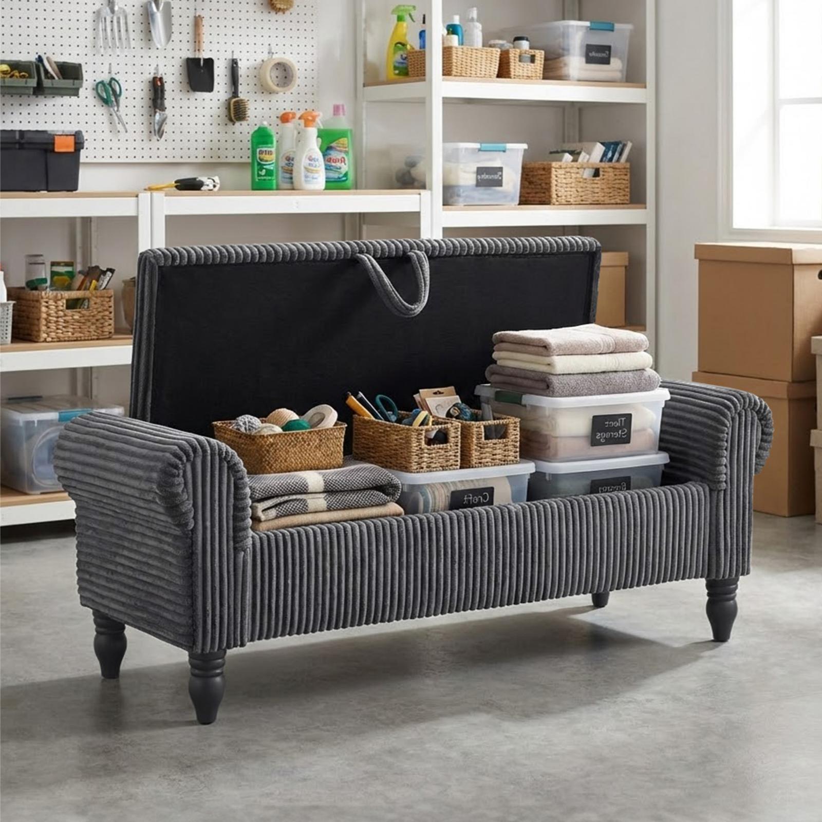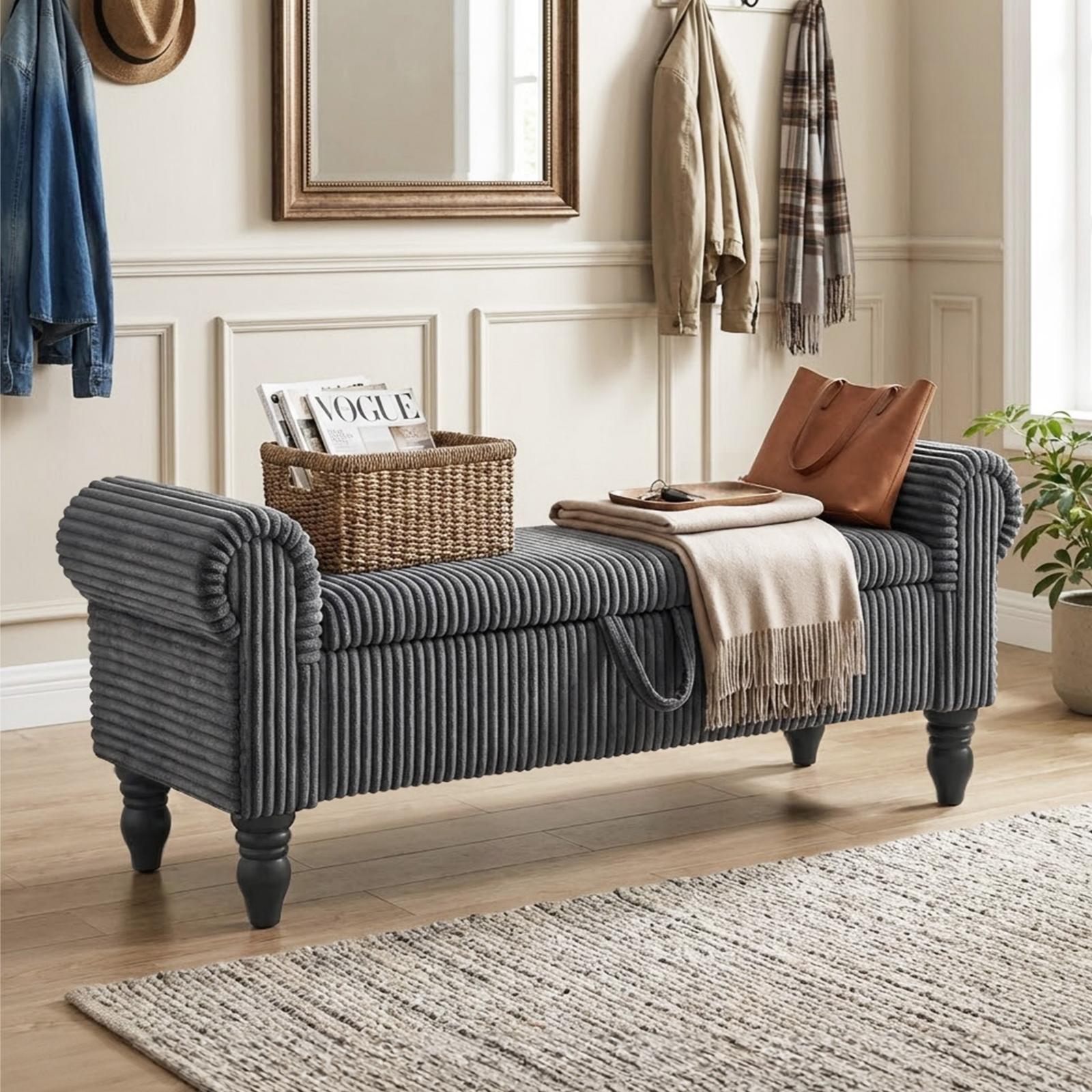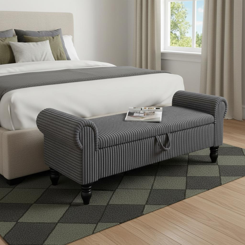 solid wood upholstered storage bench, wood upholstered storage bench, upholstered storage bench, gray corduroy solid wood upholstered, wood upholstered storage bench flip |
