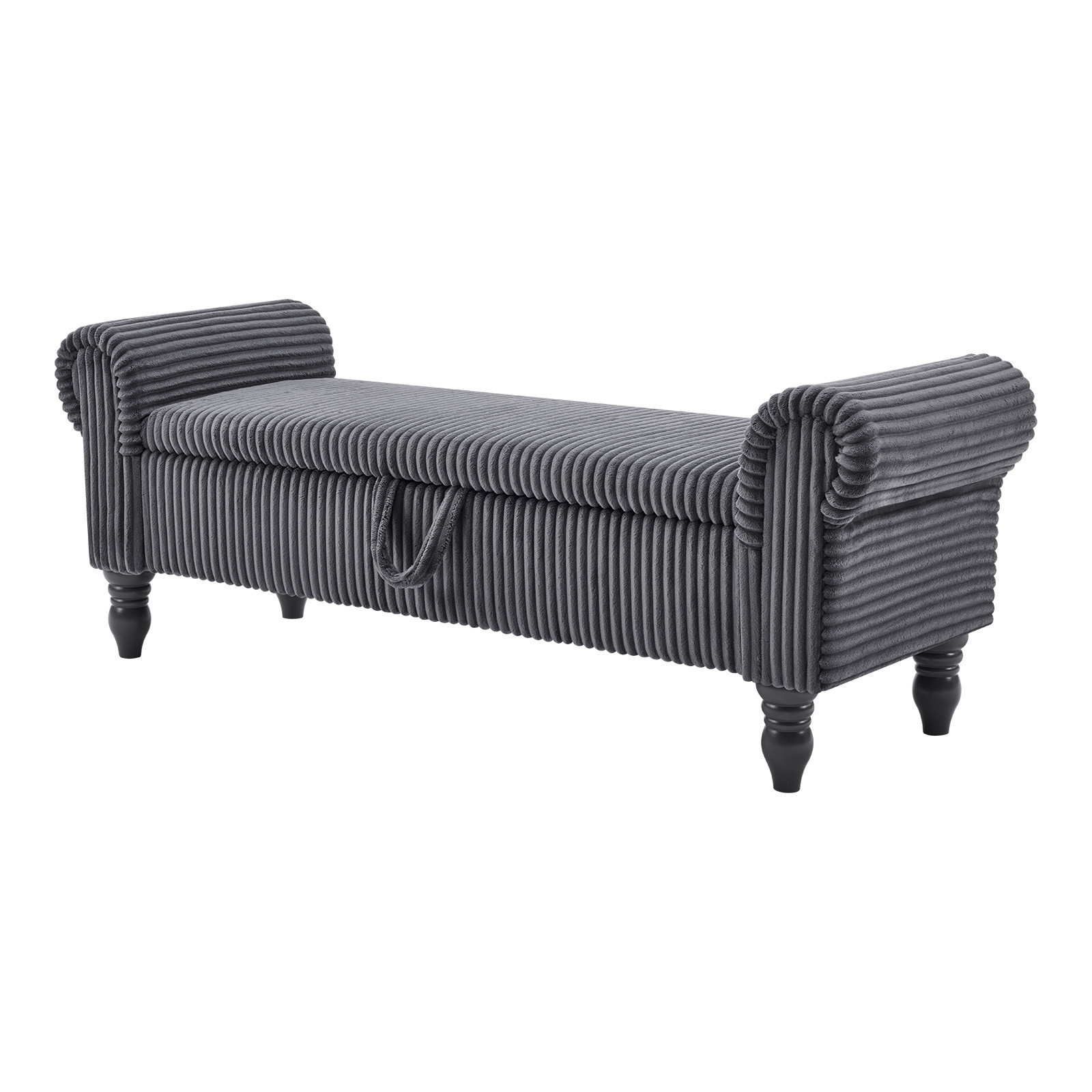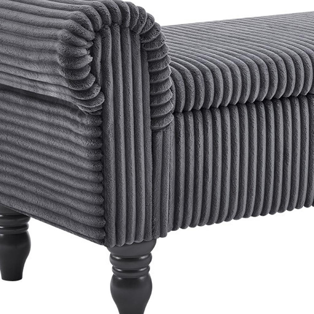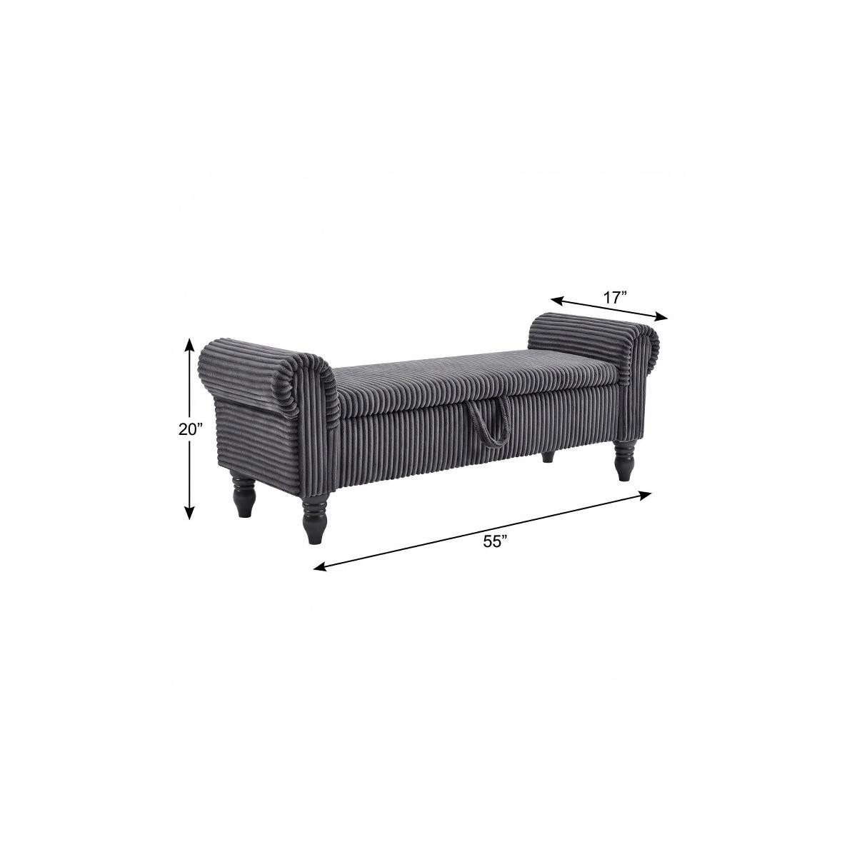 Add a good looking decorative accent to your space that is also practical for seating. The gray upholstery top of this bench creates a modern chic color combination with the high quality, black curved solid wood legs. With cozy round arms on either side to add stability and style, this good looking accent is expertly upholstered with padding in a soft faux fur corduroy that adds some supreme texture and modern style to your space. A convenient lift up top gives this bench multi-functionality, housing a hidden storage compartment to help keep your space neat and tidy. 20.00-inch h x 55.00-inch w x 17.00-inch d.