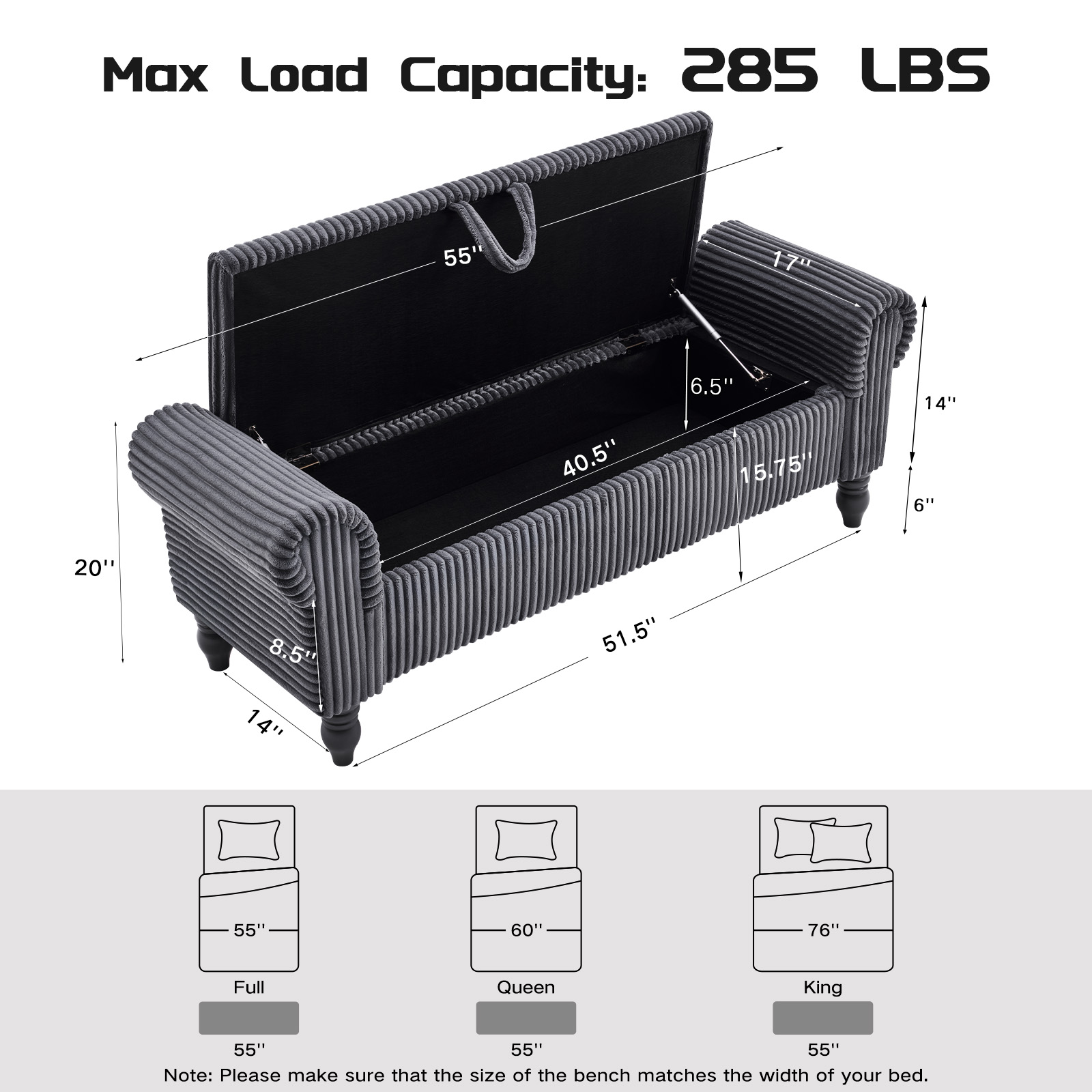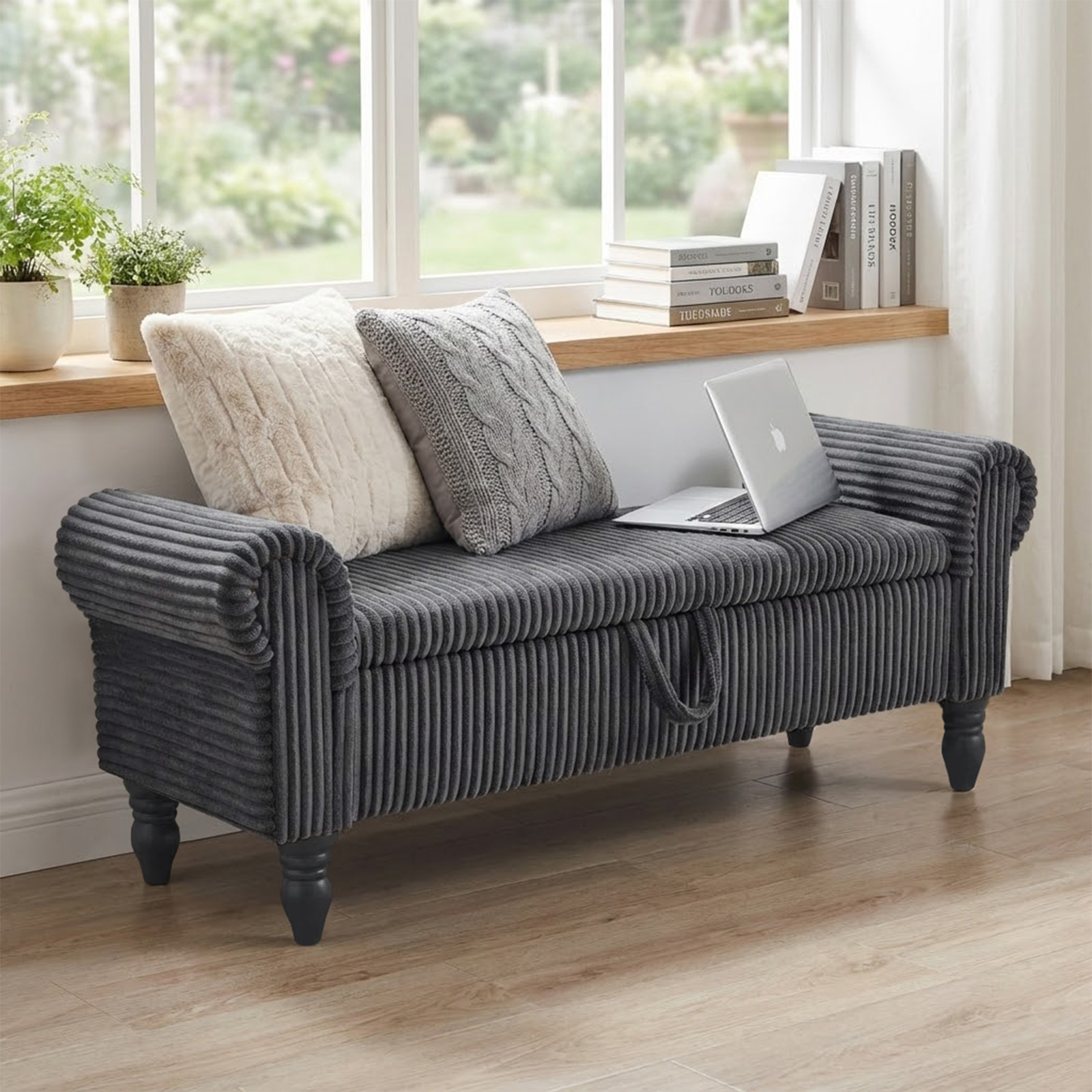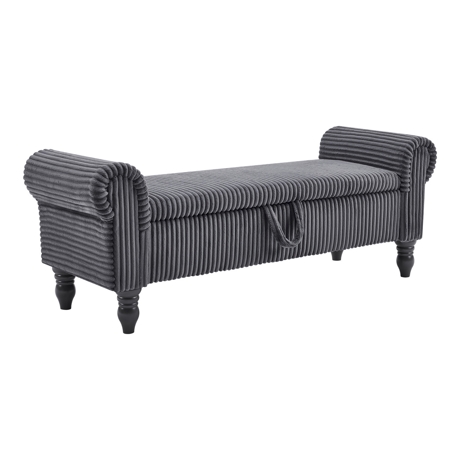 Add a good looking decorative accent to your space that is also practical for seating. The gray upholstery top of this bench creates a modern chic color combination with the high quality, black curved solid wood legs. With cozy round arms on either side to add stability and style, this good looking accent is expertly upholstered with padding in a soft faux fur corduroy that adds some supreme texture and modern style to your space. A convenient lift up top gives this bench multi-functionality, housing a hidden storage compartment to help keep your space neat and tidy. 20.00-inch h x 55.00-inch w x 17.00-inch d.