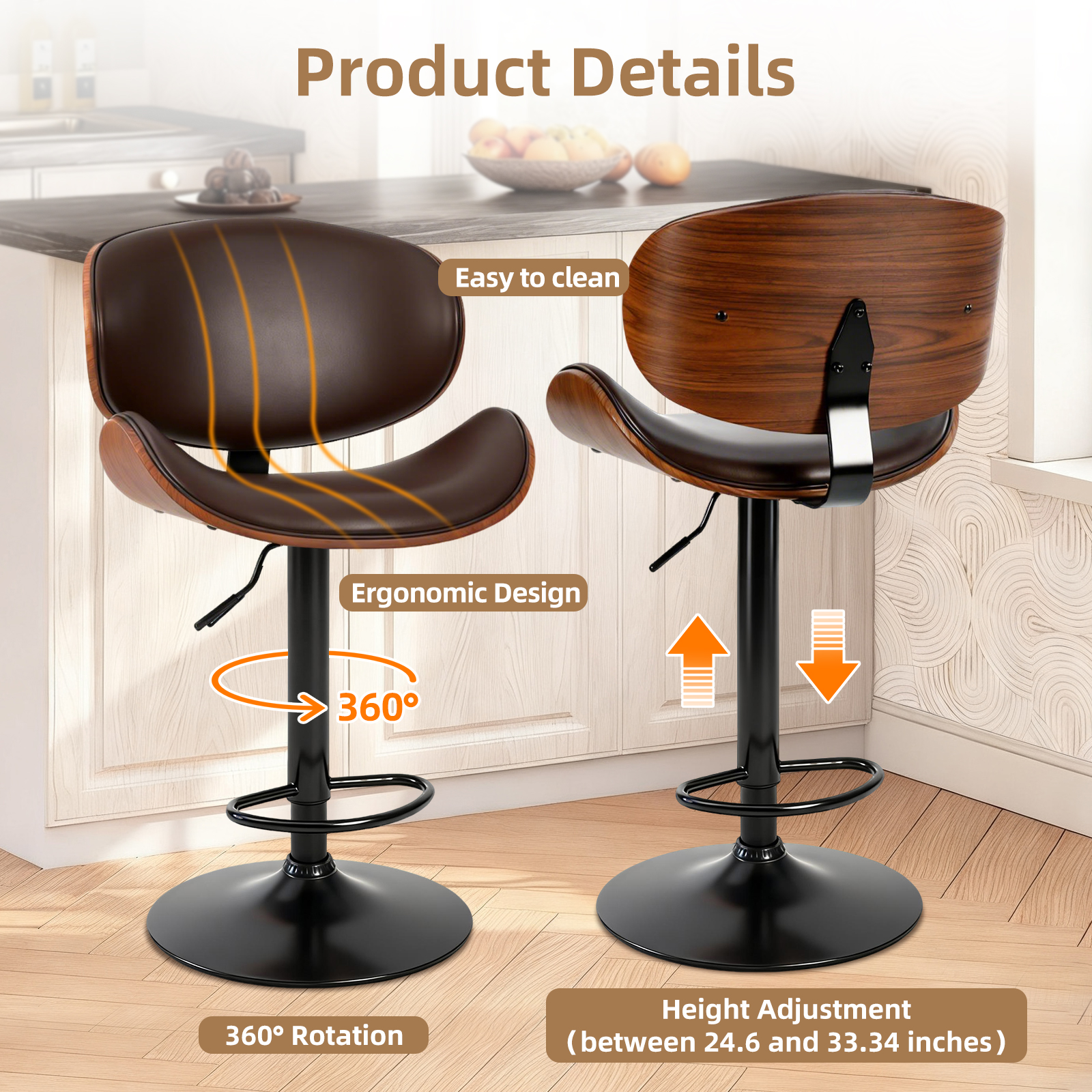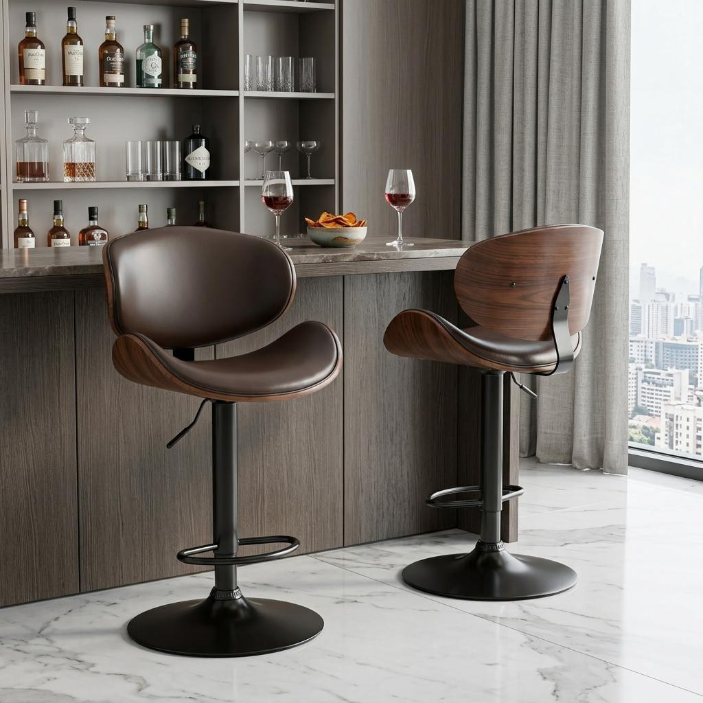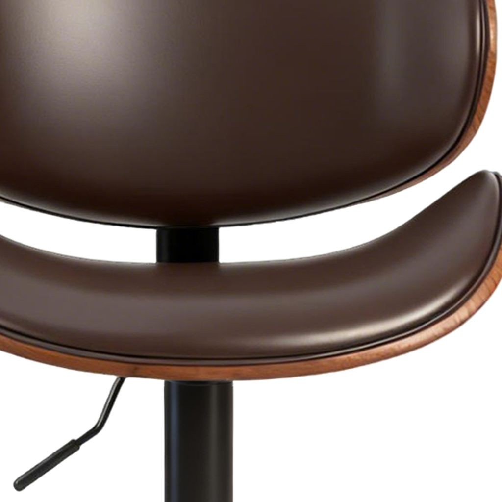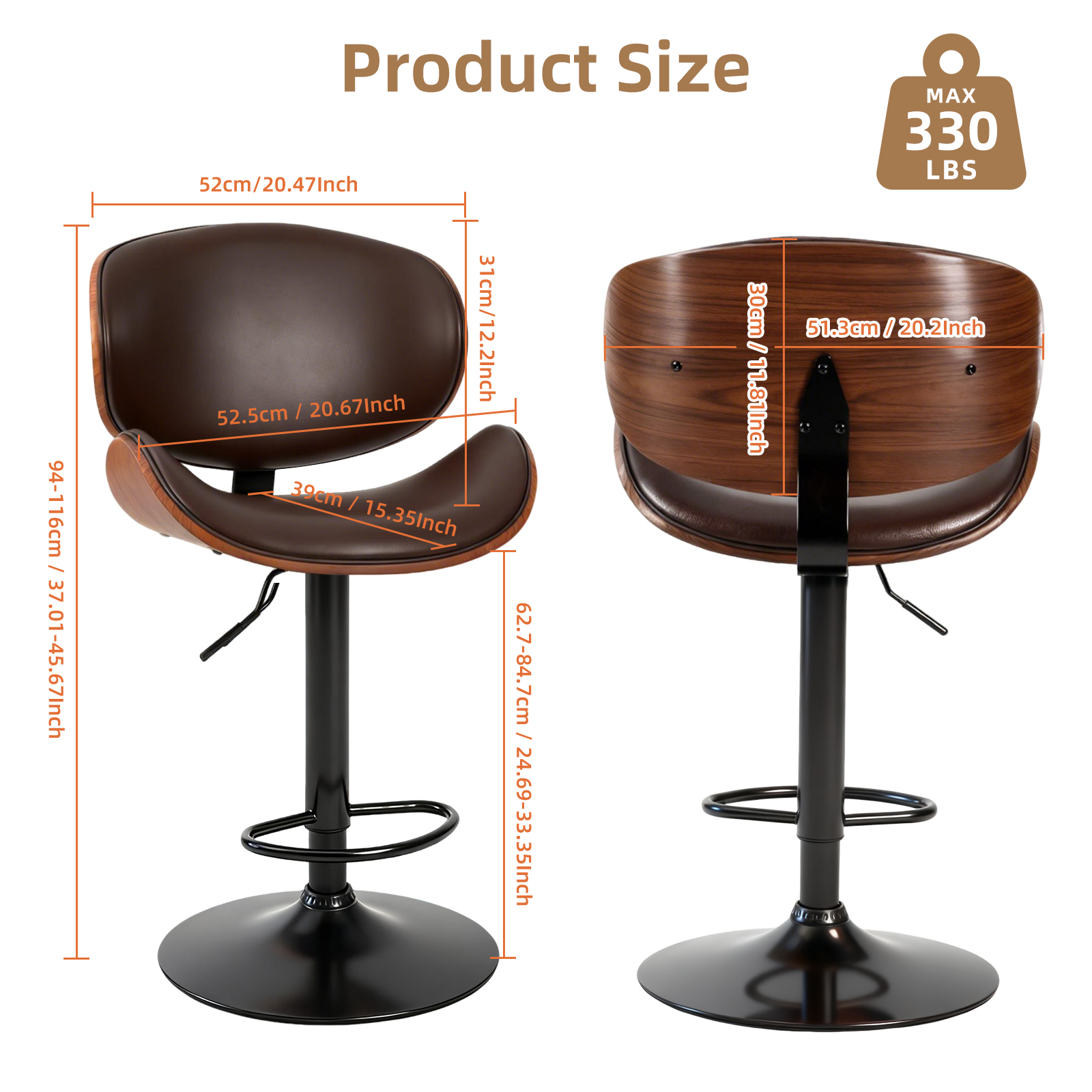 Bring a trendy bar vibe to your space, with this set of two brown and black fabric faux leather and aluminum swivel bar chairs. The bucket seat design offers comfort while providing full back support for relaxation during social gatherings. With an adjustable height feature, these tall bar chairs can easily accommodate various counter heights. Their modern style, complemented by the sleek black aluminum frame, enhances any contemporary interior, making it a perfect choice for your home or entertainment area. 45.67-inch h x 20.67-inch w x 20.47-inch d.