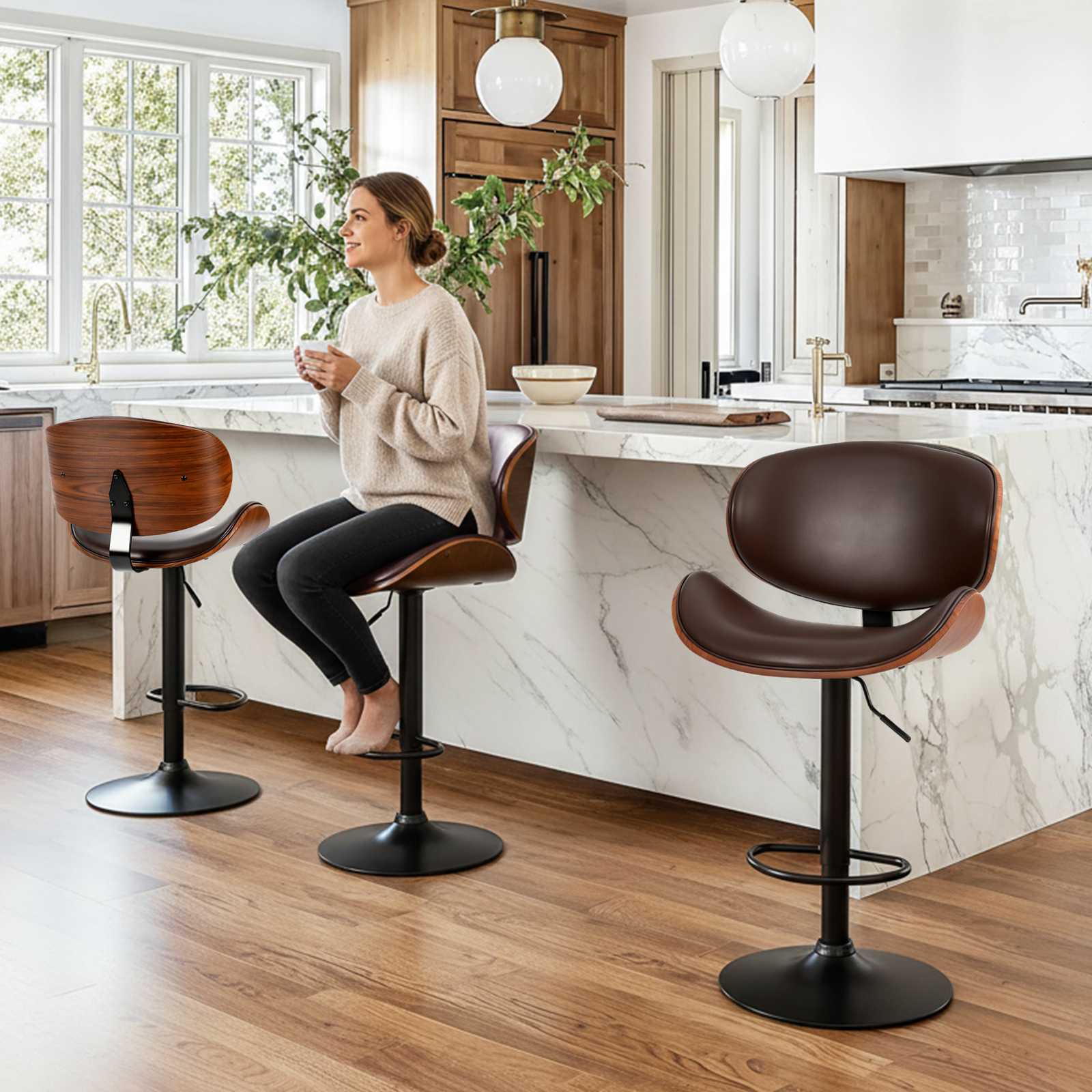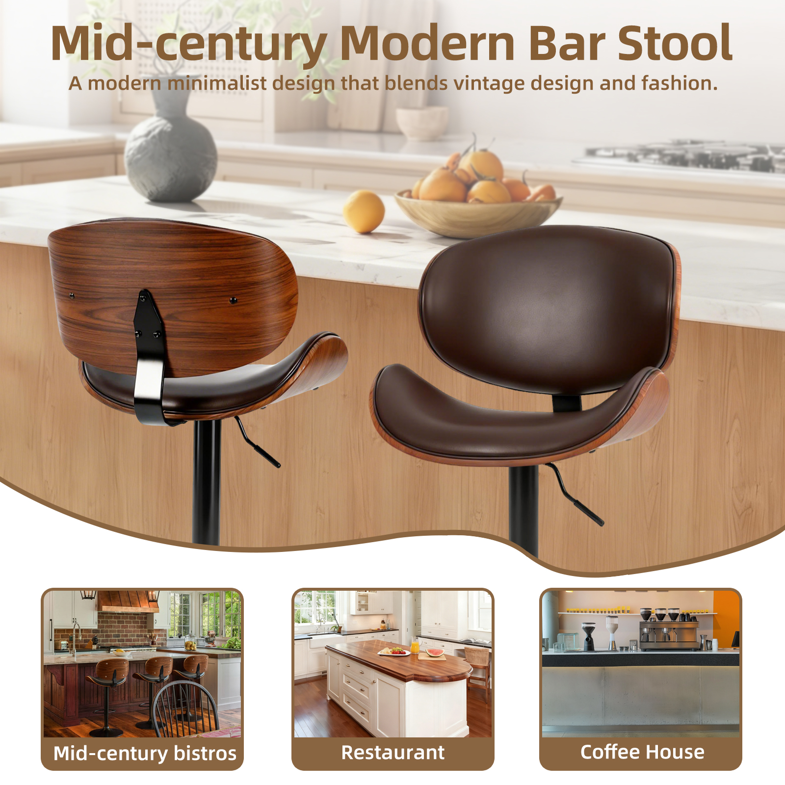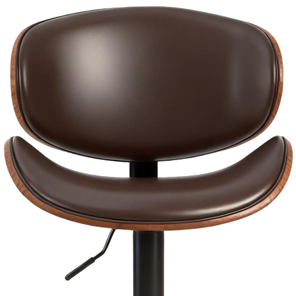 Bring a trendy bar vibe to your space, with this set of two brown and black fabric faux leather and aluminum swivel bar chairs. The bucket seat design offers comfort while providing full back support for relaxation during social gatherings. With an adjustable height feature, these tall bar chairs can easily accommodate various counter heights. Their modern style, complemented by the sleek black aluminum frame, enhances any contemporary interior, making it a perfect choice for your home or entertainment area. 45.67-inch h x 20.67-inch w x 20.47-inch d.