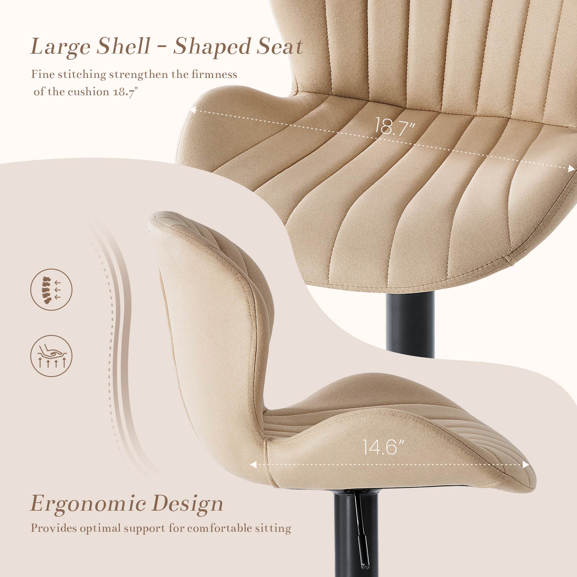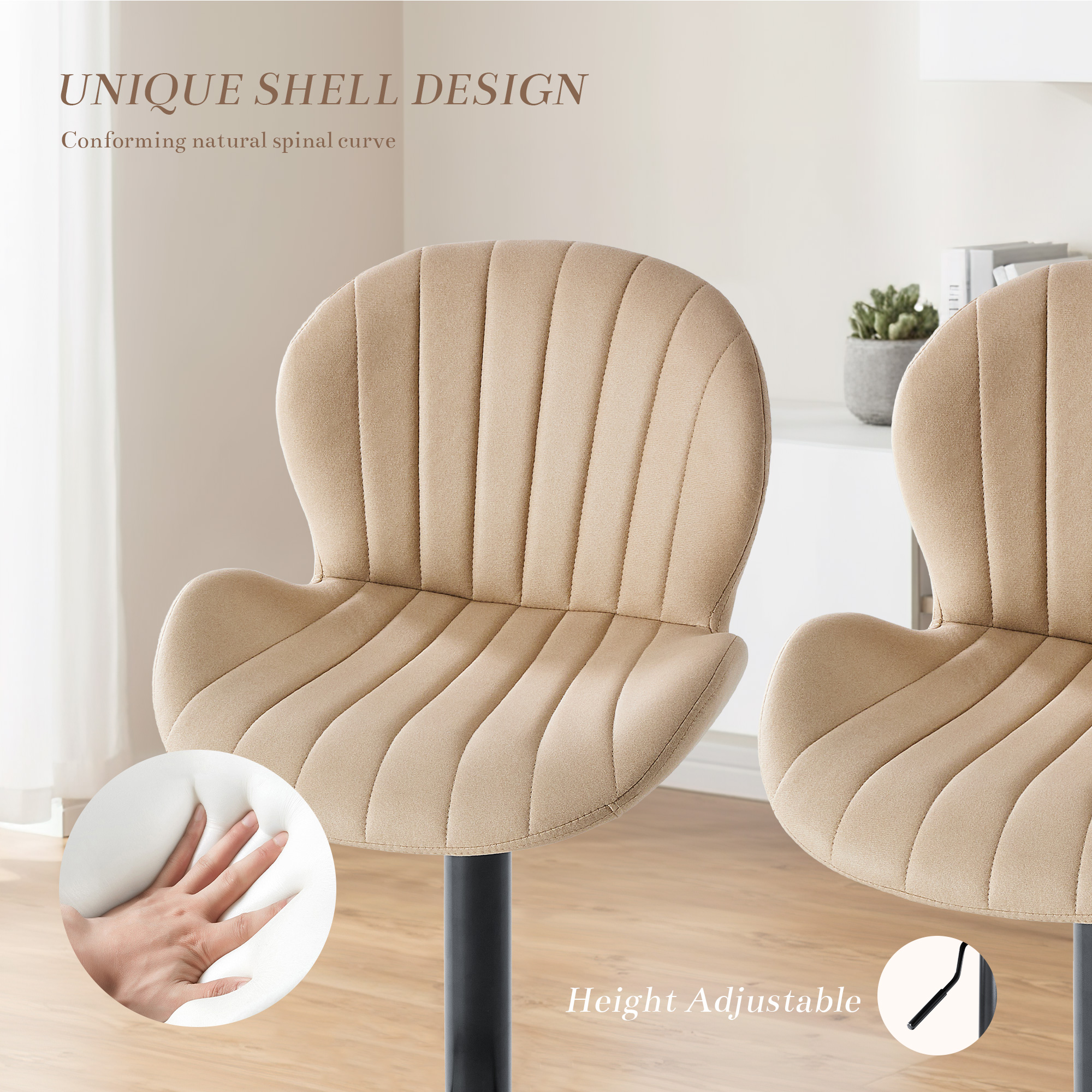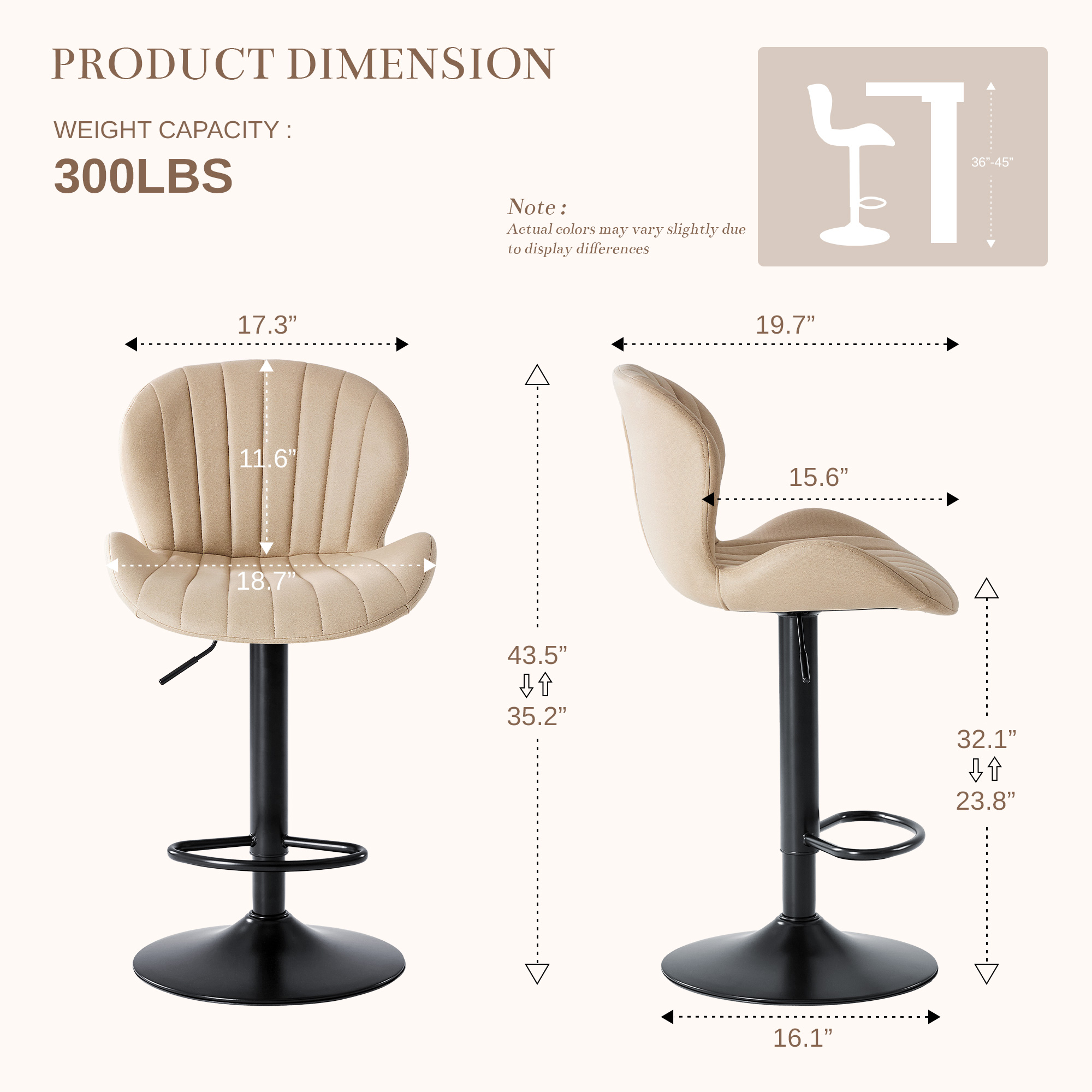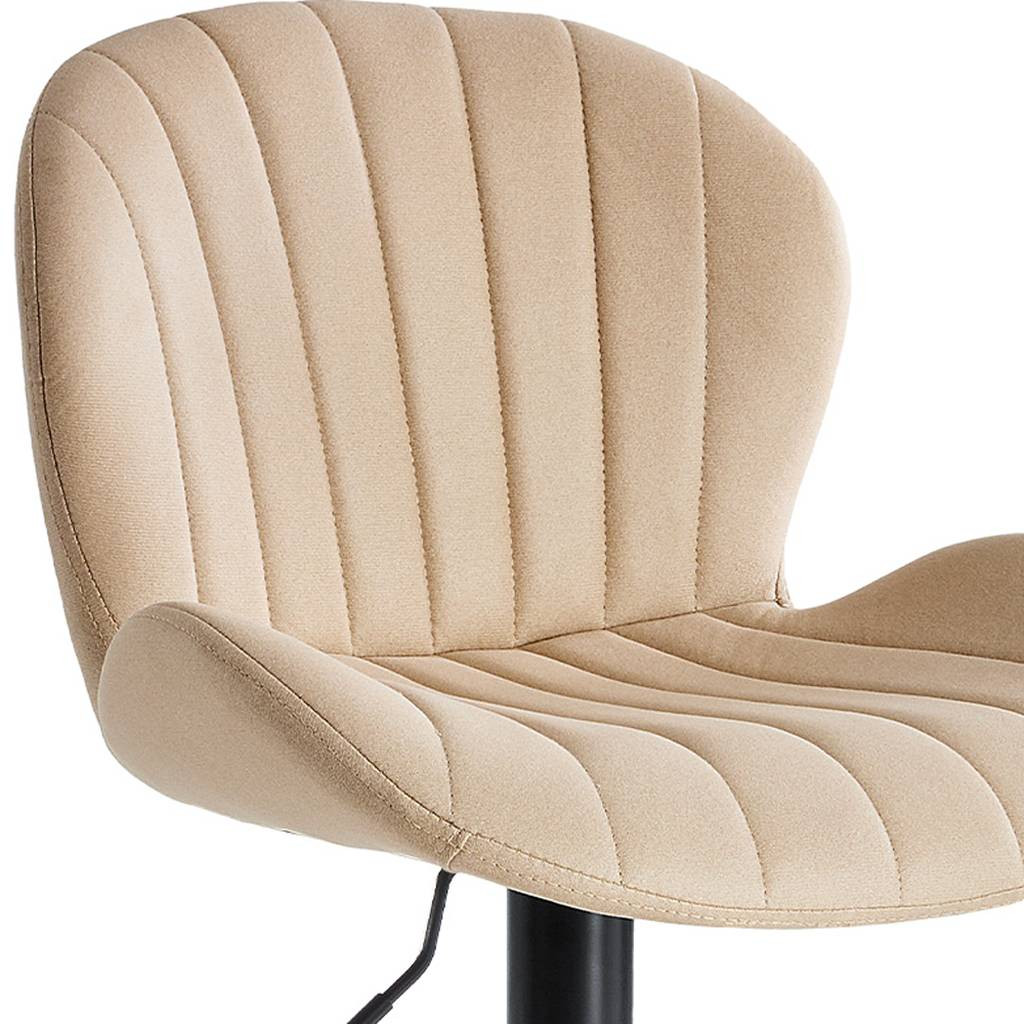 The perfect way to add some extra seating in your home, this set of two beige and black faux leather and aluminum adjustable height swivel bar chairs will elevate the look and vibe of your room. Designed with a modern flair, these chairs feature a comfortable bucket seat style that provides excellent support. The full back design ensures maximum comfort for extended use, while the adjustable height feature allows you to customize the seating to your preference. With a sleek black aluminum frame, these chairs are not only durable but also add an elegant touch to any decor. 43.50-inch h x 18.70-inch w x 19.69-inch d.