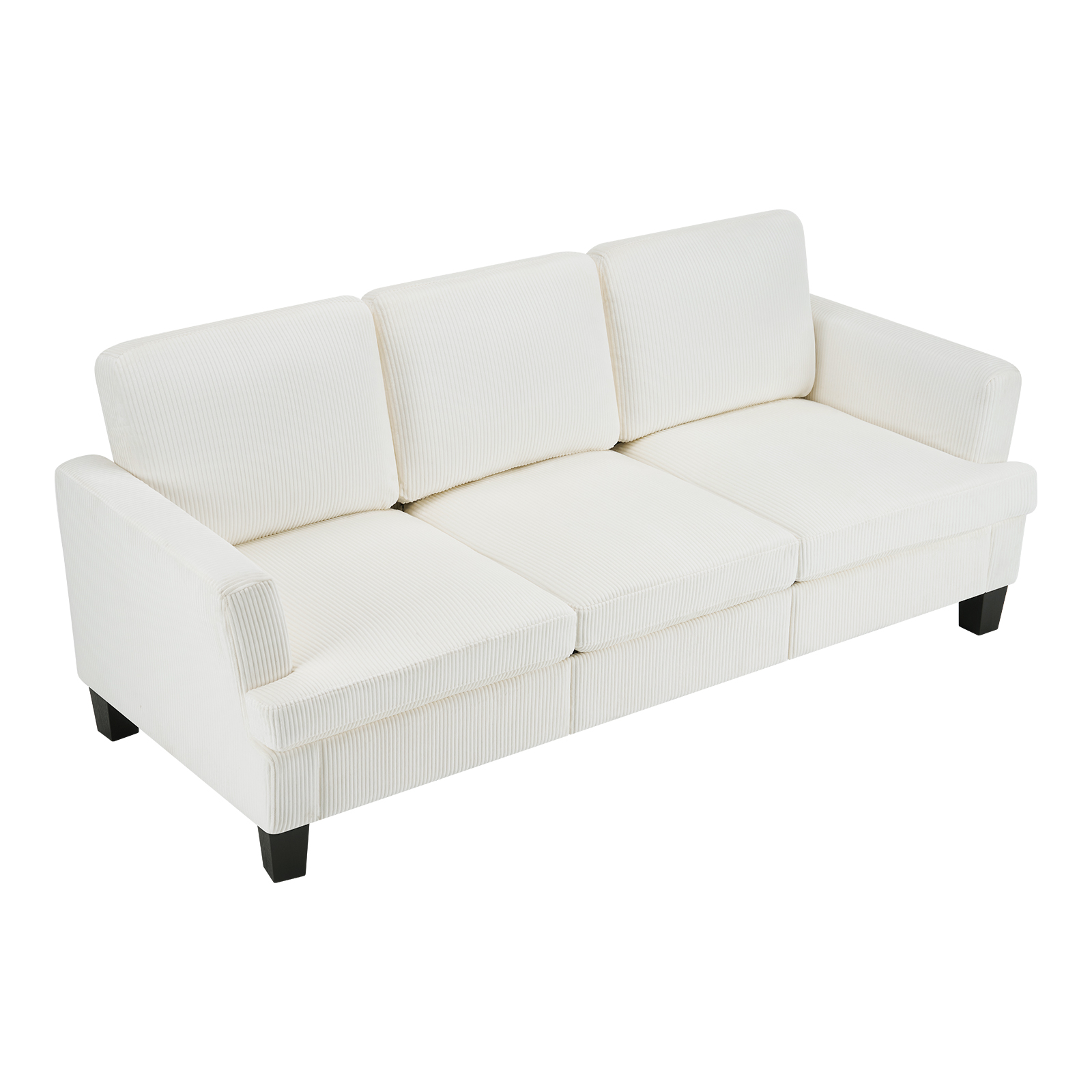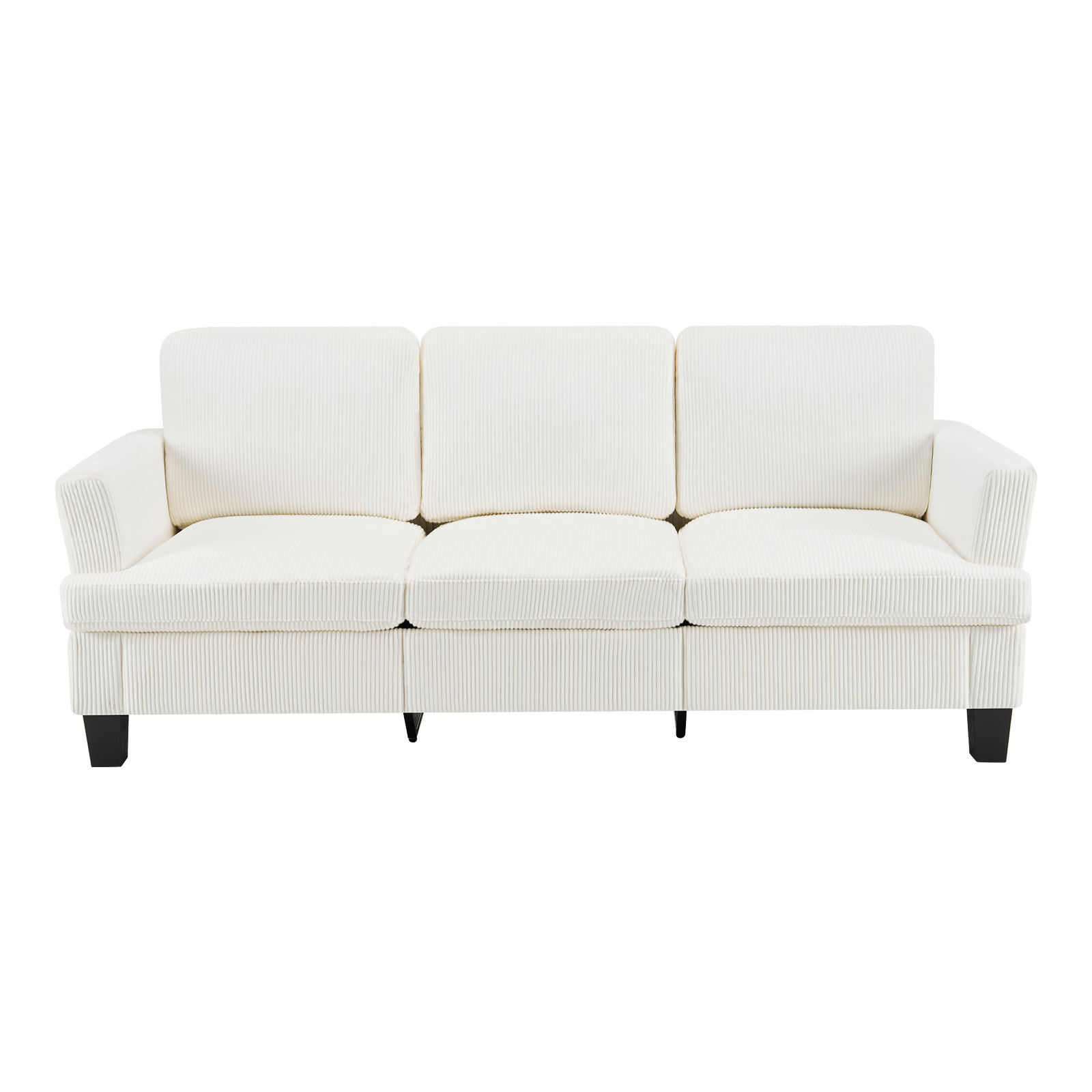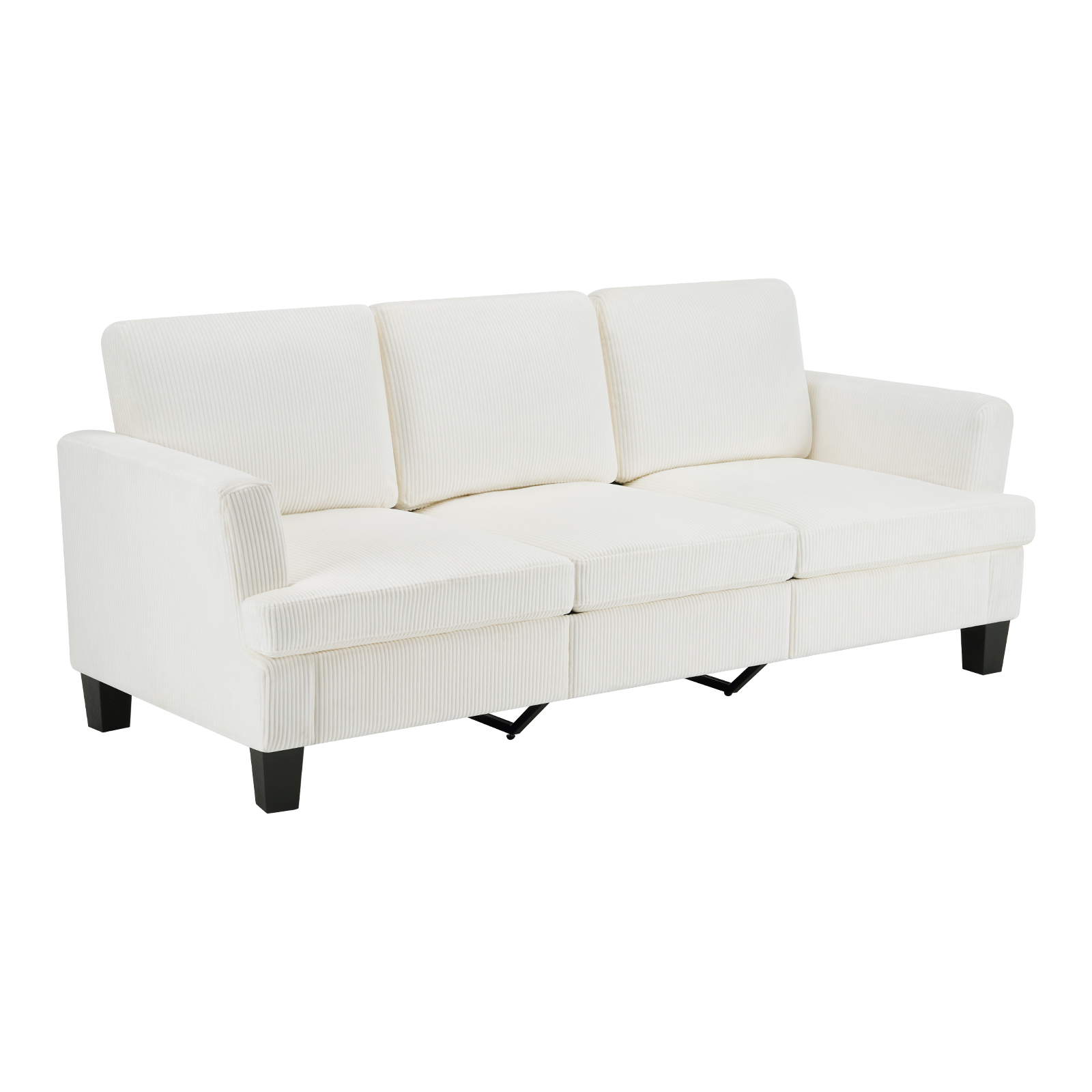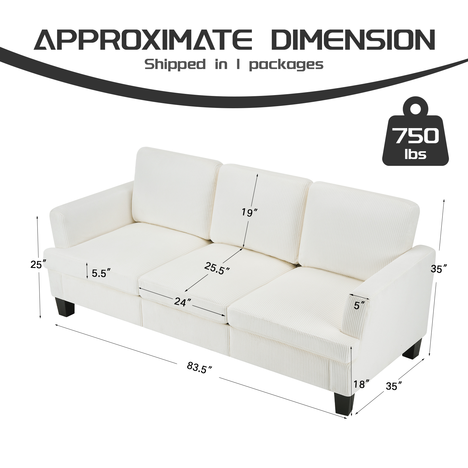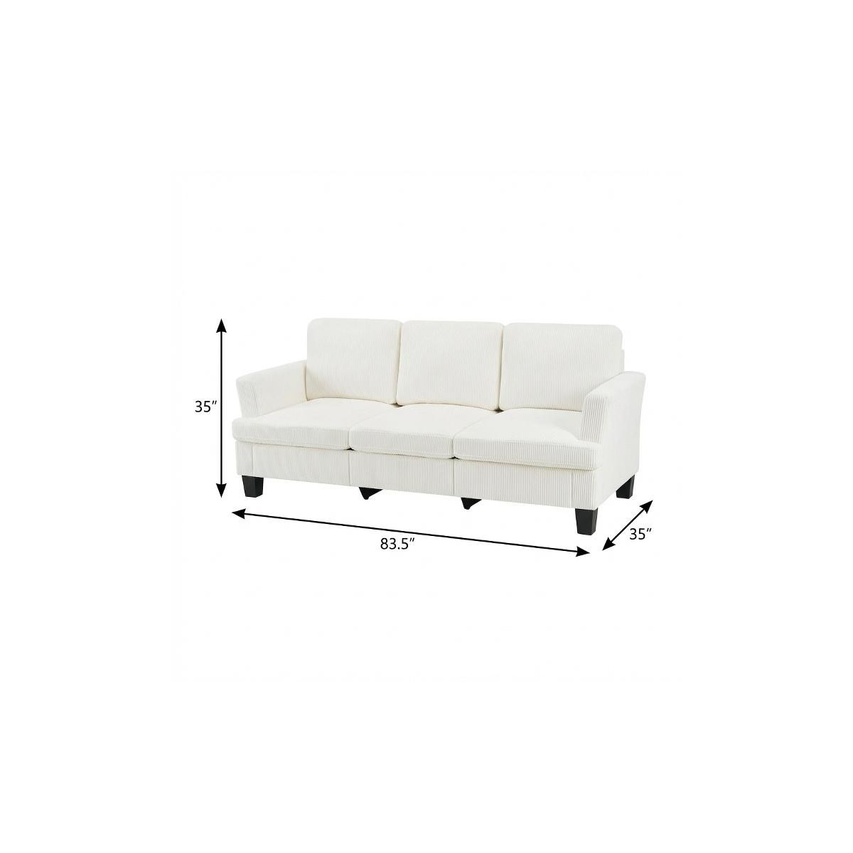 The 84-inch white corduroy sofa brings an elegant touch to any living space. This stylish three seat sofa is upholstered with ribbed textural corduroy that is unique and gives this piece some special flair. Ergonomically designed with a cushion supportive backrest and comfortable arms, this sofa is a great showpiece for your room. Ideal for entertaining or everyday rest and relaxation, in your living room, office, bedroom, or lounge. Elevate your home decor with a blend of sophistication and comfort found in this exquisite sofa. 35.00-inch h x 83.50-inch w x 35.00-inch d.