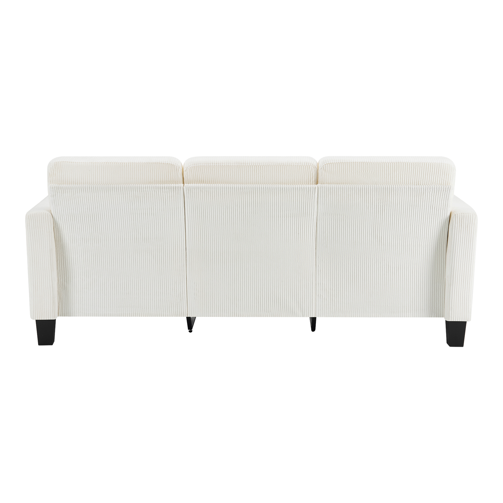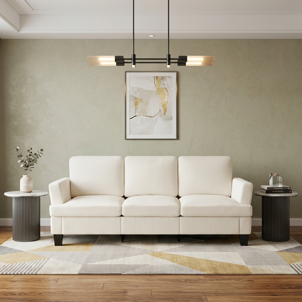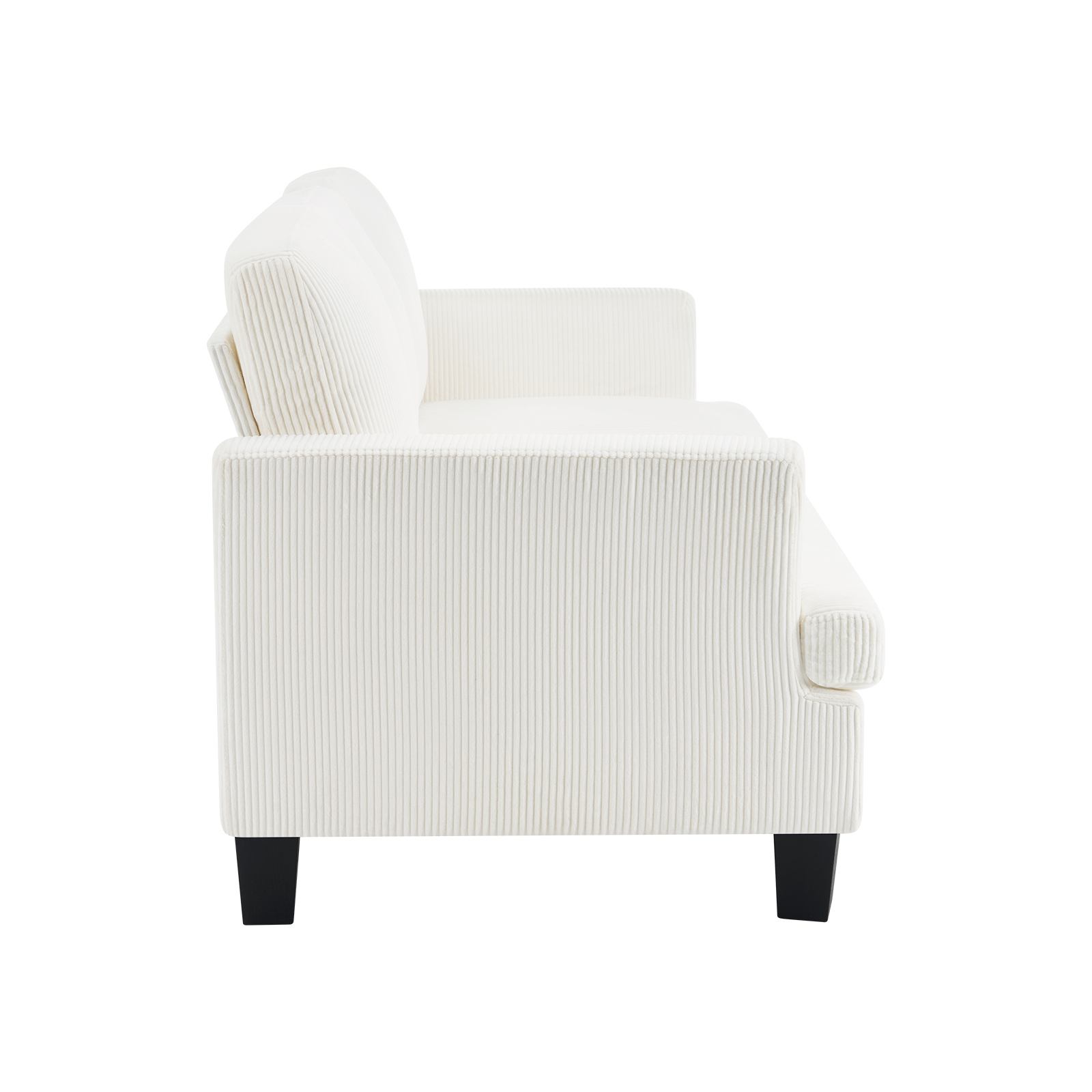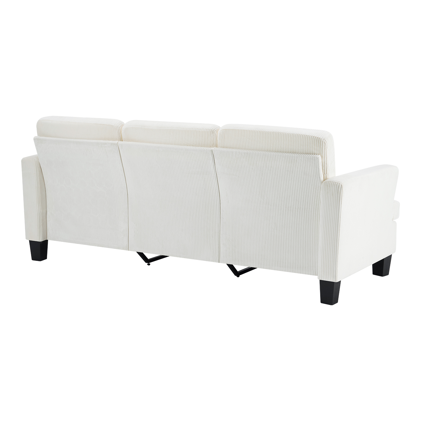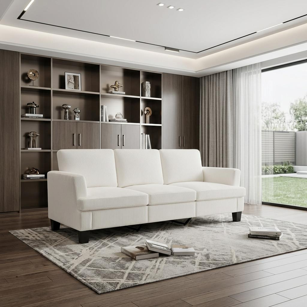The 84-inch white corduroy sofa brings an elegant touch to any living space. This stylish three seat sofa is upholstered with ribbed textural corduroy that is unique and gives this piece some special flair. Ergonomically designed with a cushion supportive backrest and comfortable arms, this sofa is a great showpiece for your room. Ideal for entertaining or everyday rest and relaxation, in your living room, office, bedroom, or lounge. Elevate your home decor with a blend of sophistication and comfort found in this exquisite sofa. 35.00-inch h x 83.50-inch w x 35.00-inch d.
