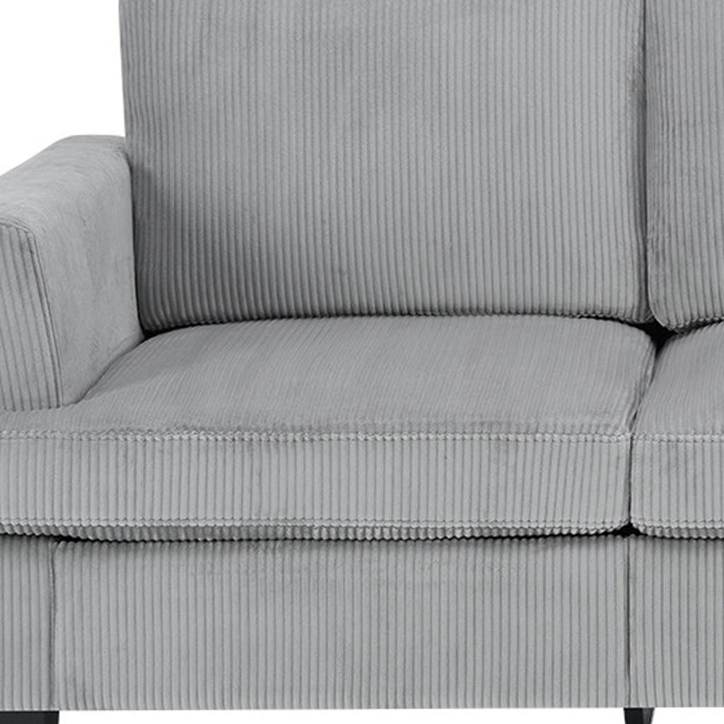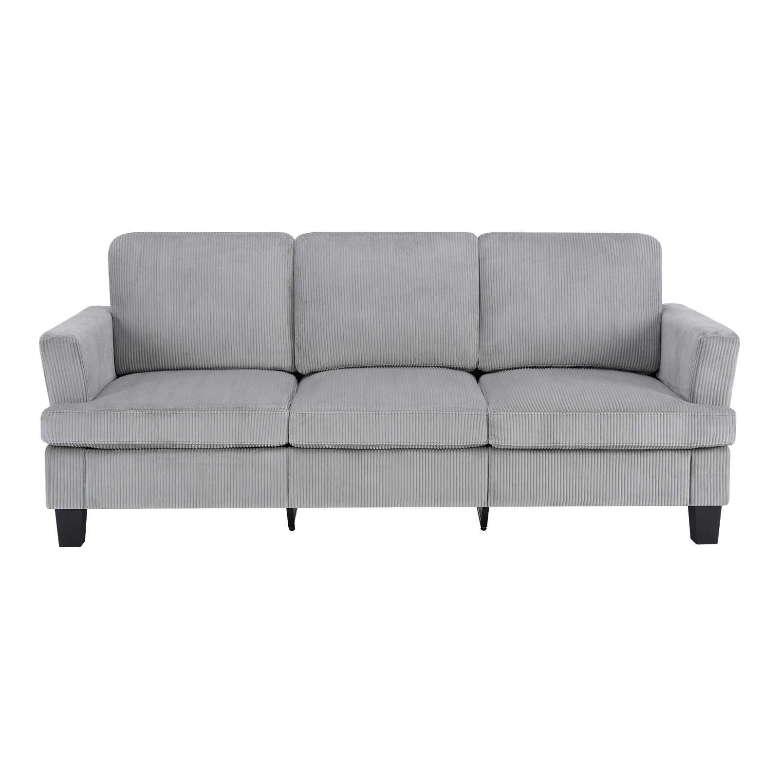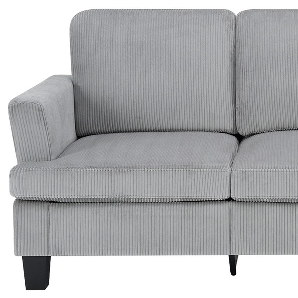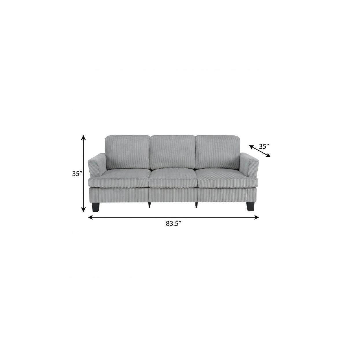 The 84-inch gray corduroy sofa redefines comfort and style in any living space. This stylish three seat sofa is upholstered with ribbed textural corduroy that is unique and gives this piece some special flair. Ergonomically designed with a cushioned, supportive backrest and comfortable arms, this sofa is a great showpiece for your room. Ideal for entertaining or everyday rest and relaxation, in your living room, office, bedroom, or lounge. Embrace both functionality and elegance with this chic addition to your home. 35.00-inch h x 83.50-inch w x 35.00-inch d.