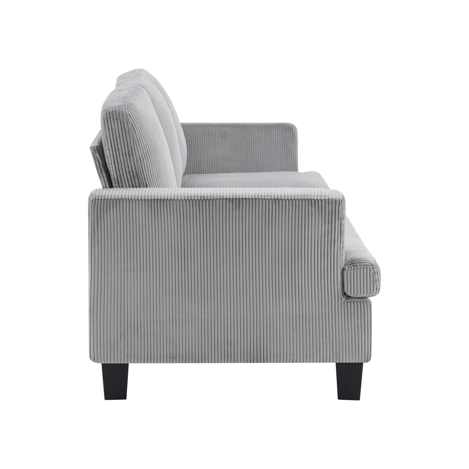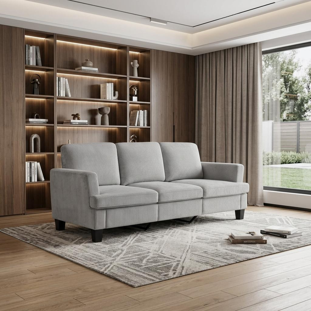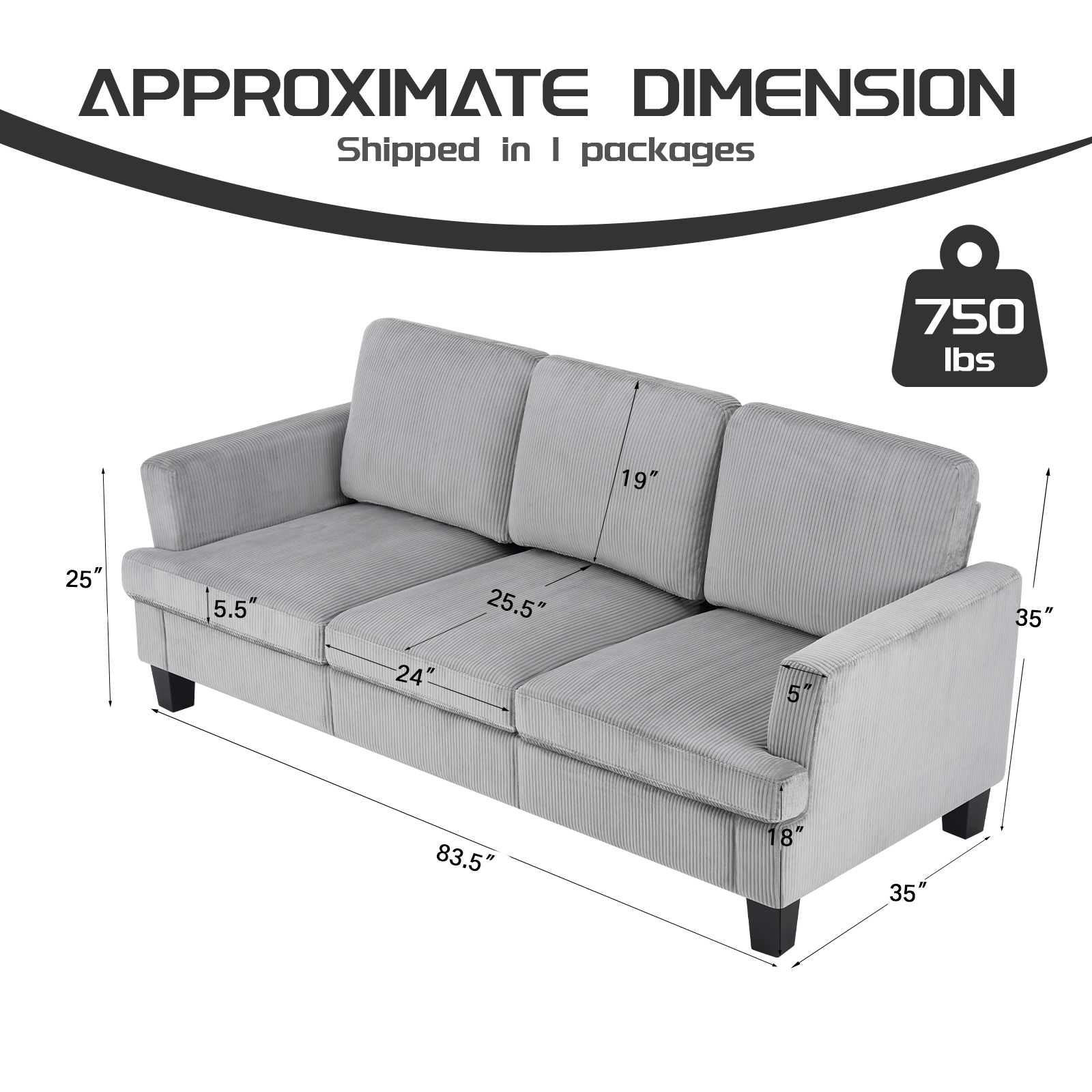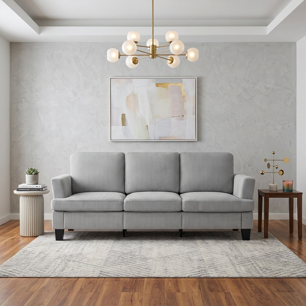 The 84-inch gray corduroy sofa redefines comfort and style in any living space. This stylish three seat sofa is upholstered with ribbed textural corduroy that is unique and gives this piece some special flair. Ergonomically designed with a cushioned, supportive backrest and comfortable arms, this sofa is a great showpiece for your room. Ideal for entertaining or everyday rest and relaxation, in your living room, office, bedroom, or lounge. Embrace both functionality and elegance with this chic addition to your home. 35.00-inch h x 83.50-inch w x 35.00-inch d.