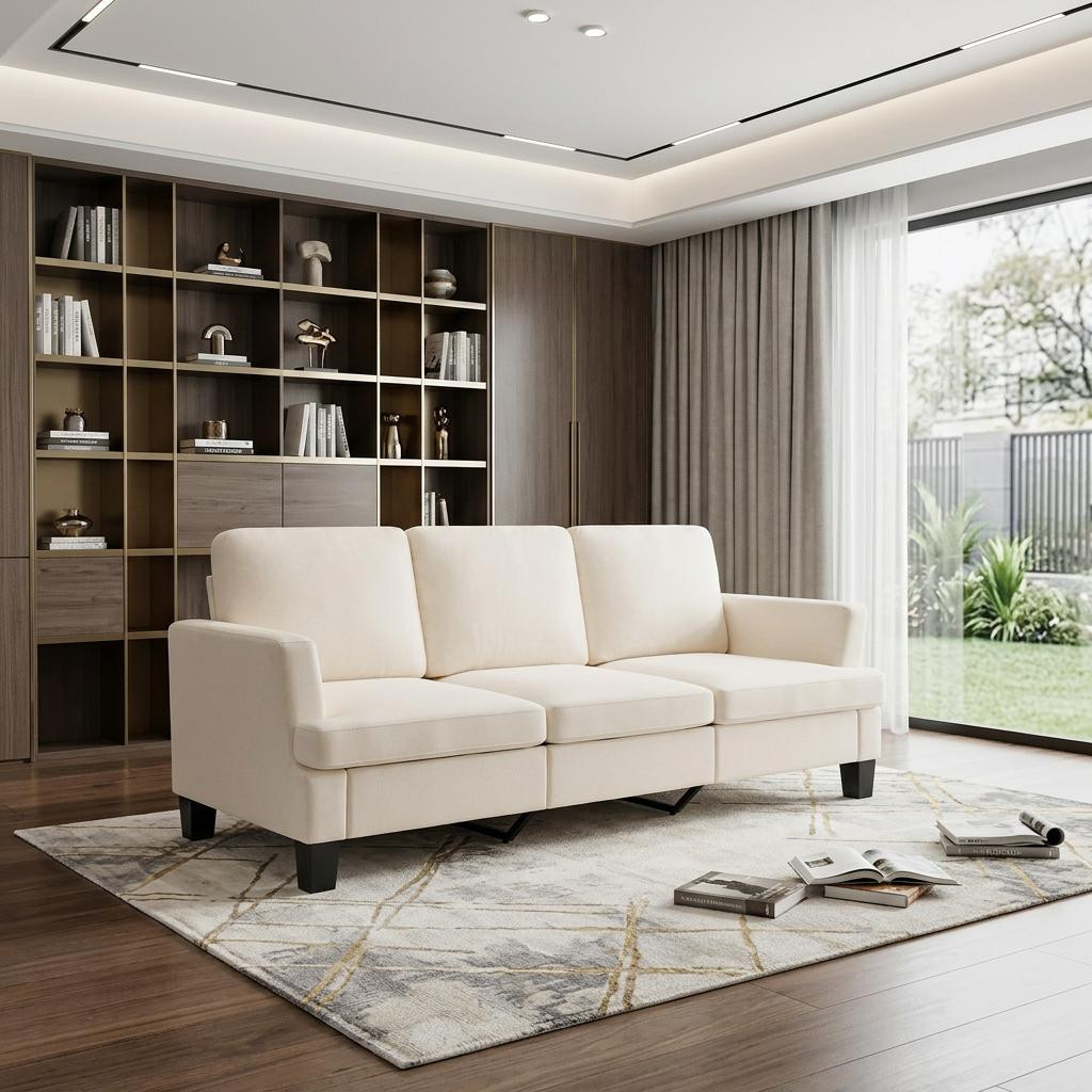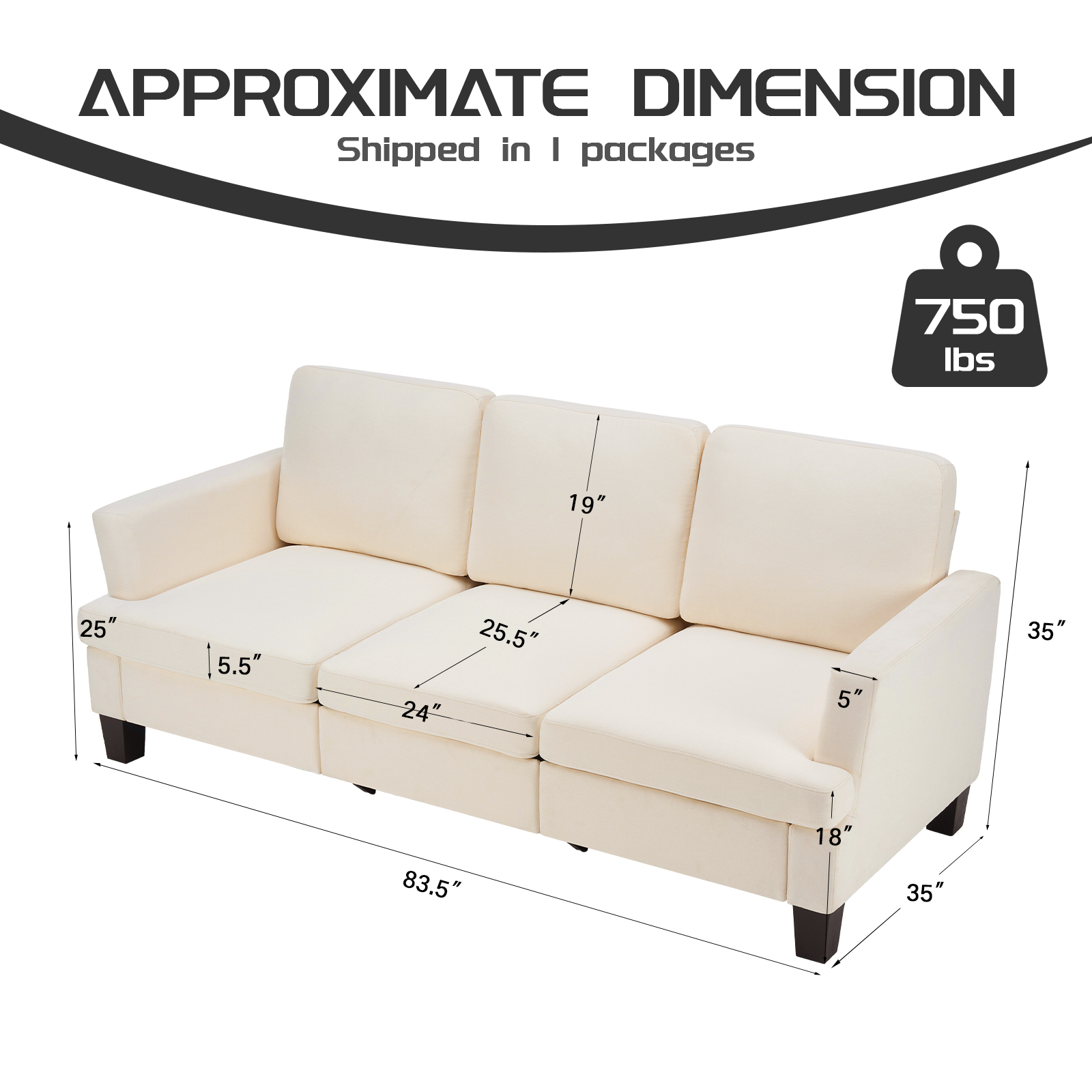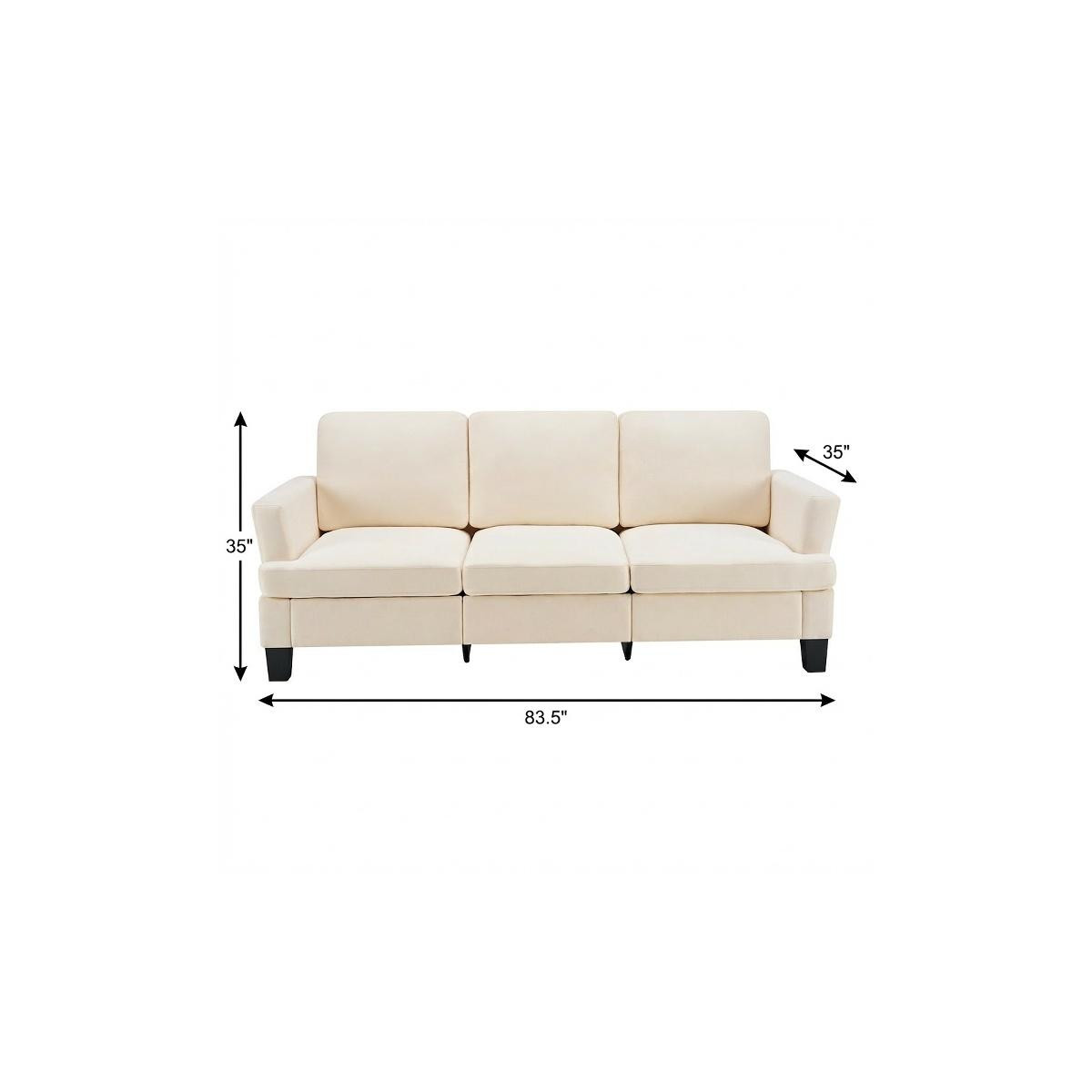 The 84-inch beige linen sofa combines style and comfort in a contemporary design. This stylish three seat sofa is upholstered with durable linen that is soft and comfortable to the touch. Ergonomically designed with cushion supportive backrest and comfortable arms, this sofa is a great showpiece for your room. Ideal for entertaining or everyday rest and relaxation, in your living room, office, bedroom, or lounge. Elevate your home decor with a blend of sophistication and comfort found in this exquisite sofa. 35.00-inch h x 83.50-inch w x 35.00-inch d.