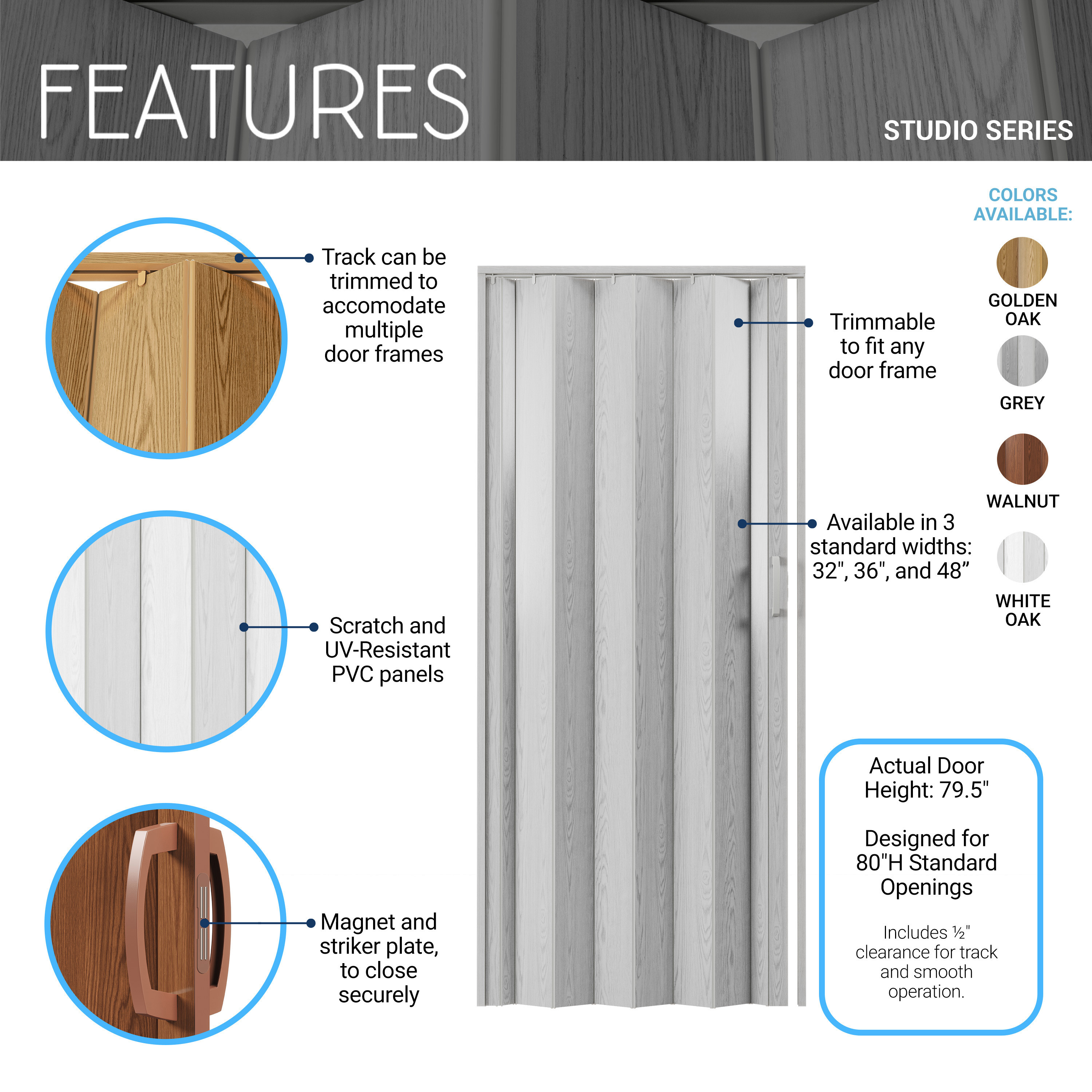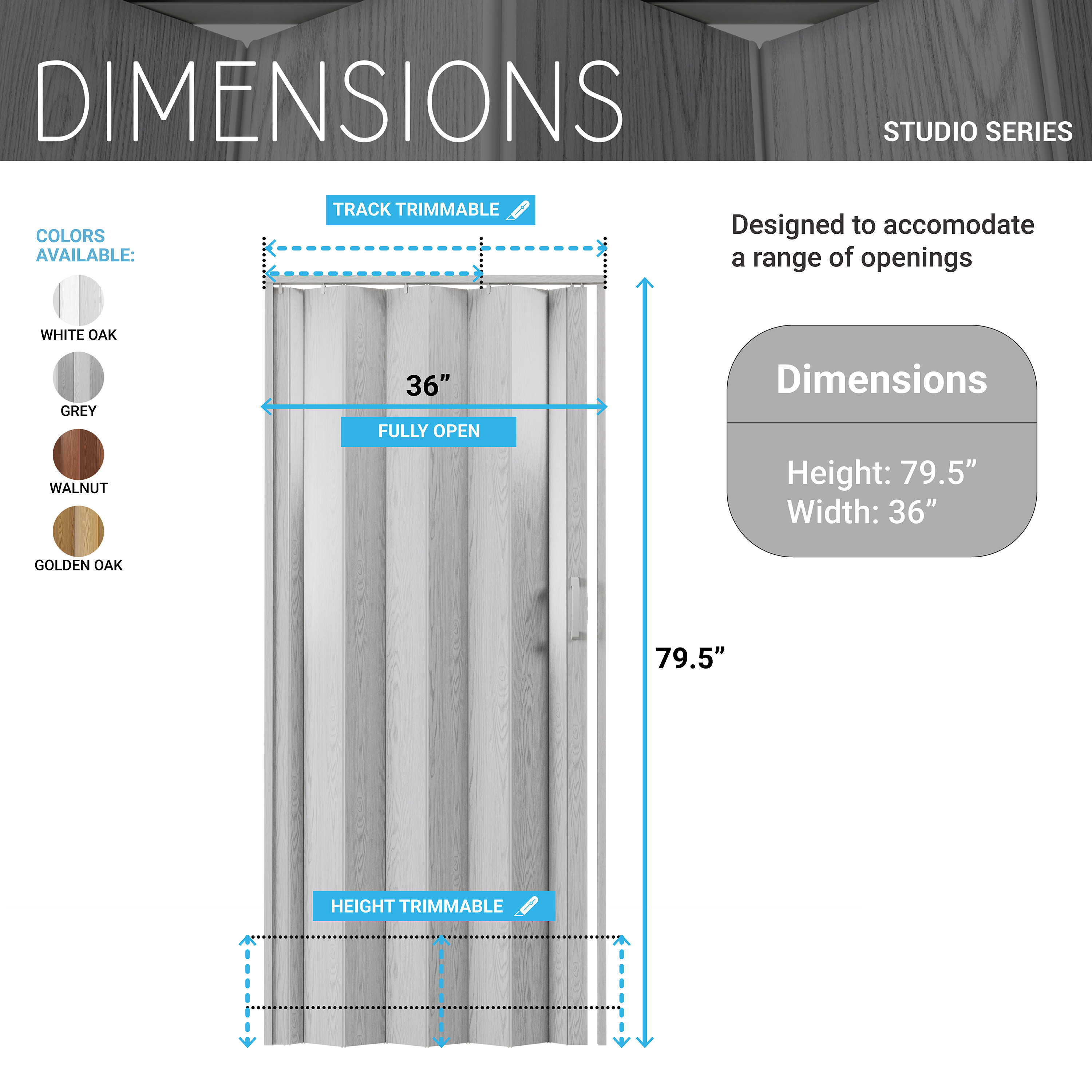 The 80-inch walnut pvc accordion door is designed to enhance your living space with a touch of elegance. Crafted from durable materials, it ensures long-lasting performance while maintaining a stylish appearance. The accordion design allows for efficient use of space, making it an ideal choice for smaller areas or rooms that require versatility. This door features a rich walnut finish that complements various interior styles, seamlessly blending modern aesthetics with classic charm. Easy to install, it offers both practicality and beauty to your home. Perfect for closets, laundry rooms, or as a room divider, this door adds functionality without sacrificing style, making it a smart addition to any decor theme. 80.00-inch h x 36.00-inch w x 0.75-inch d.