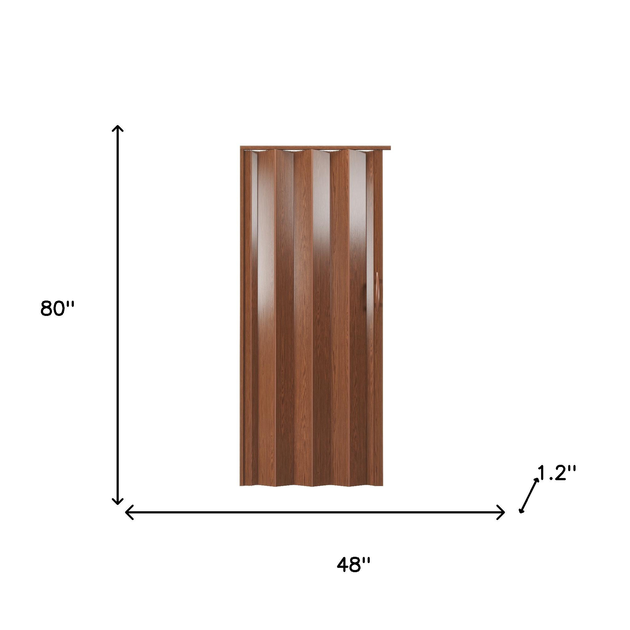 The 80-inch walnut pvc accordion door is a stylish and practical addition to any space. Crafted from durable materials, this door ensures long-lasting functionality and elegance. Its accordion design allows for easy opening and closing, making it perfect for areas where space is limited. The walnut finish adds a touch of sophistication, seamlessly blending with various decor styles. This versatile door can be used to create a private space or to separate rooms while maintaining an open feel. Enjoy the balance of form and function with this contemporary door that enhances your home's interior design. Transform your living area with a sleek solution that combines aesthetics and practicality effortlessly. 80.00-inch h x 48.00-inch w x 1.20-inch d.