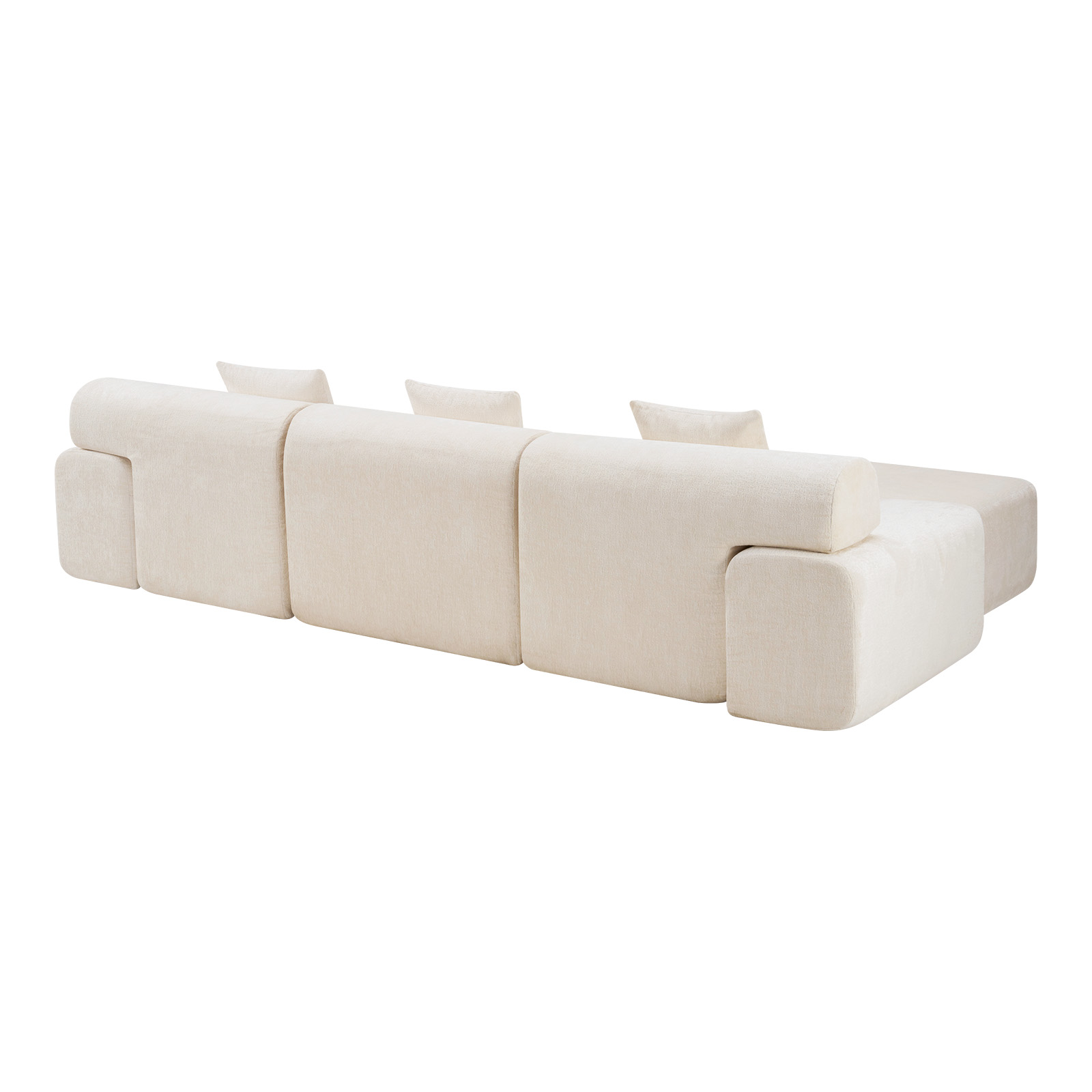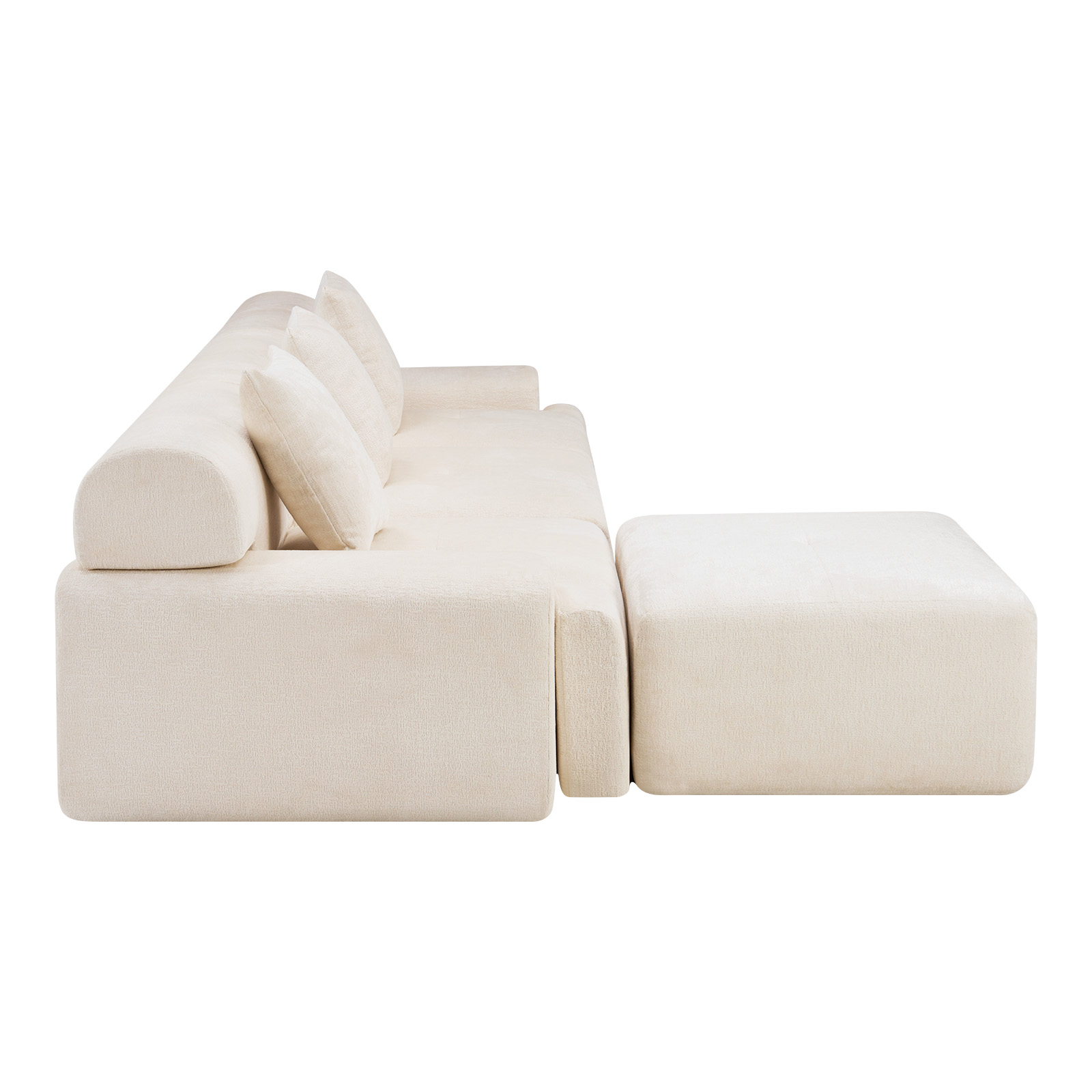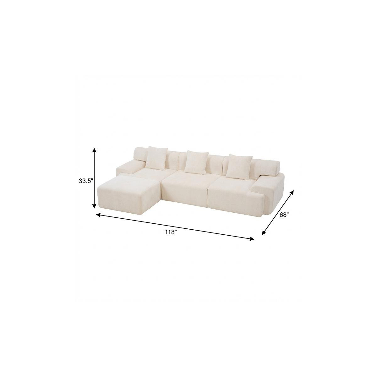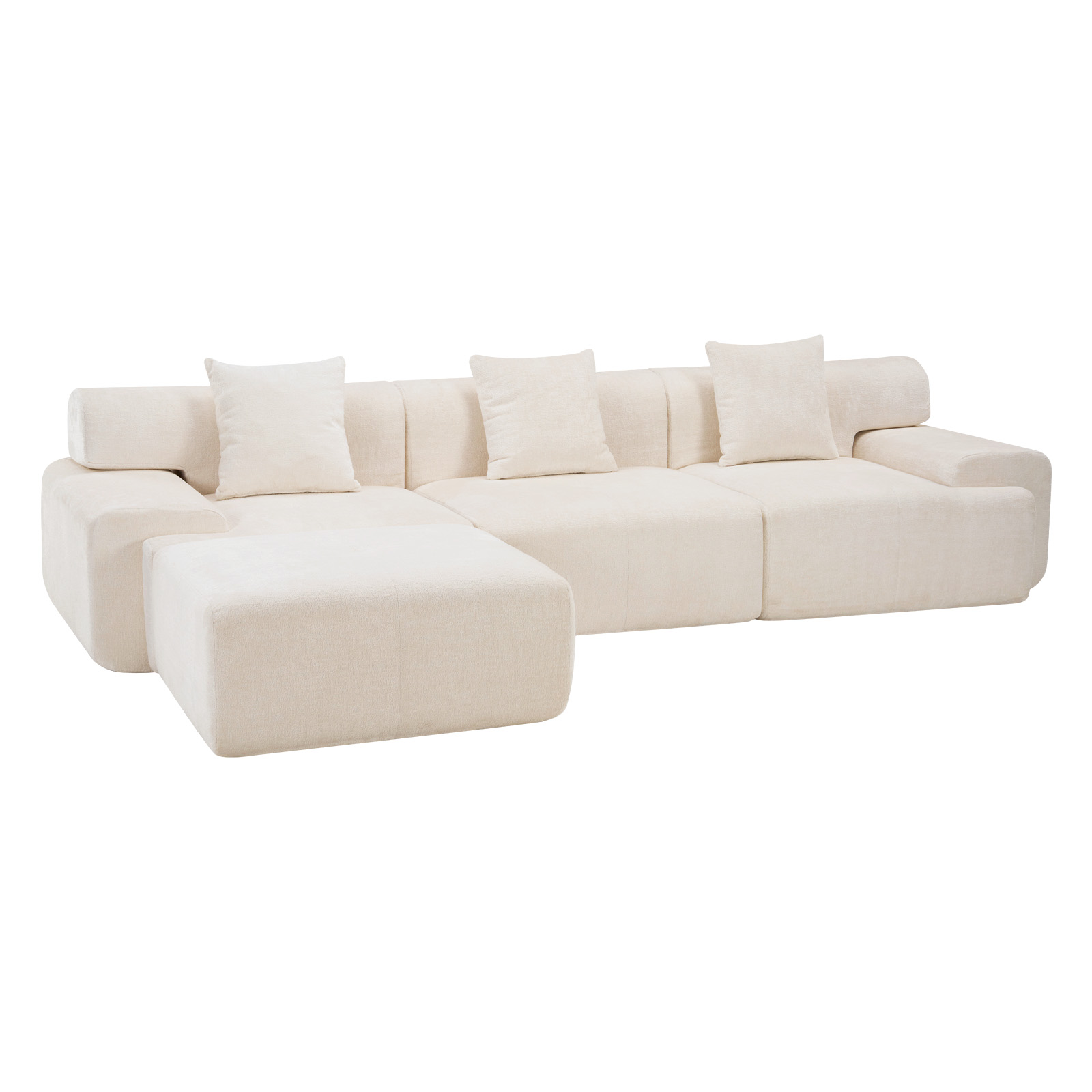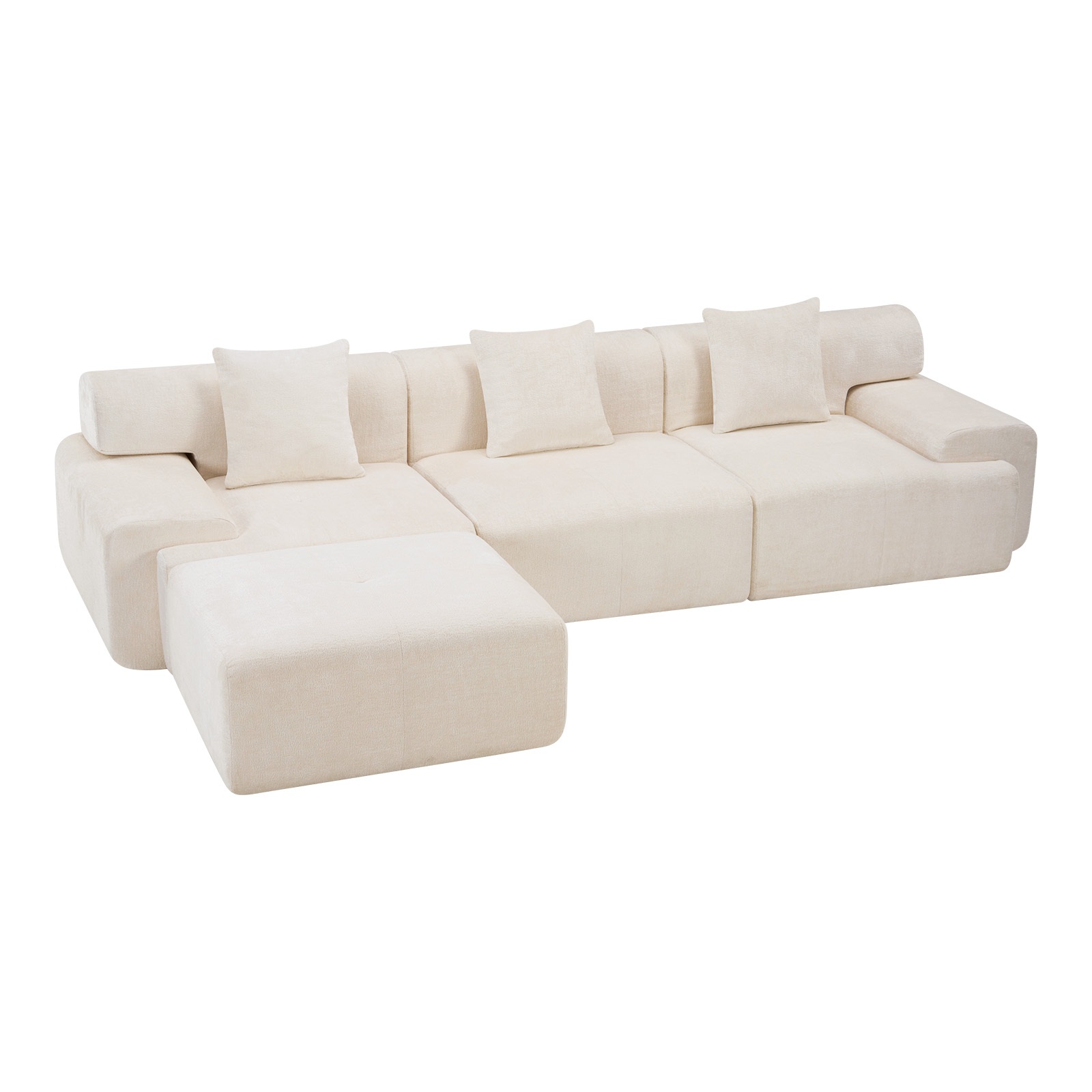 The 118-inch beige chenille modular sofa with ottoman and toss pillows is the perfect centerpiece for any modern living space. Fully upholstered with a solid color soft and durable chenille upholstery, this modular set combines an ottoman, two end pieces and middle to create a three seat sofa. Three included toss pillows add an extra layer of comfort and style. With its plush foam frame, this sofa provides durable support for everyday use. The rolled cushioned back and stylish low arms enhance its contemporary design, making it a perfect centerpiece for any room. Experience a blend of luxury and functionality with this versatile modular sofa 33.50-inch h x 118.00-inch w x 68.00-inch d.