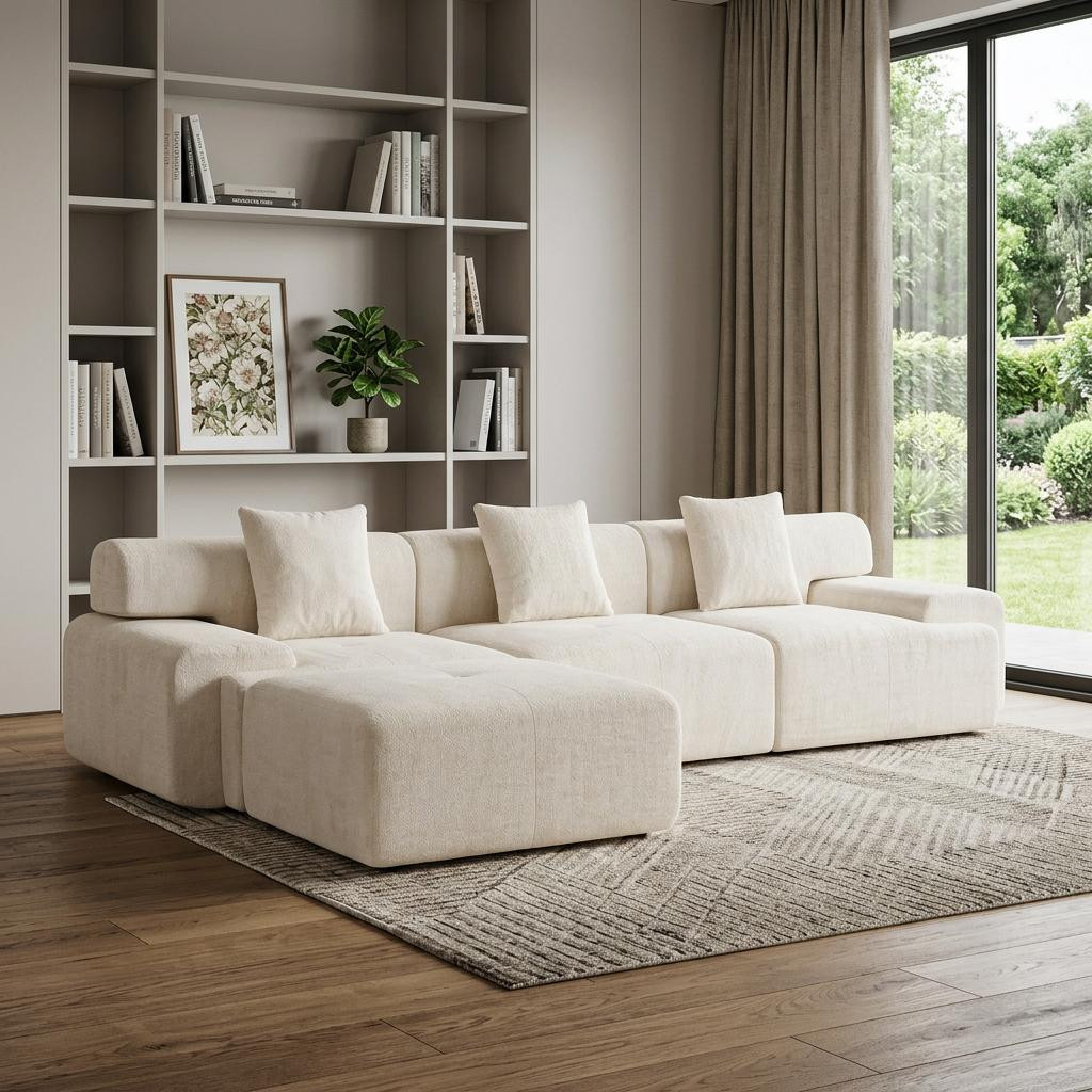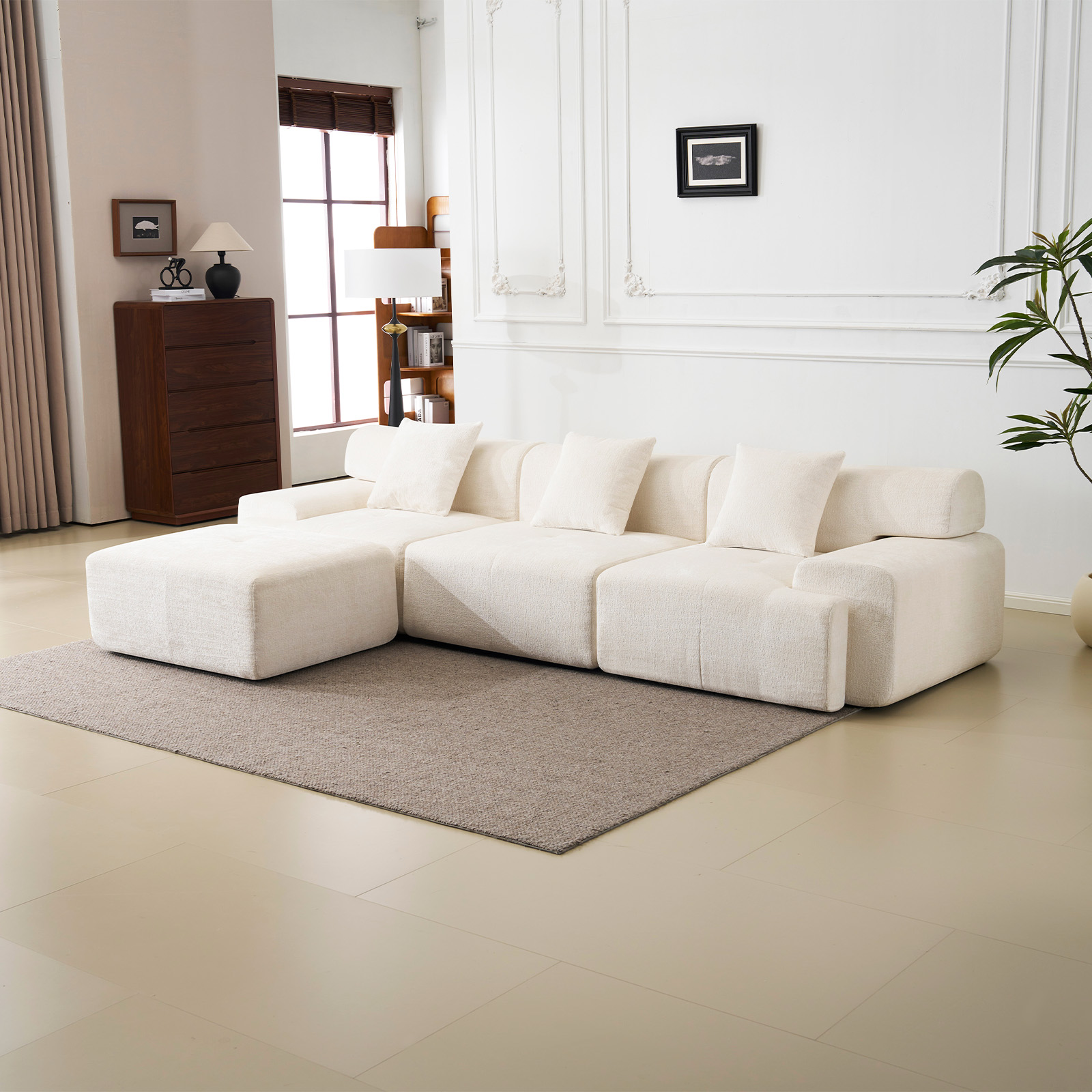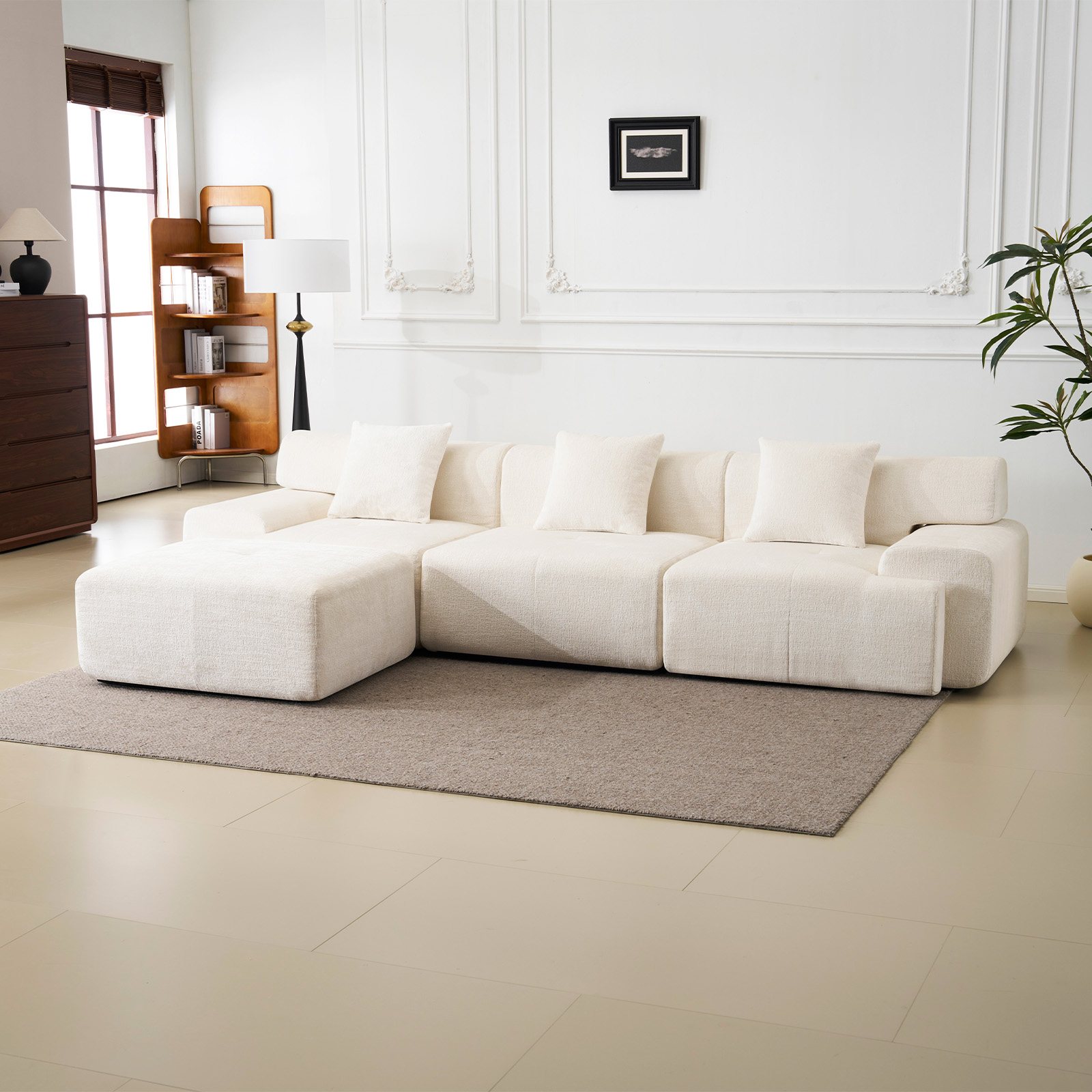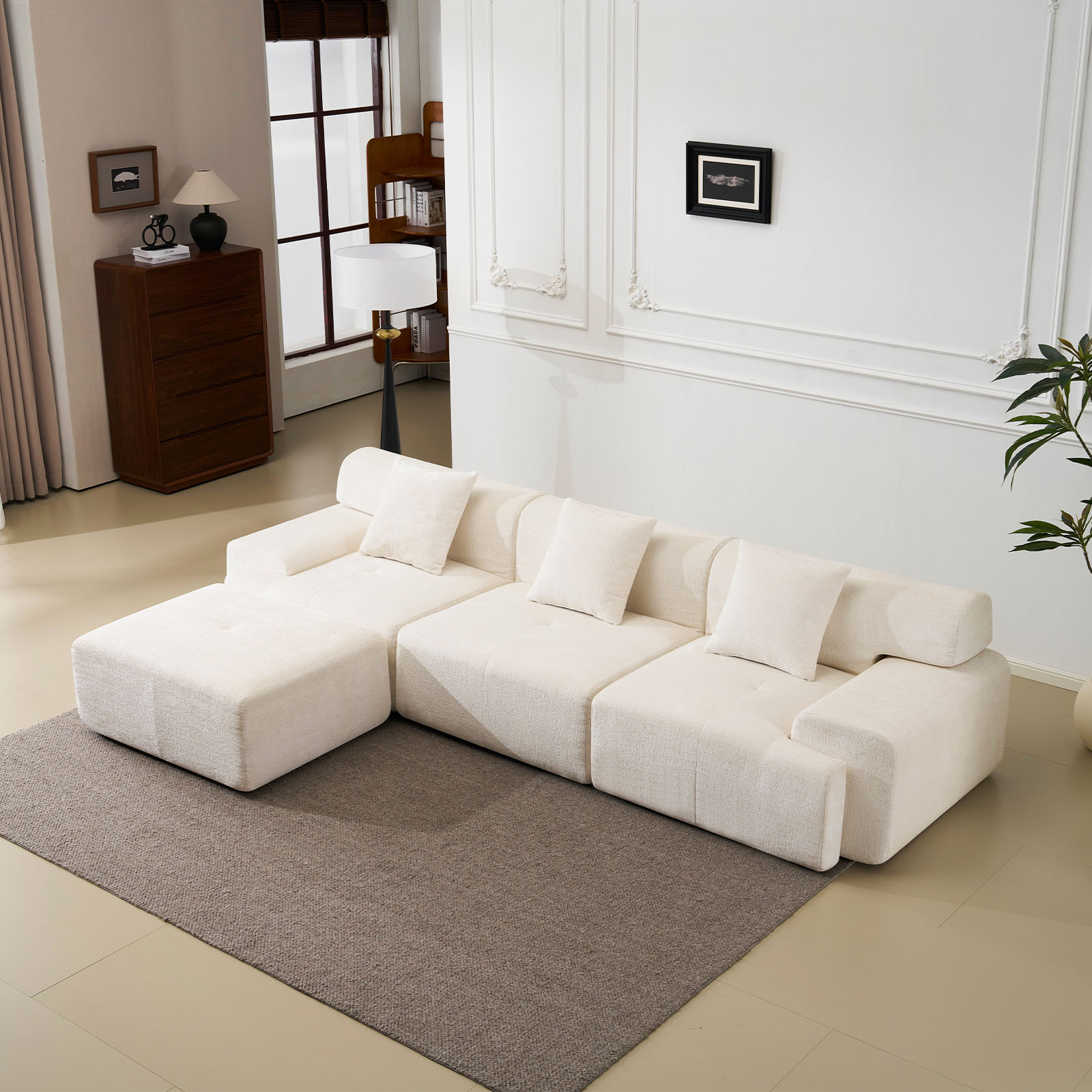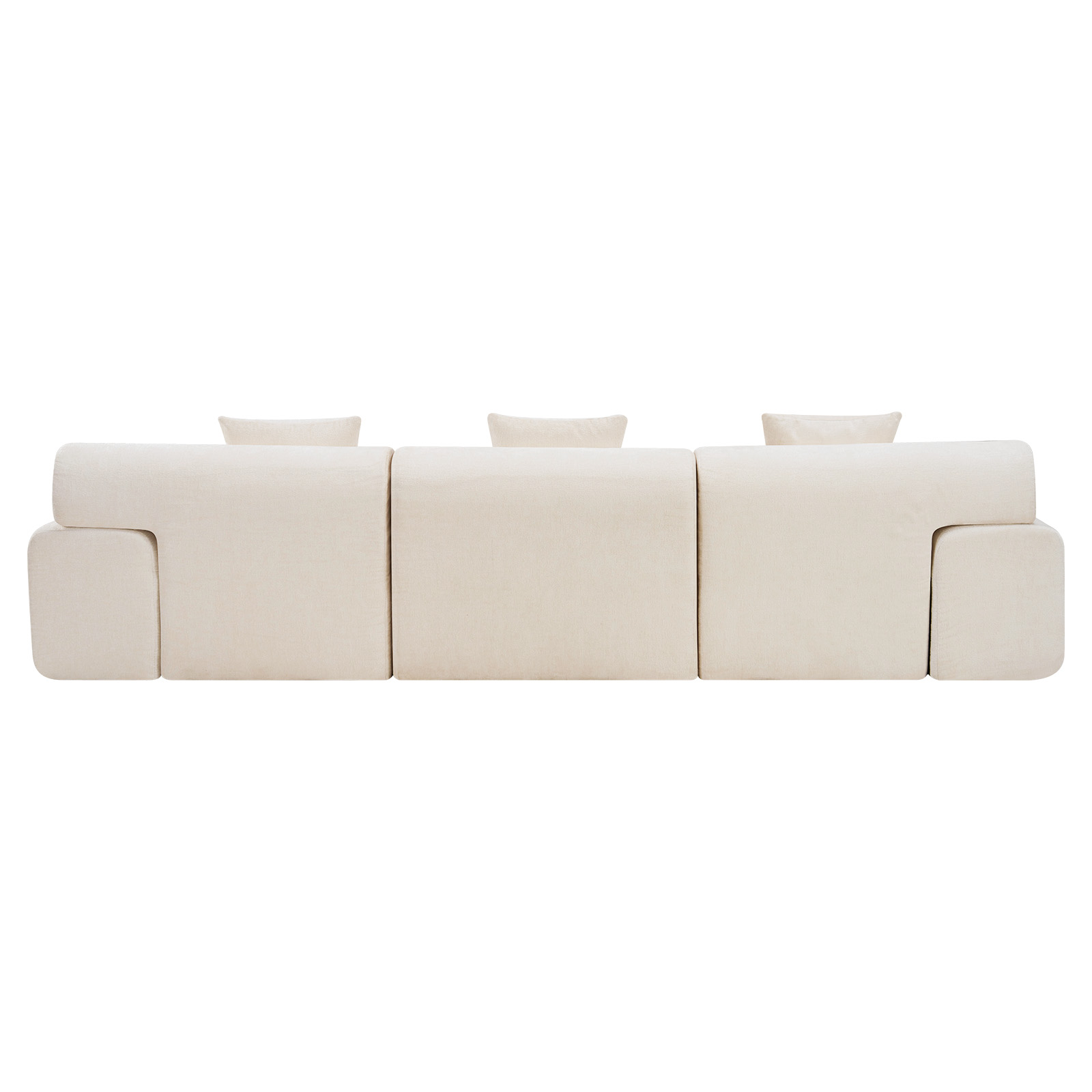 The 118-inch beige chenille modular sofa with ottoman and toss pillows is the perfect centerpiece for any modern living space. Fully upholstered with a solid color soft and durable chenille upholstery, this modular set combines an ottoman, two end pieces and middle to create a three seat sofa. Three included toss pillows add an extra layer of comfort and style. With its plush foam frame, this sofa provides durable support for everyday use. The rolled cushioned back and stylish low arms enhance its contemporary design, making it a perfect centerpiece for any room. Experience a blend of luxury and functionality with this versatile modular sofa 33.50-inch h x 118.00-inch w x 68.00-inch d.