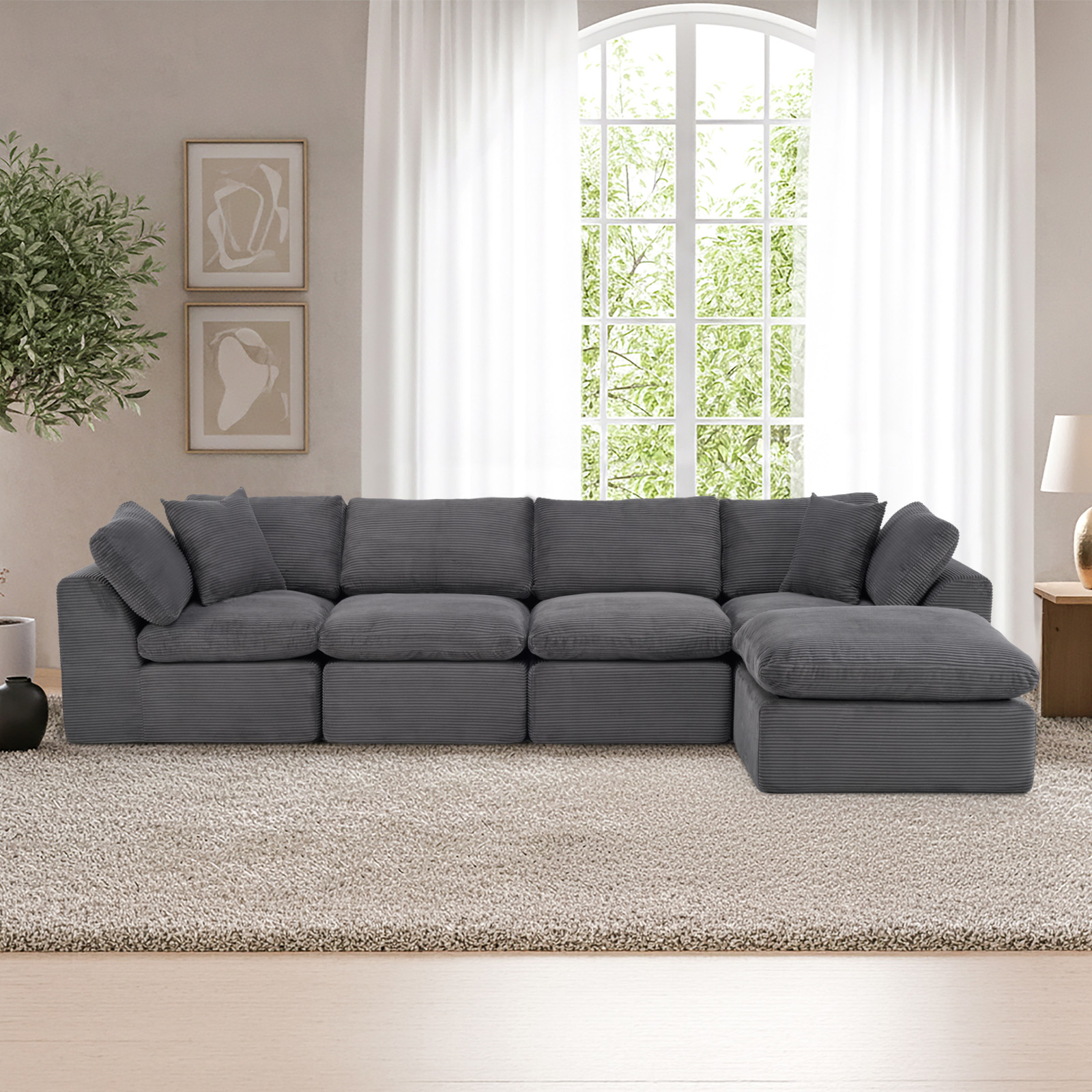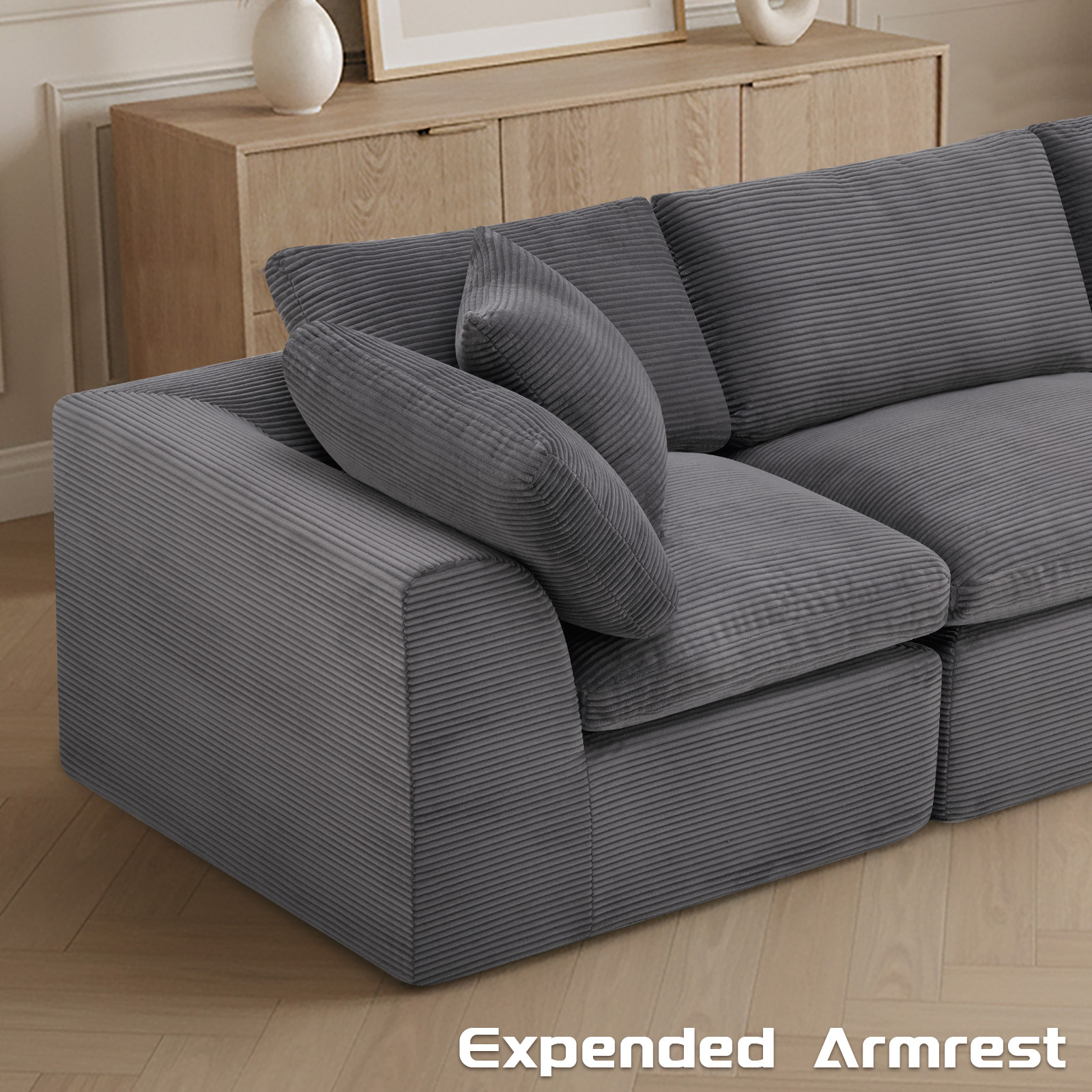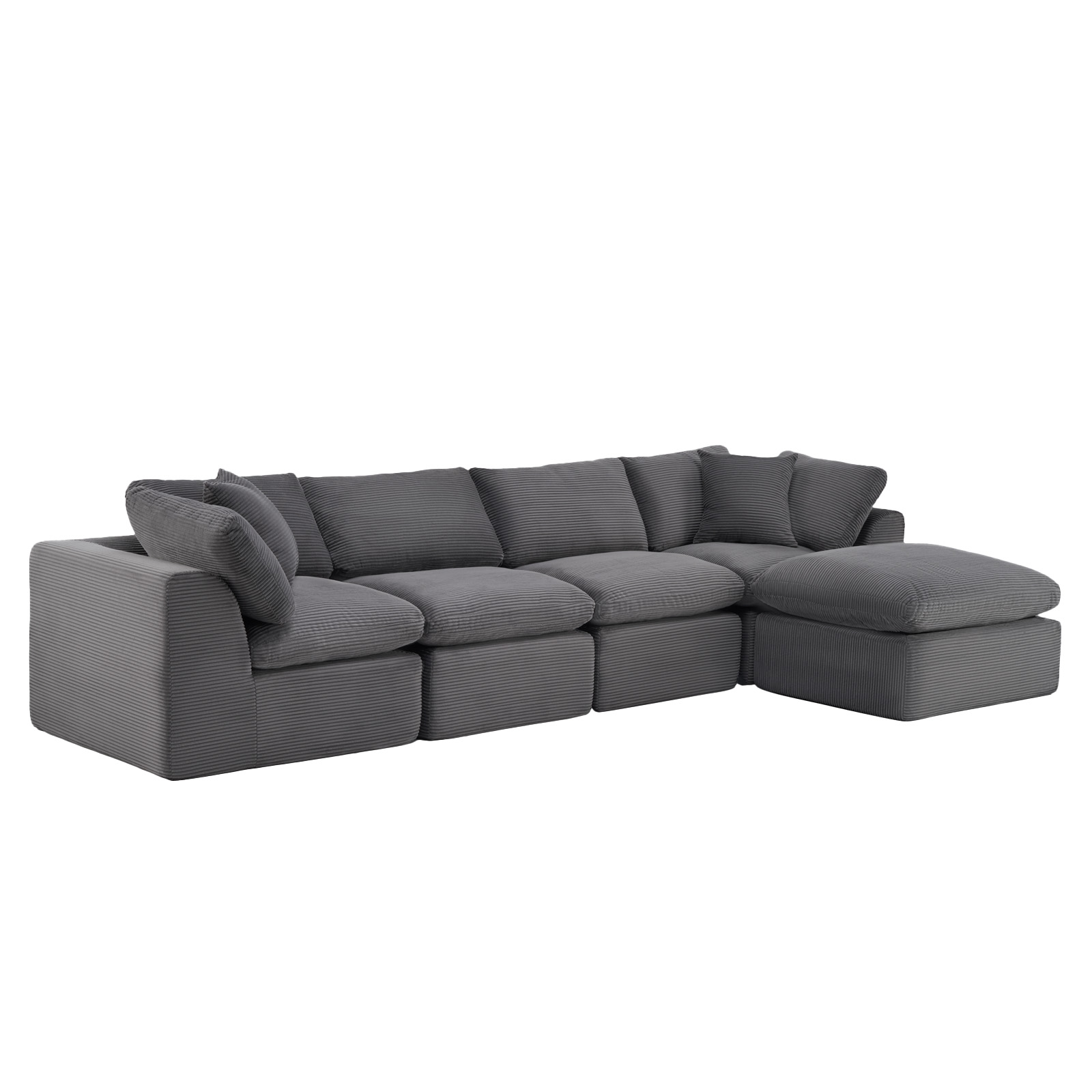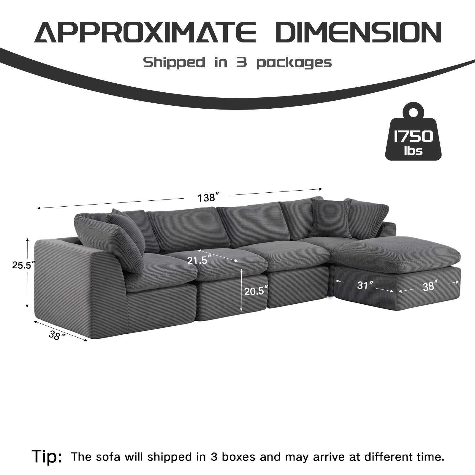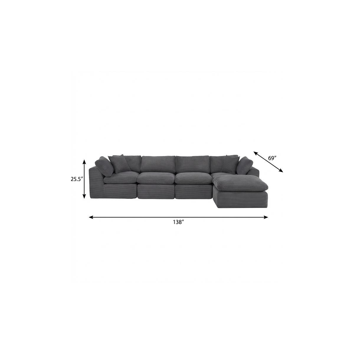 The 138-inch dark gray corduroy modular sofa with ottoman and toss pillows offers a stylish and comfortable seating solution for your living space. Fully upholstered with a solid color soft and textural faux fur corduroy upholstery, this modular set includes two end pieces and two middle sections to create a four seater sofa, along with a moveable ottoman. The included toss pillows add an extra layer of comfort. With its plush foam frame, this sofa provides durable support for everyday use. The cushioned back and stylish wide arched arms enhance its contemporary design, making it a perfect centerpiece for any room. Experience a blend of luxury and functionality with this versatile modular sofa. 25.50-inch h x 138.00-inch w x 69.00-inch d.