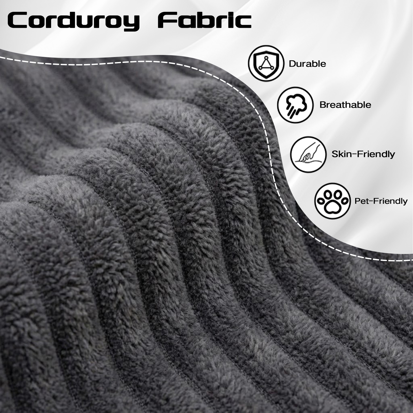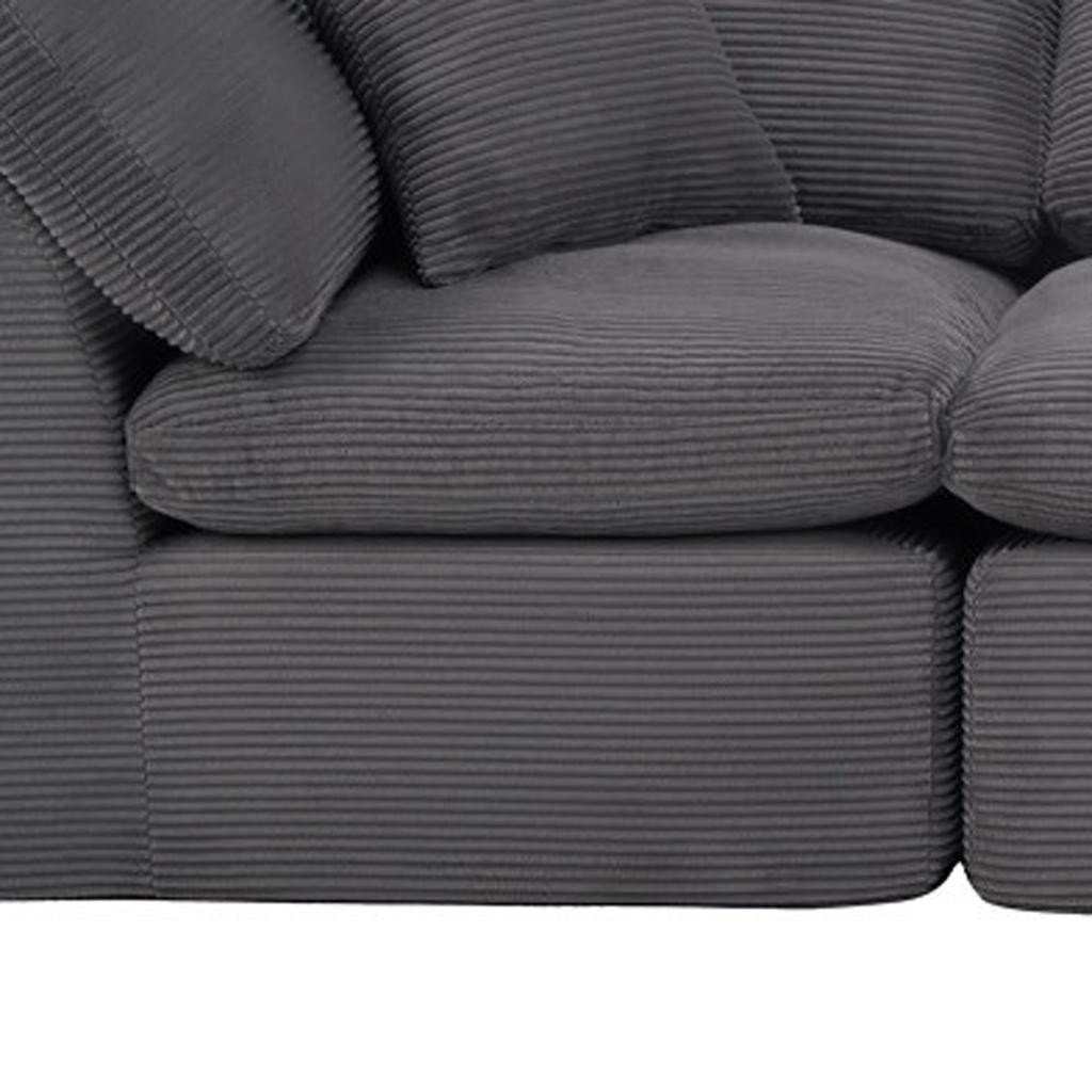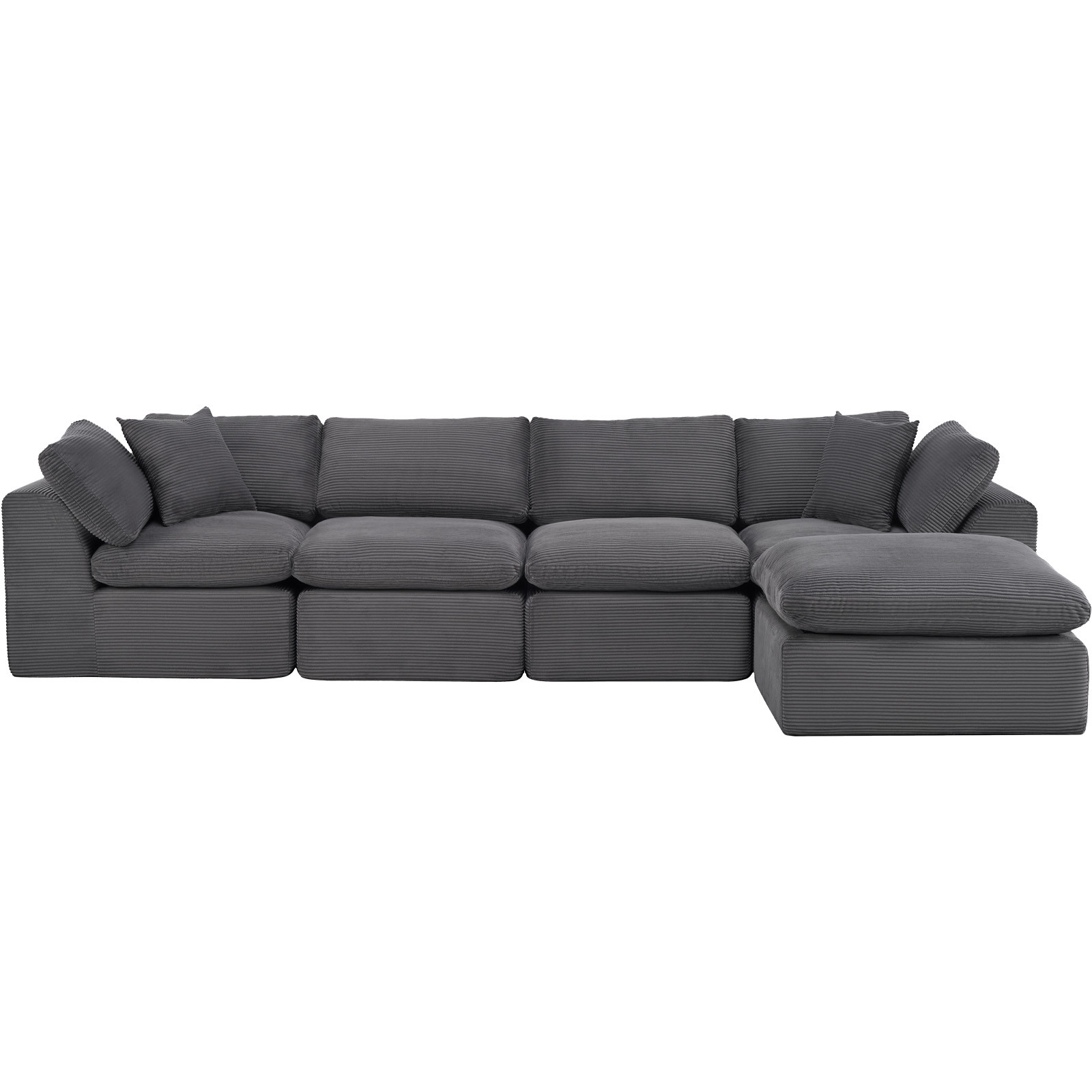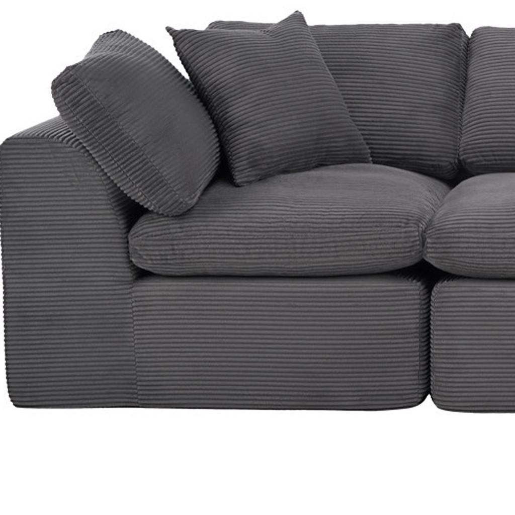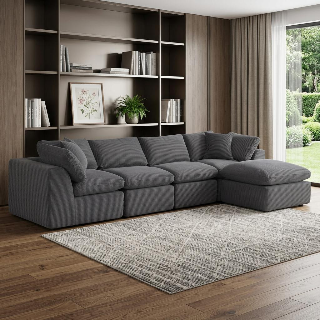 The 138-inch dark gray corduroy modular sofa with ottoman and toss pillows offers a stylish and comfortable seating solution for your living space. Fully upholstered with a solid color soft and textural faux fur corduroy upholstery, this modular set includes two end pieces and two middle sections to create a four seater sofa, along with a moveable ottoman. The included toss pillows add an extra layer of comfort. With its plush foam frame, this sofa provides durable support for everyday use. The cushioned back and stylish wide arched arms enhance its contemporary design, making it a perfect centerpiece for any room. Experience a blend of luxury and functionality with this versatile modular sofa. 25.50-inch h x 138.00-inch w x 69.00-inch d.