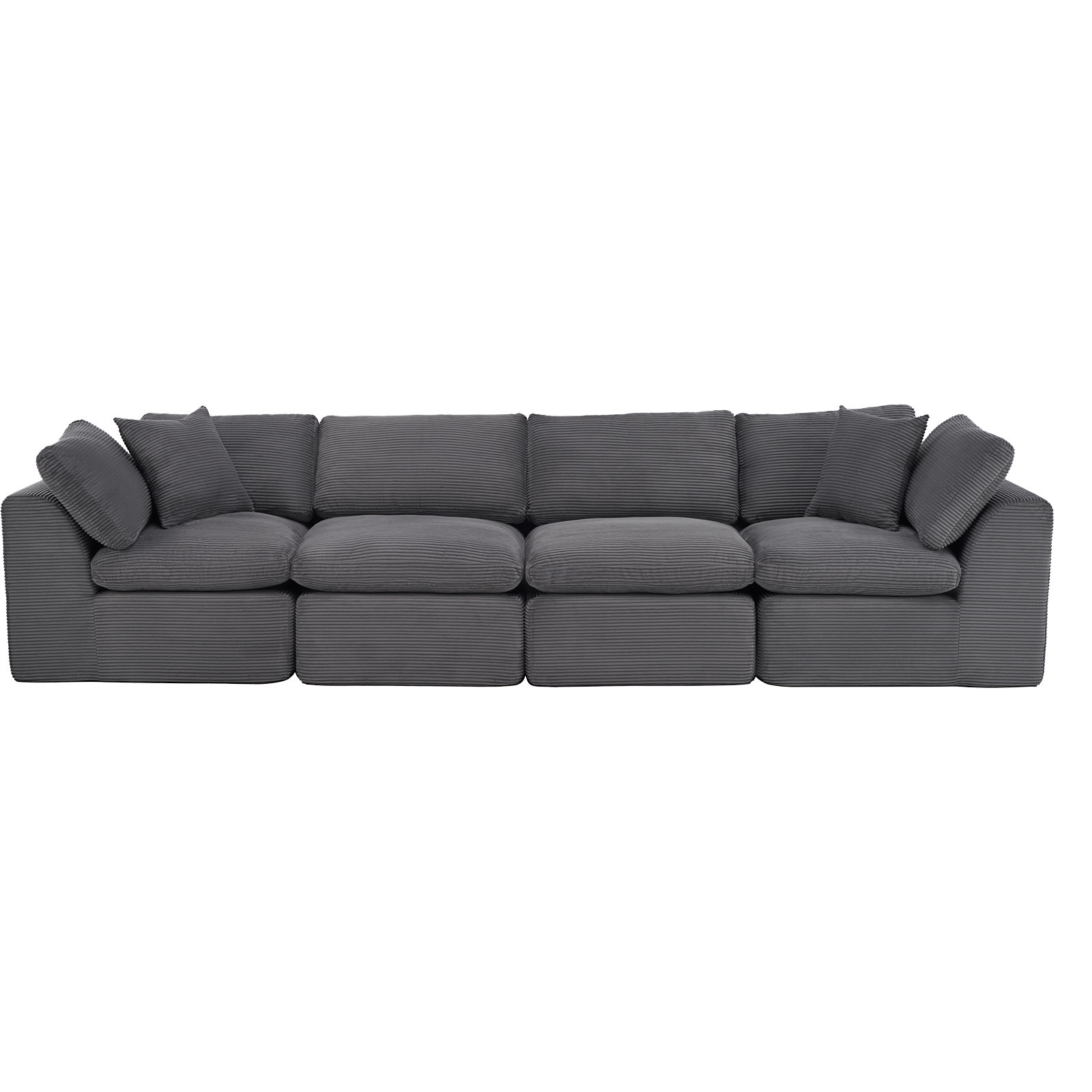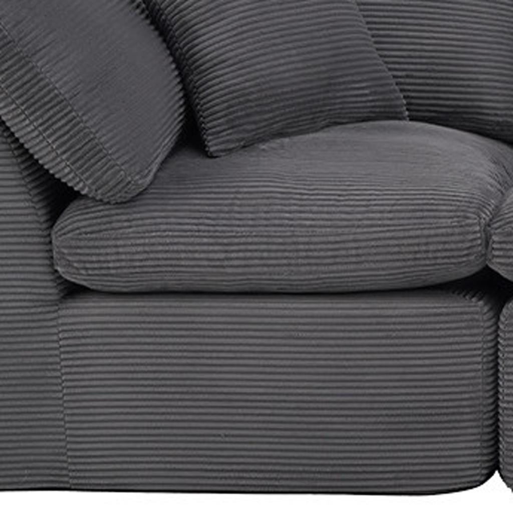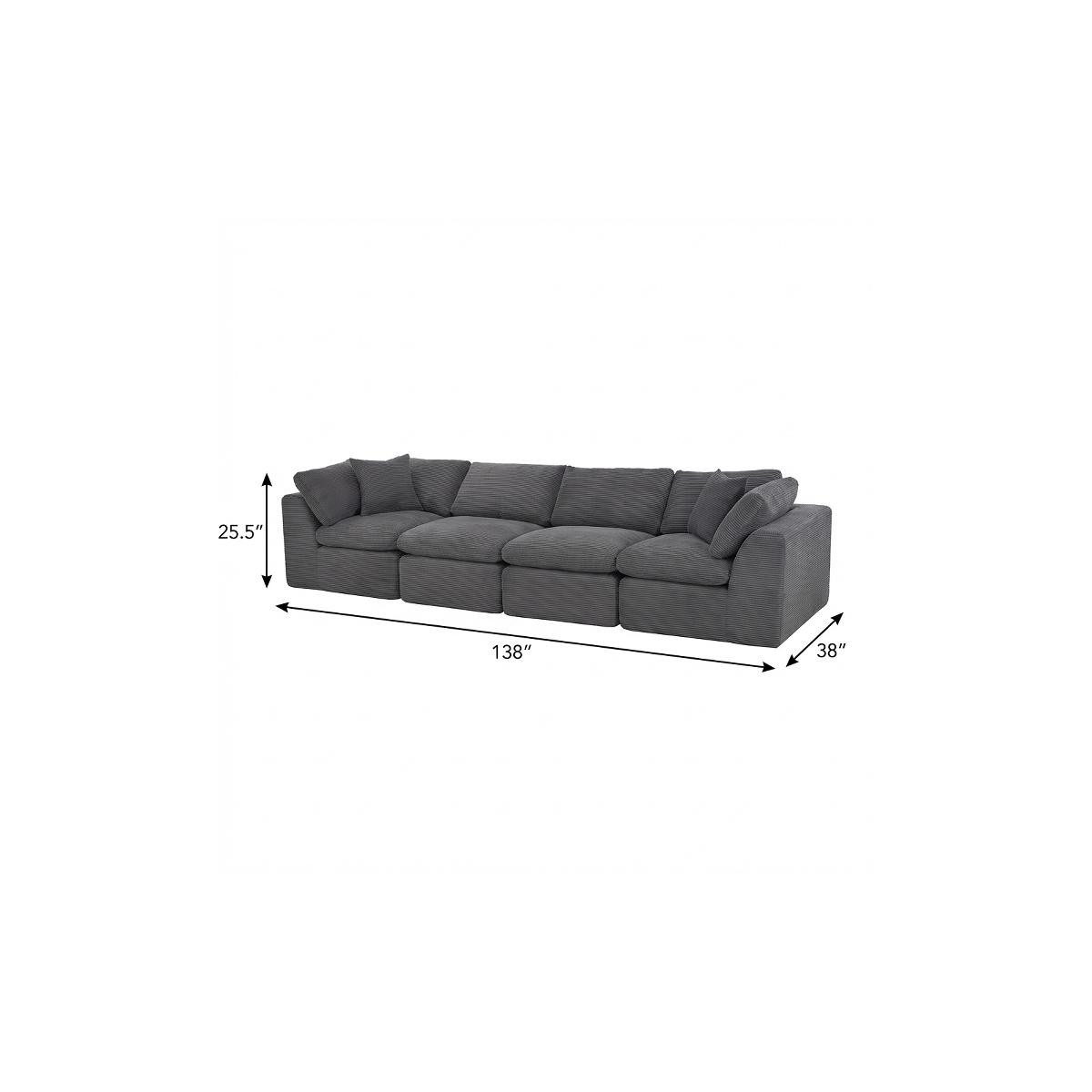 The 138-inch dark gray corduroy modular sofa with toss pillows is the perfect blend of style and comfort for your living space. Fully upholstered with a solid color soft plush corduroy upholstery, this modular set combines two end pieces and two middle sections to create a four seater sofa. The included toss pillows add an extra layer of comfort. With its plush foam frame, this sofa provides durable support for everyday use. The cushioned back and stylish wide arched arms enhance its contemporary design, making it a perfect centerpiece for any room. Experience a blend of luxury and functionality with this versatile modular sofa. 25.50-inch h x 138.00-inch w x 38.00-inch d.