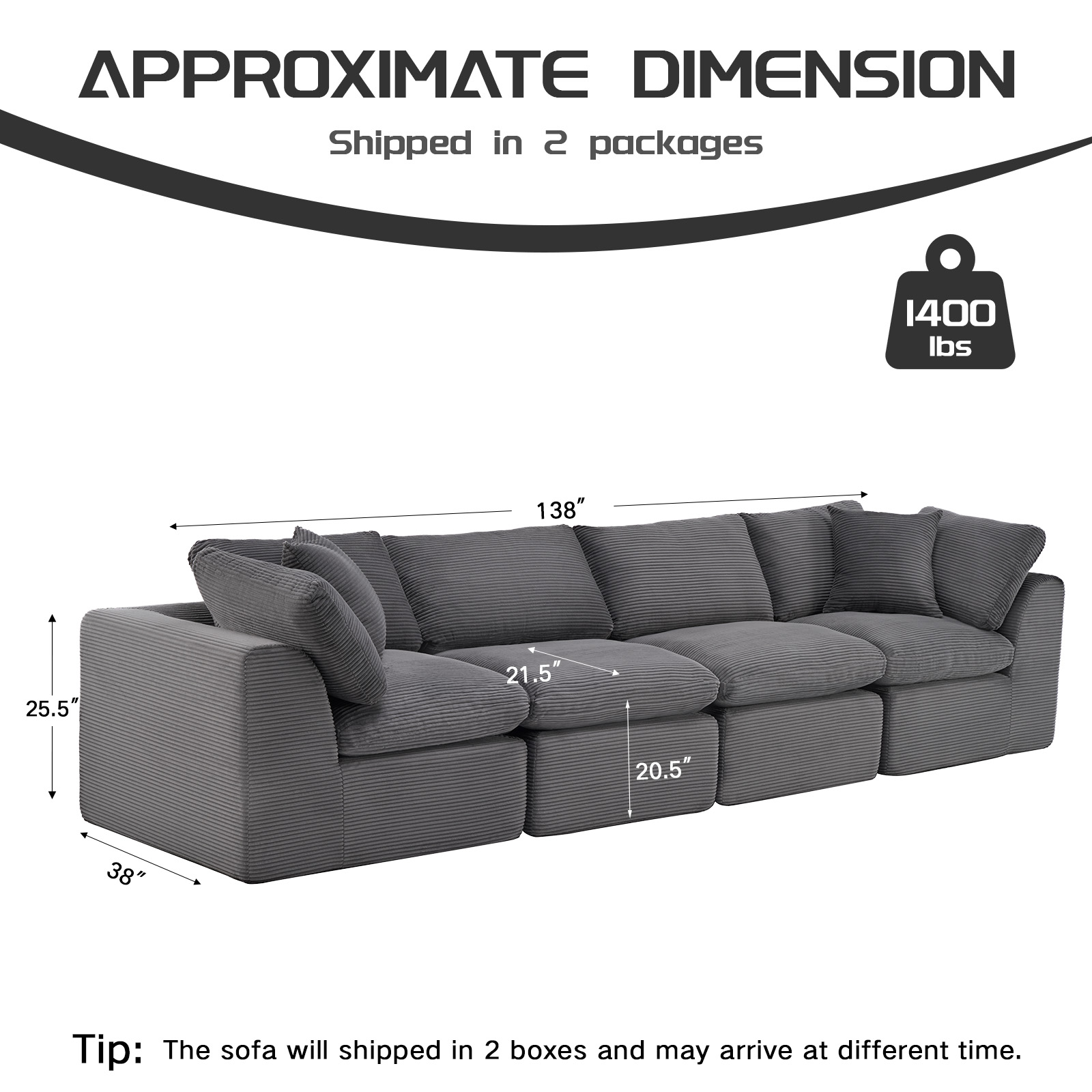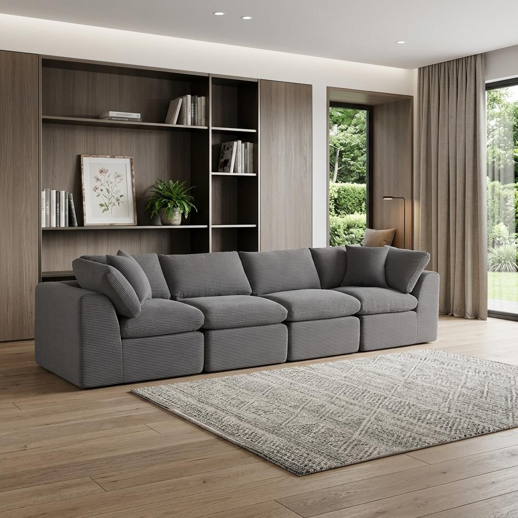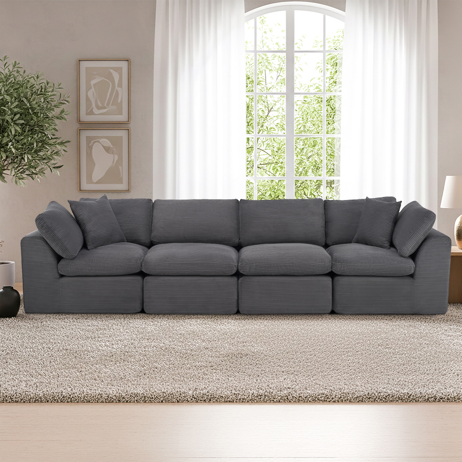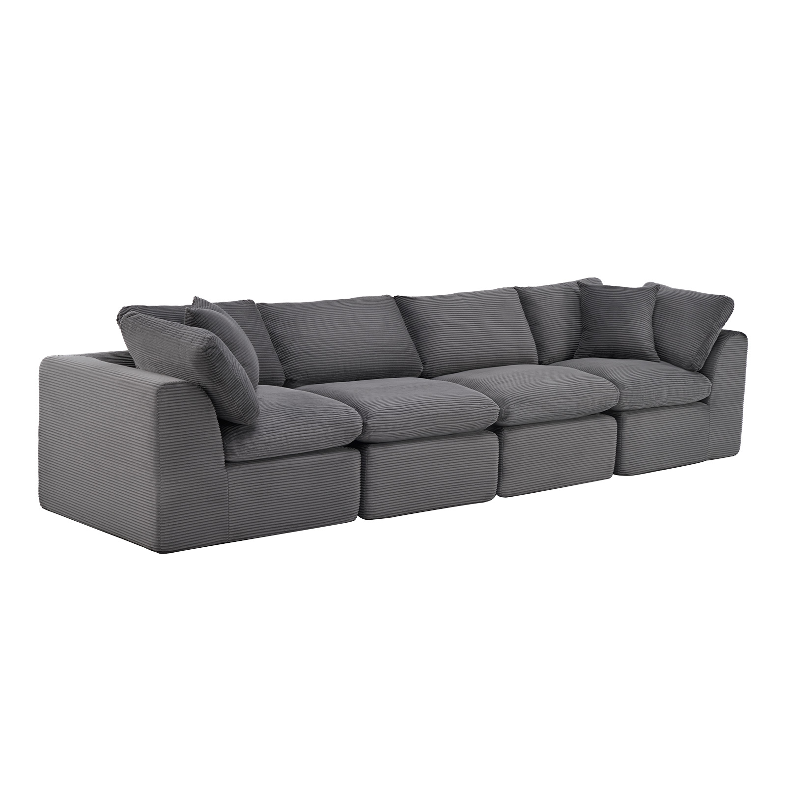 The 138-inch dark gray corduroy modular sofa with toss pillows is the perfect blend of style and comfort for your living space. Fully upholstered with a solid color soft plush corduroy upholstery, this modular set combines two end pieces and two middle sections to create a four seater sofa. The included toss pillows add an extra layer of comfort. With its plush foam frame, this sofa provides durable support for everyday use. The cushioned back and stylish wide arched arms enhance its contemporary design, making it a perfect centerpiece for any room. Experience a blend of luxury and functionality with this versatile modular sofa. 25.50-inch h x 138.00-inch w x 38.00-inch d.