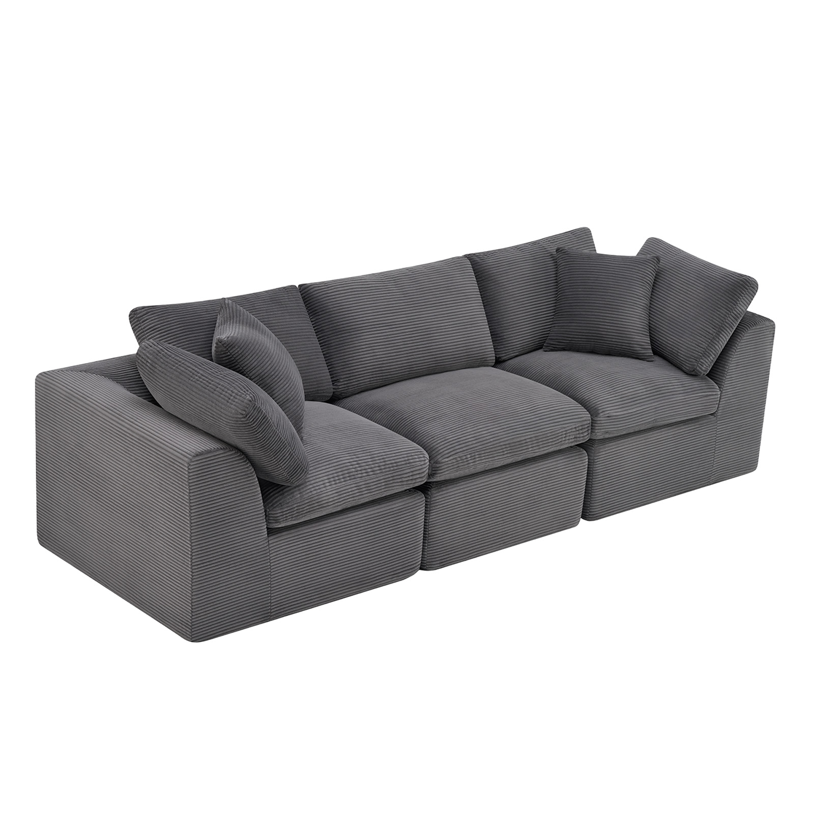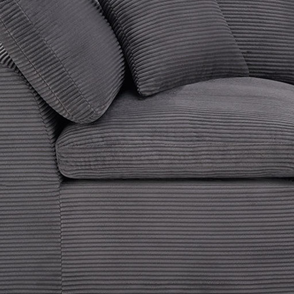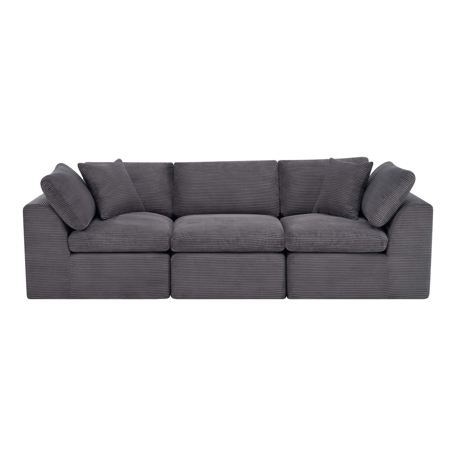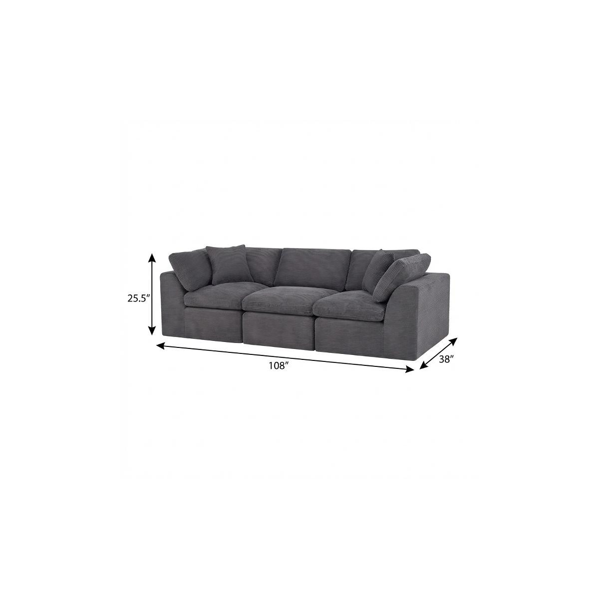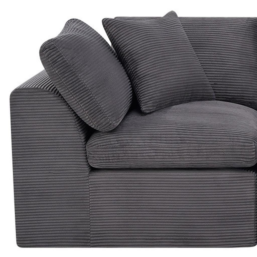 The 108-inch dark gray corduroy modular sofa with toss pillows offers a modern touch to your living space. Fully upholstered with a solid color soft plush corduroy upholstery, this modular set combines two end pieces and middle to create a three seat sofa. The included toss pillows add an extra layer of comfort. With its plush foam frame, this sofa provides durable support for everyday use. The cushioned back and stylish wide arched arms enhance its contemporary design, making it a perfect centerpiece for any room. Experience a blend of luxury and functionality with this versatile modular sofa. 25.50-inch h x 108.00-inch w x 38.00-inch d.