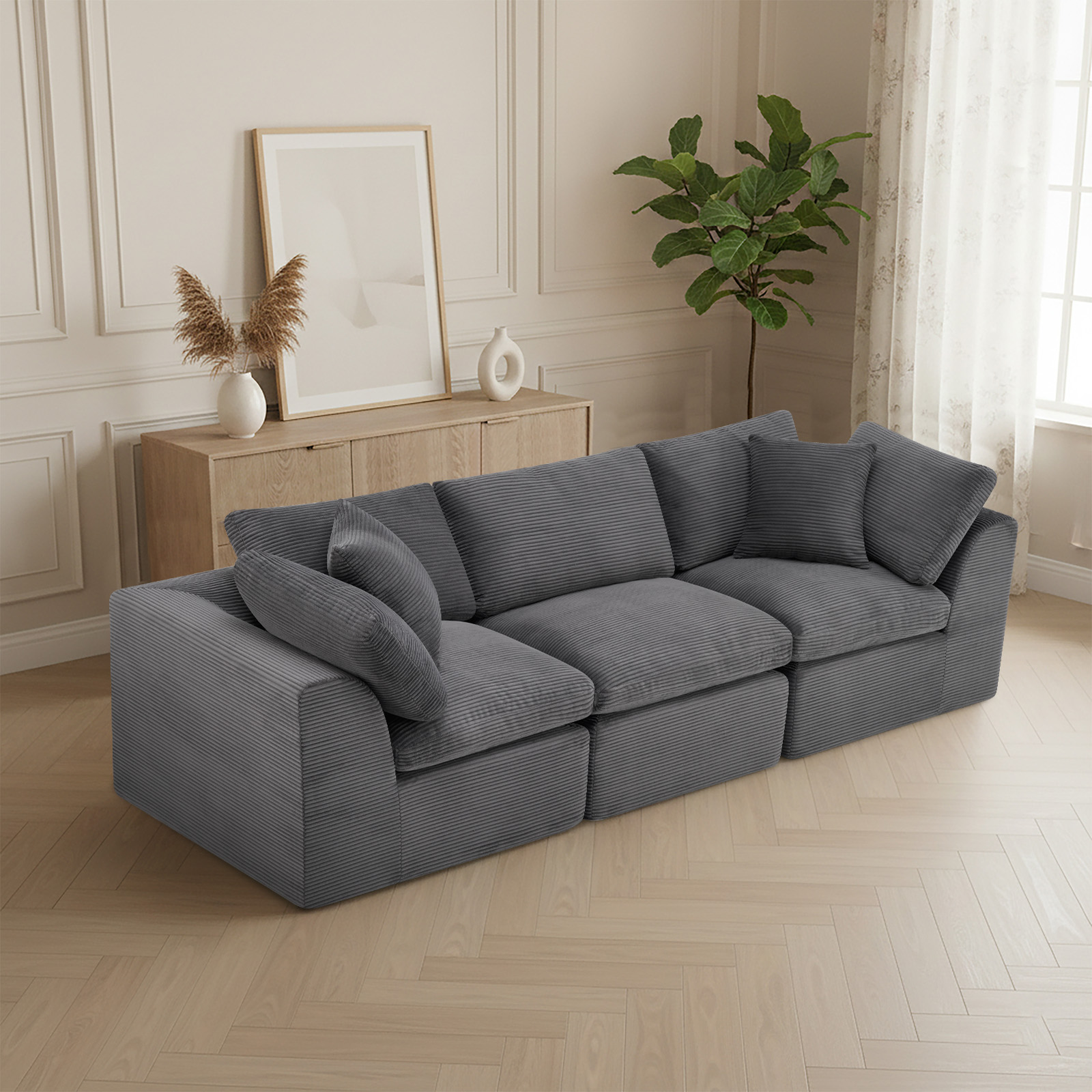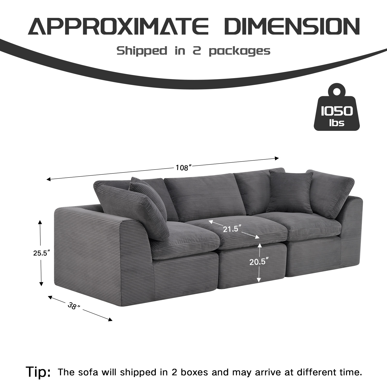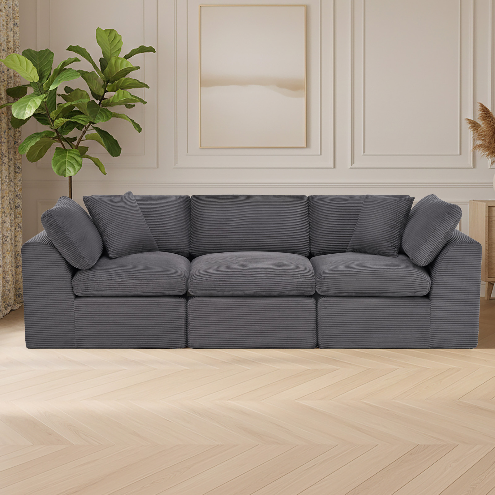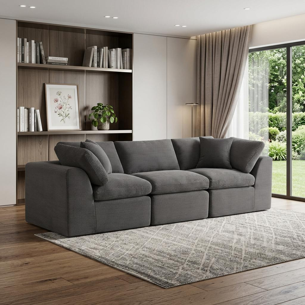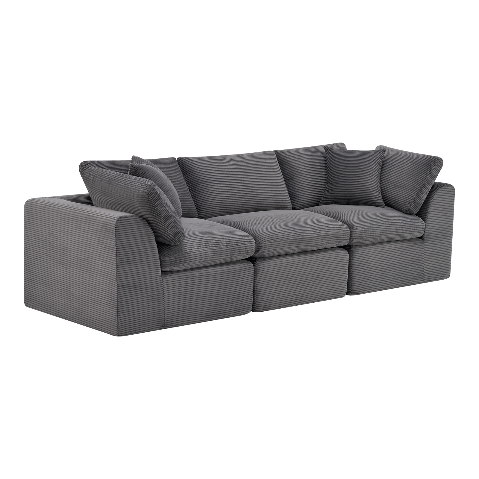 The 108-inch dark gray corduroy modular sofa with toss pillows offers a modern touch to your living space. Fully upholstered with a solid color soft plush corduroy upholstery, this modular set combines two end pieces and middle to create a three seat sofa. The included toss pillows add an extra layer of comfort. With its plush foam frame, this sofa provides durable support for everyday use. The cushioned back and stylish wide arched arms enhance its contemporary design, making it a perfect centerpiece for any room. Experience a blend of luxury and functionality with this versatile modular sofa. 25.50-inch h x 108.00-inch w x 38.00-inch d.