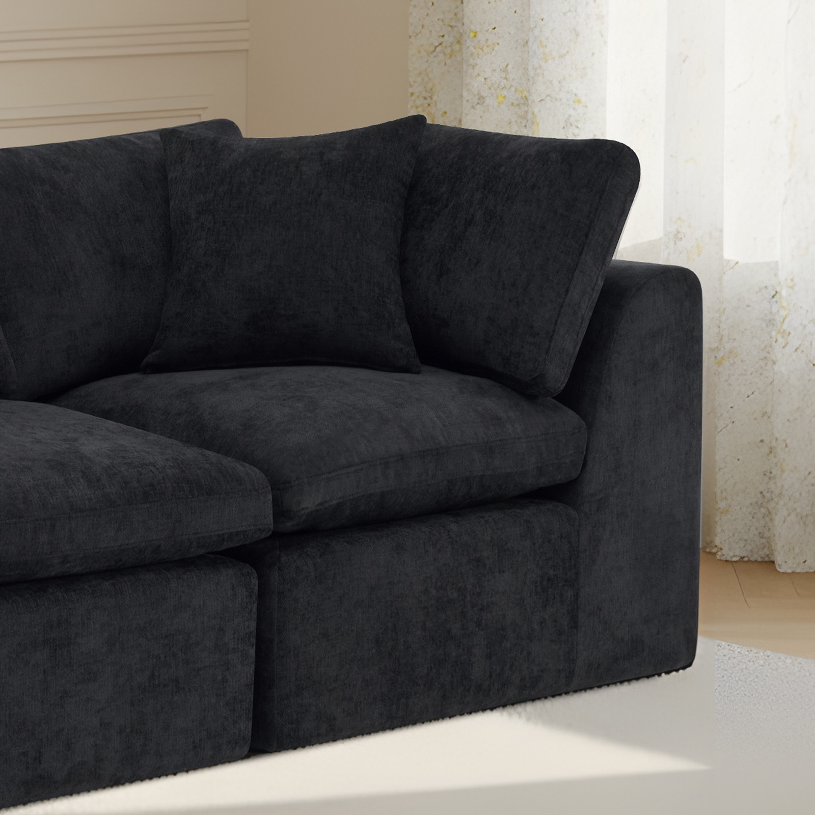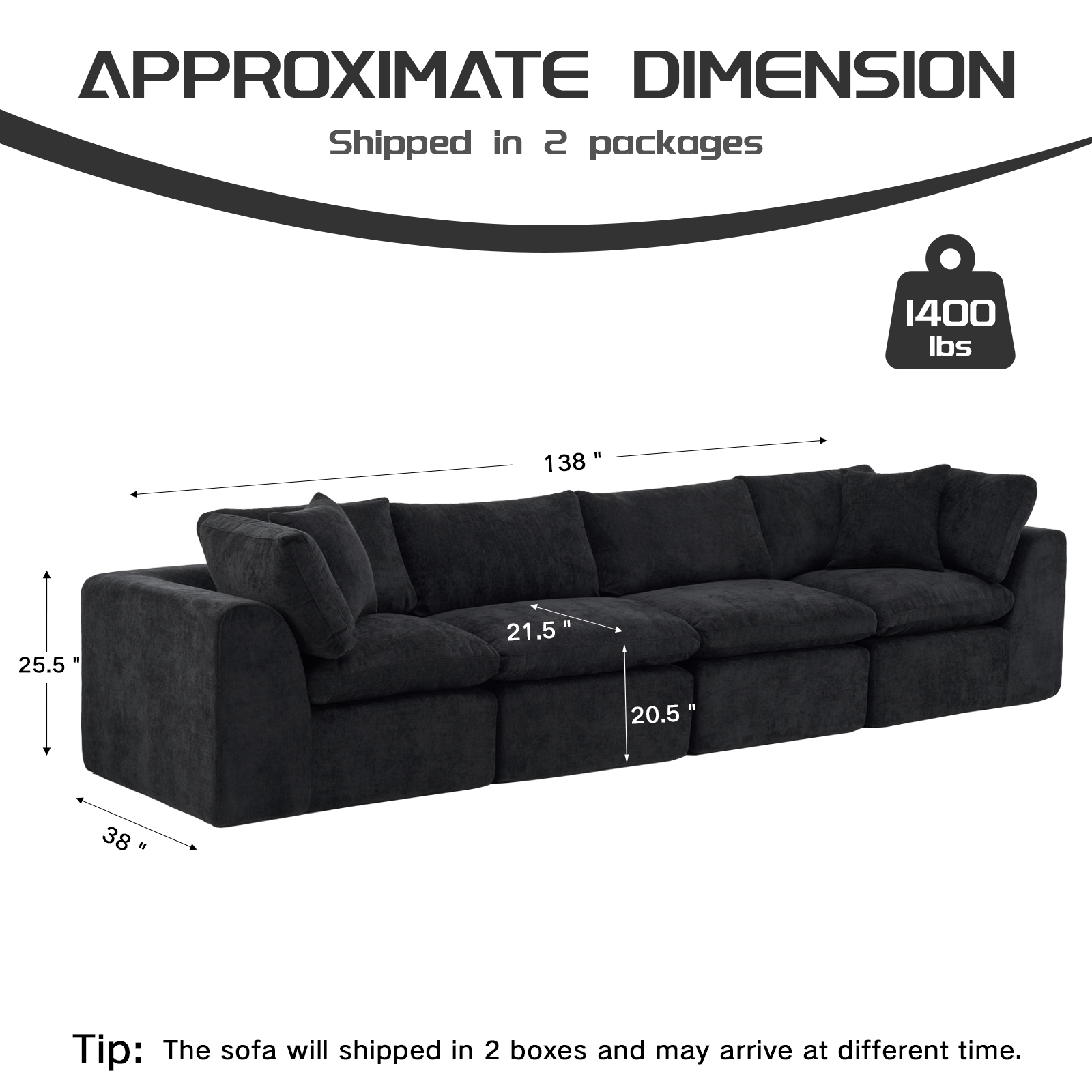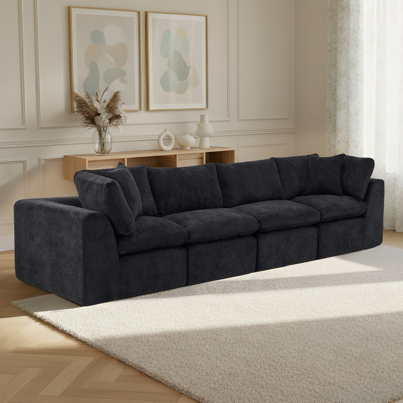 The 138-inch black chenille modular sofa with toss pillows offers a contemporary twist to your living space. Fully upholstered with a solid color soft and durable chenille upholstery, this modular set combines two end pieces and two middle sections to create a four seater sofa. The included toss pillows add an extra layer of comfort. With its plush foam frame, this sofa provides durable support for everyday use. The cushioned back and stylish wide arched arms enhance its contemporary design, making it a perfect centerpiece for any room. Experience a blend of luxury and functionality with this versatile modular sofa. 25.50-inch h x 138.00-inch w x 38.00-inch d.