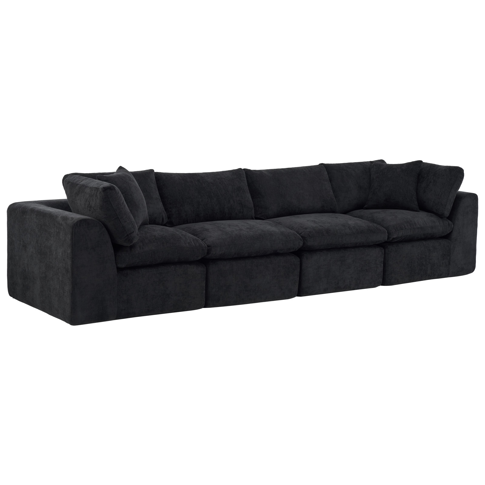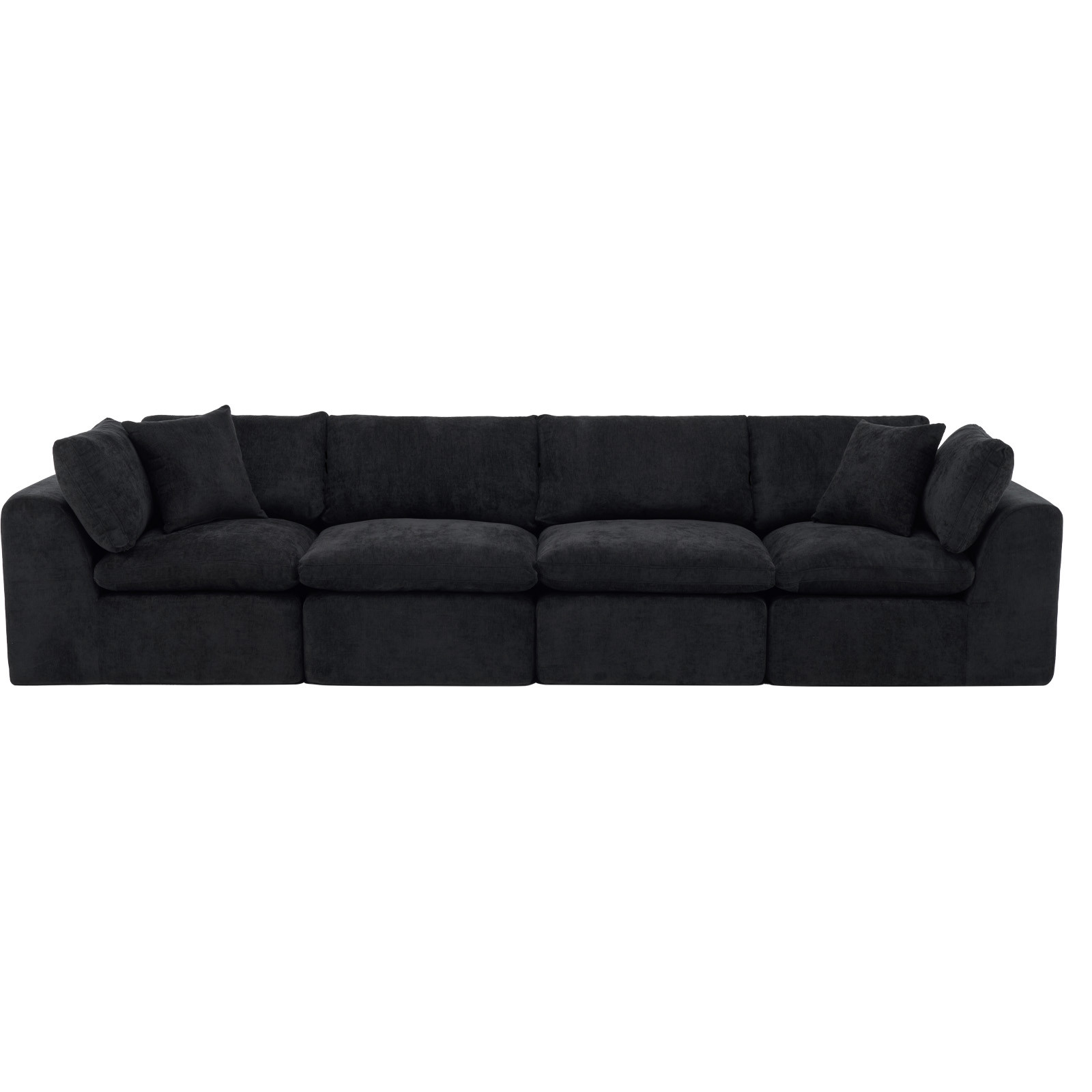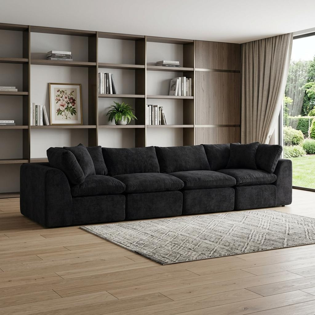 The 138-inch black chenille modular sofa with toss pillows offers a contemporary twist to your living space. Fully upholstered with a solid color soft and durable chenille upholstery, this modular set combines two end pieces and two middle sections to create a four seater sofa. The included toss pillows add an extra layer of comfort. With its plush foam frame, this sofa provides durable support for everyday use. The cushioned back and stylish wide arched arms enhance its contemporary design, making it a perfect centerpiece for any room. Experience a blend of luxury and functionality with this versatile modular sofa. 25.50-inch h x 138.00-inch w x 38.00-inch d.