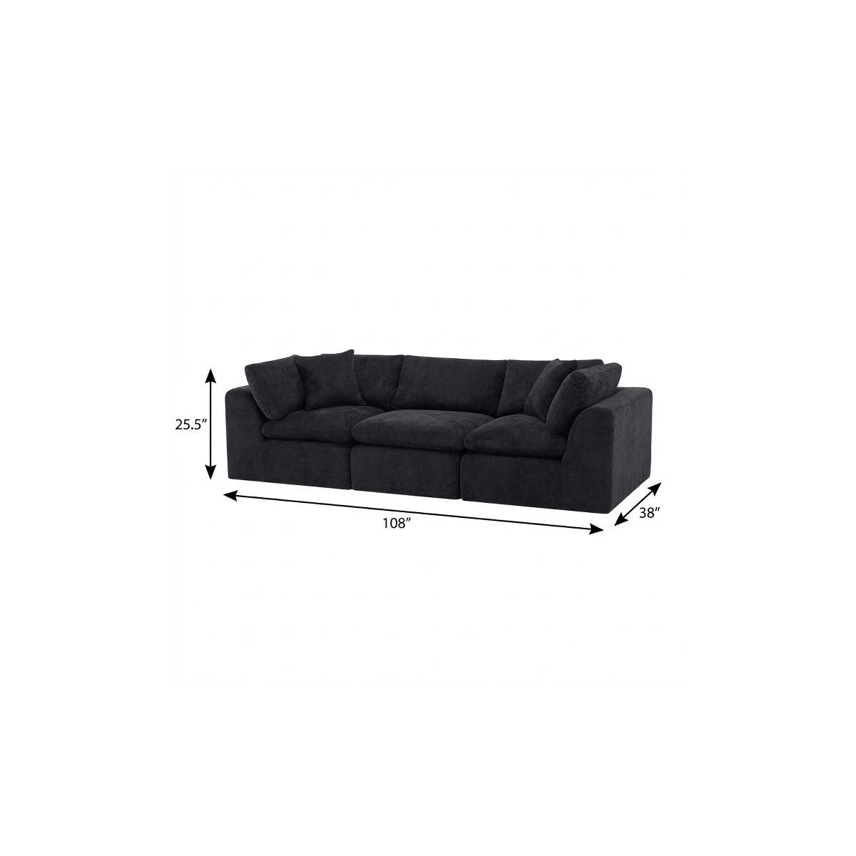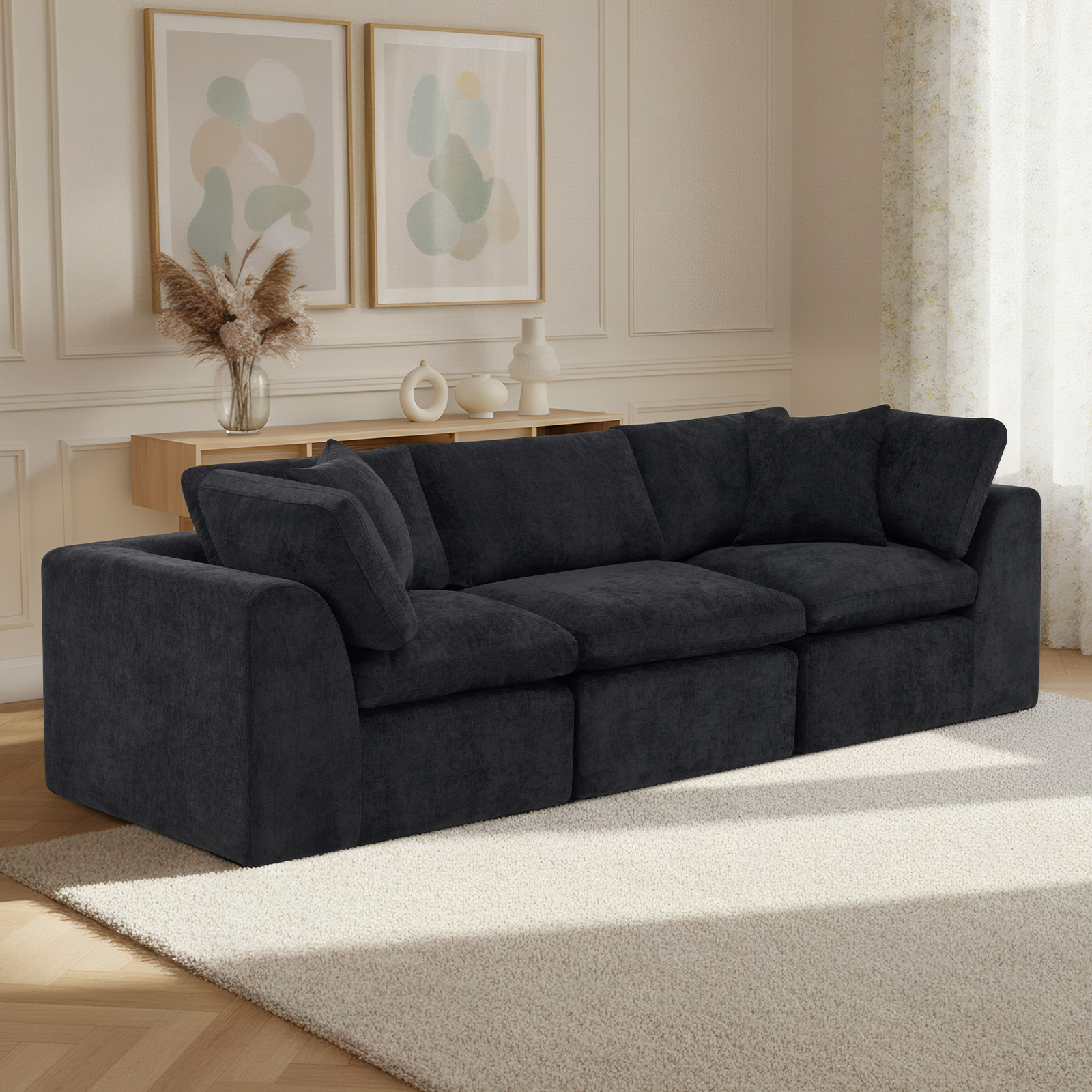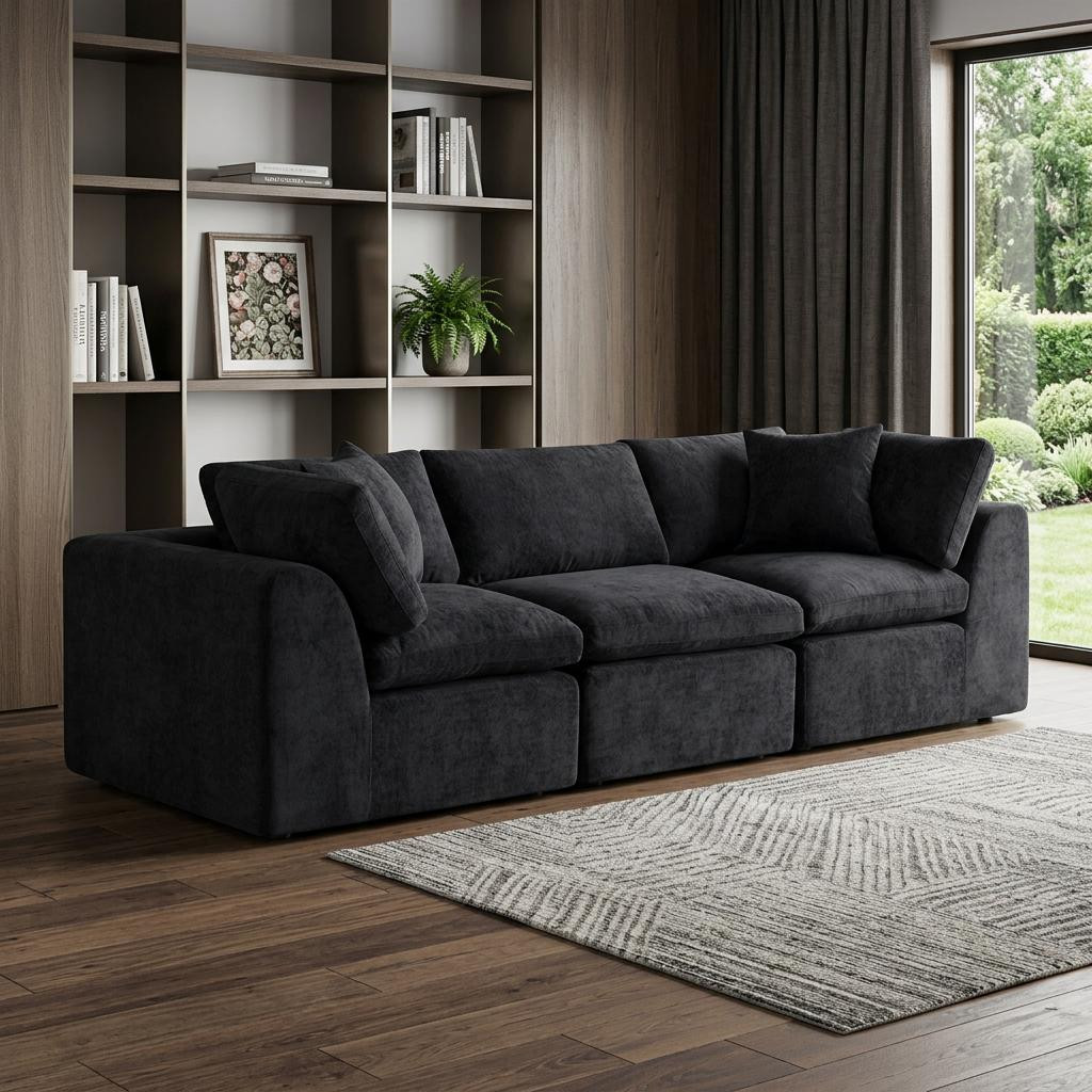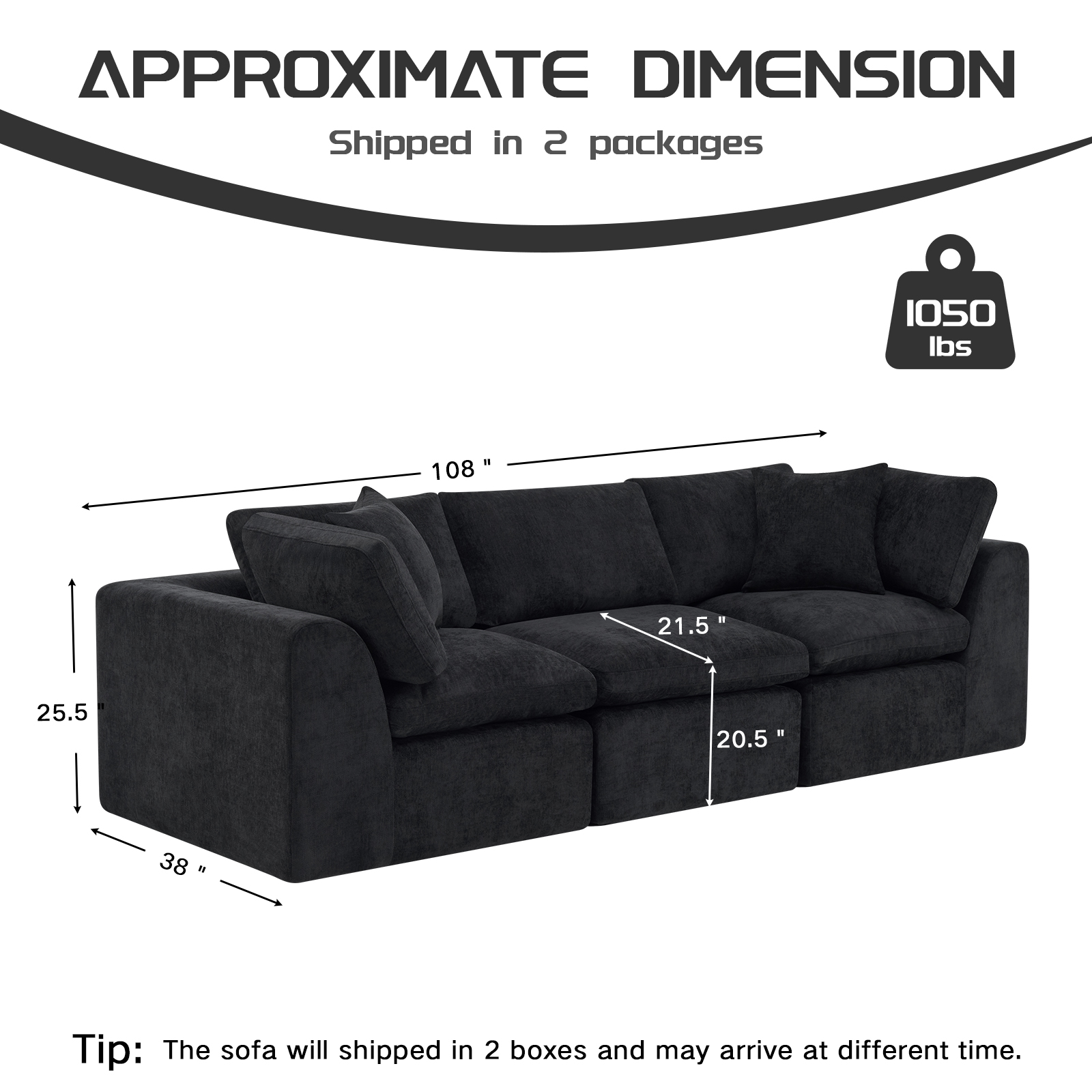 The 108-inch black chenille modular sofa with toss pillows is a stylish addition to any living space. Its modern design features a stylish solid color upholstery that complements a variety of decor themes. Fully upholstered with a solid color soft and durable chenille upholstery, this modular set combines two end pieces and middle to create a three seat sofa. The included toss pillows add an extra layer of comfort. With its plush foam frame, this sofa provides durable support for everyday use. The cushioned back and stylish wide arched arms enhance its contemporary design, making it a perfect centerpiece for any room. Experience a blend of luxury and functionality with this versatile modular sofa. 25.50-inch h x 108.00-inch w x 38.00-inch d.