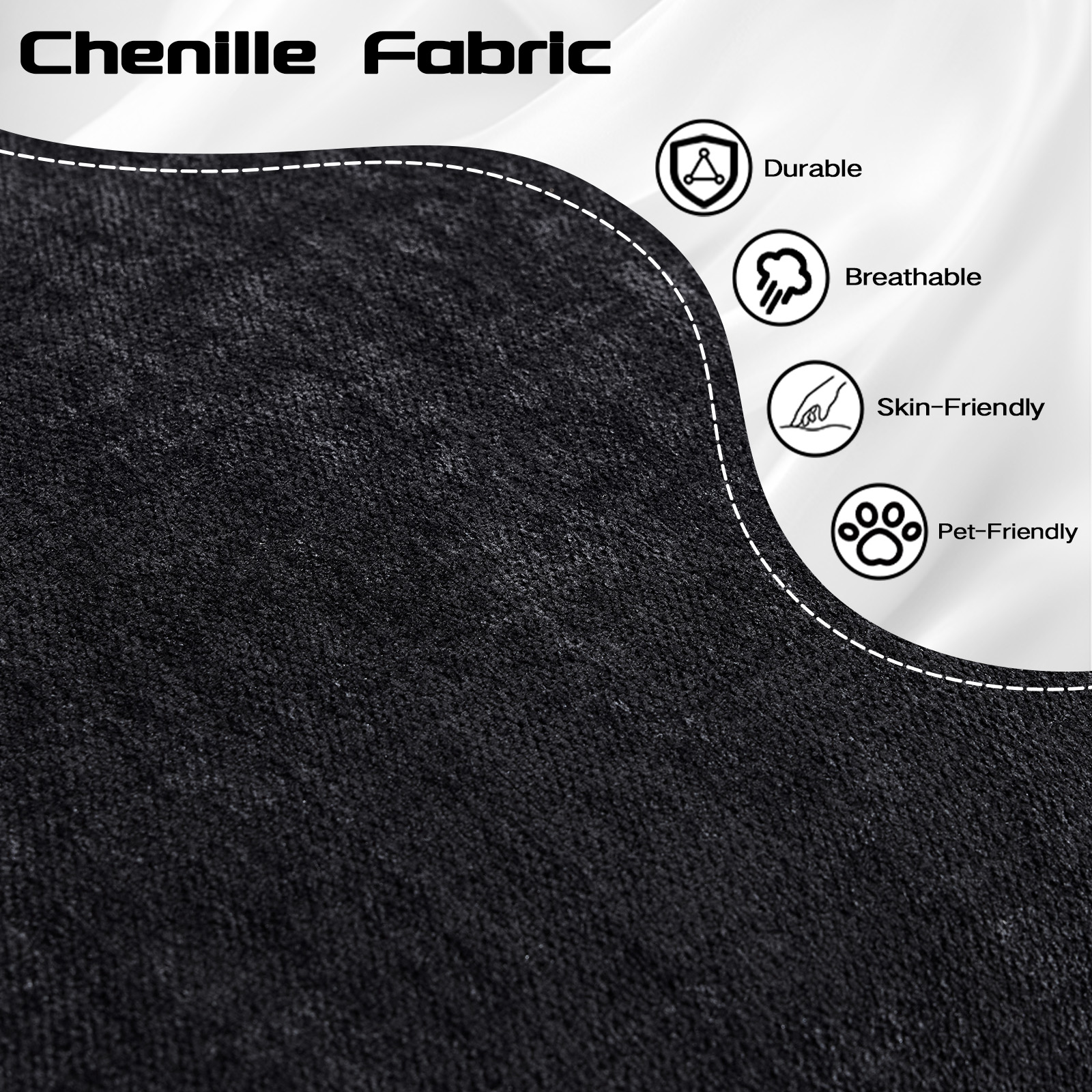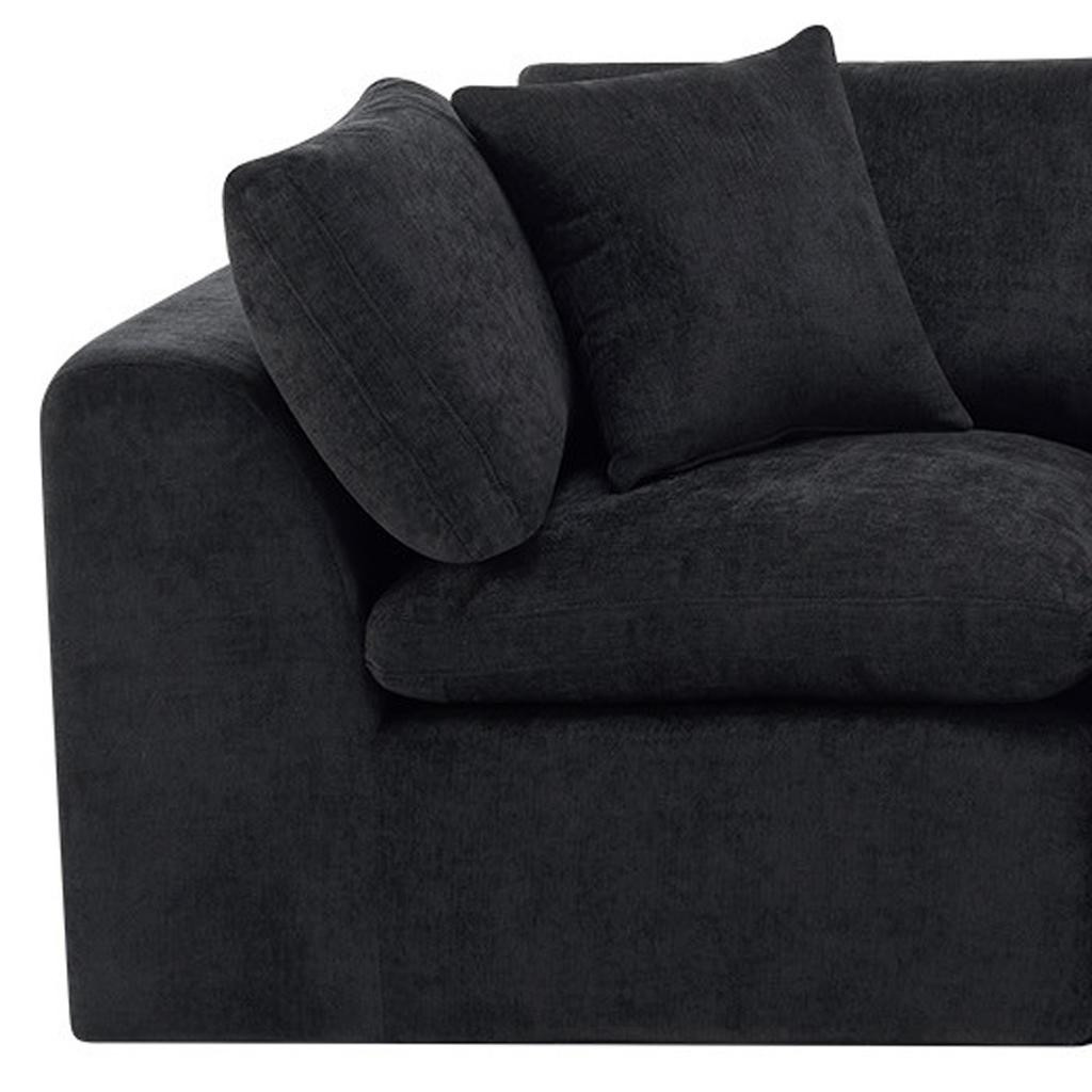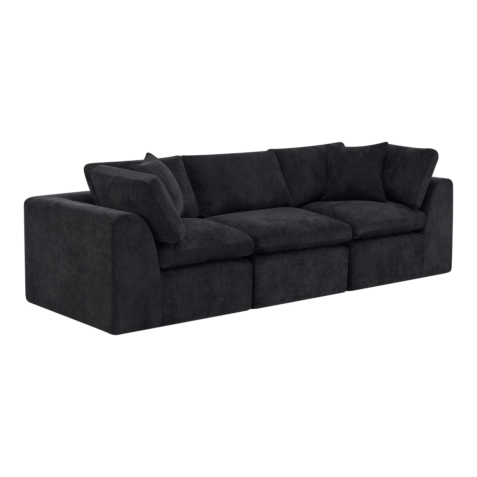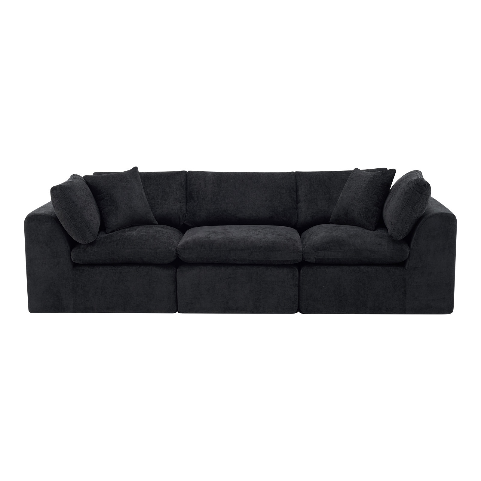 The 108-inch black chenille modular sofa with toss pillows is a stylish addition to any living space. Its modern design features a stylish solid color upholstery that complements a variety of decor themes. Fully upholstered with a solid color soft and durable chenille upholstery, this modular set combines two end pieces and middle to create a three seat sofa. The included toss pillows add an extra layer of comfort. With its plush foam frame, this sofa provides durable support for everyday use. The cushioned back and stylish wide arched arms enhance its contemporary design, making it a perfect centerpiece for any room. Experience a blend of luxury and functionality with this versatile modular sofa. 25.50-inch h x 108.00-inch w x 38.00-inch d.