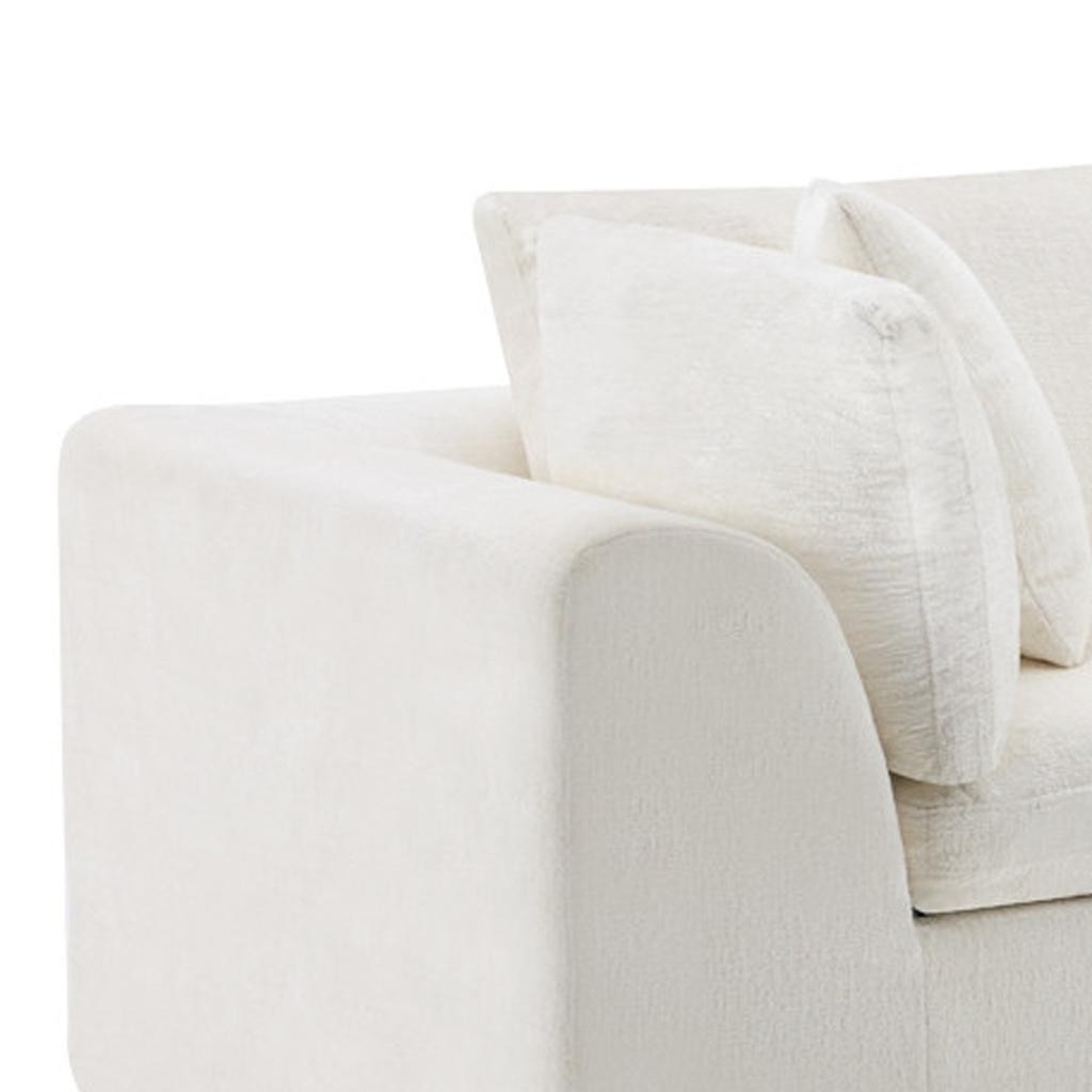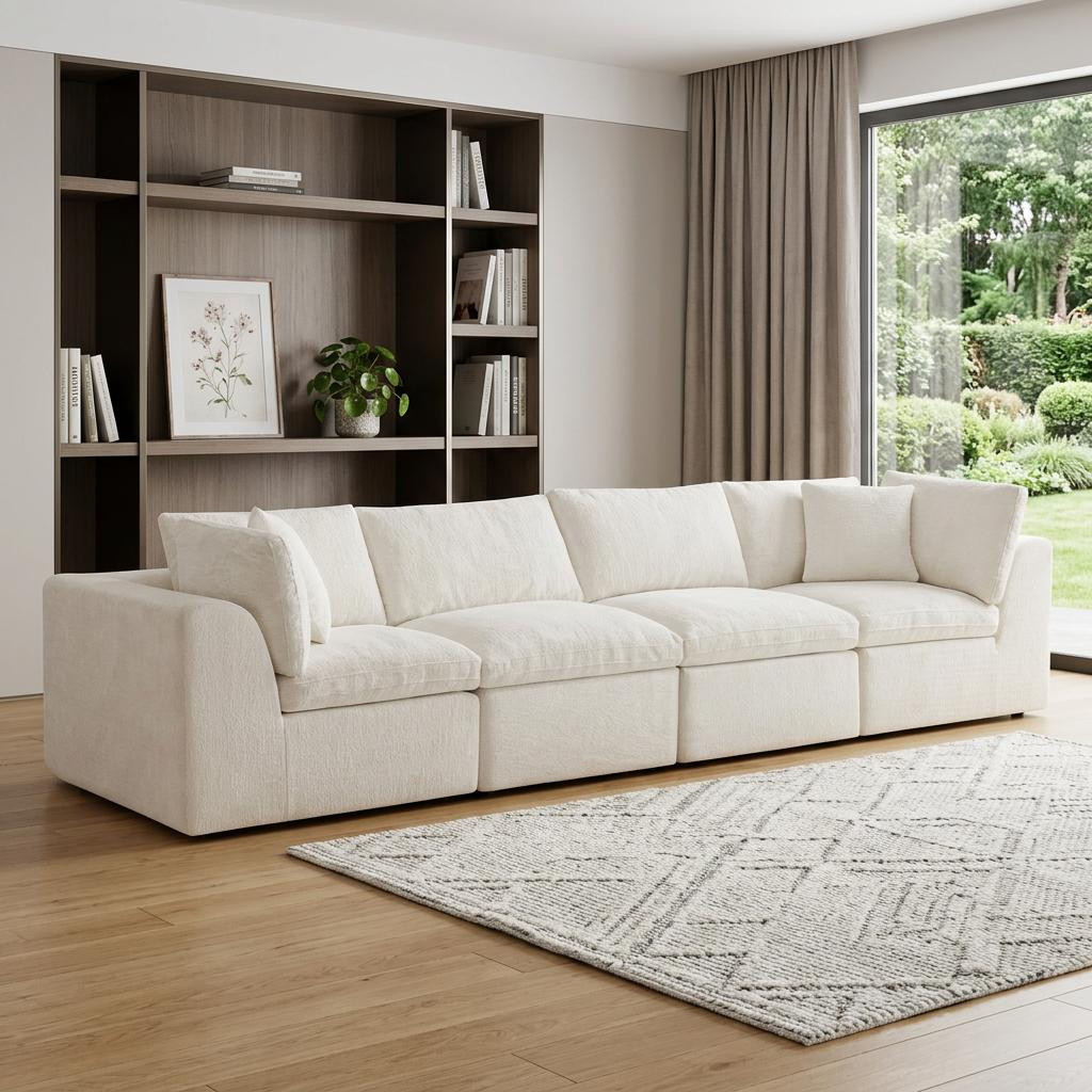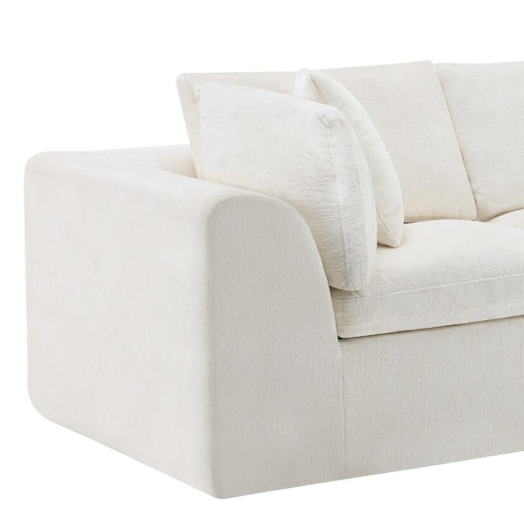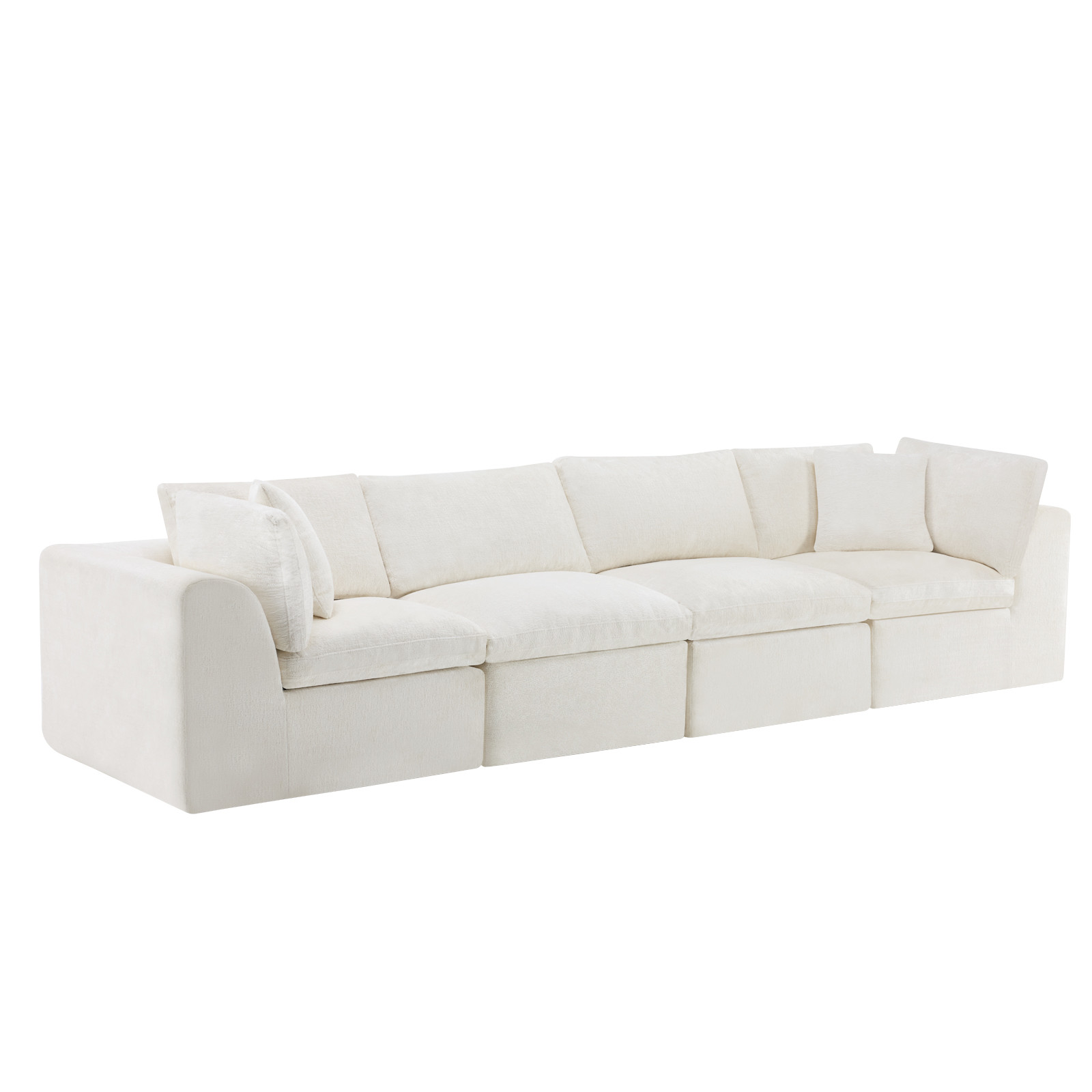 The 138-inch beige chenille modular sofa with toss pillows offers a versatile seating solution for any living space. Fully upholstered with a solid color soft and durable chenille upholstery, this modular set combines two end pieces and two middle sections to create a four seater sofa. The included toss pillows add an extra layer of comfort. With its plush foam frame, this sofa provides durable support for everyday use. The cushioned back and stylish wide arched arms enhance its contemporary design, making it a perfect centerpiece for any room. Experience a blend of luxury and functionality with this versatile modular sofa. 25.50-inch h x 138.00-inch w x 38.00-inch d.
