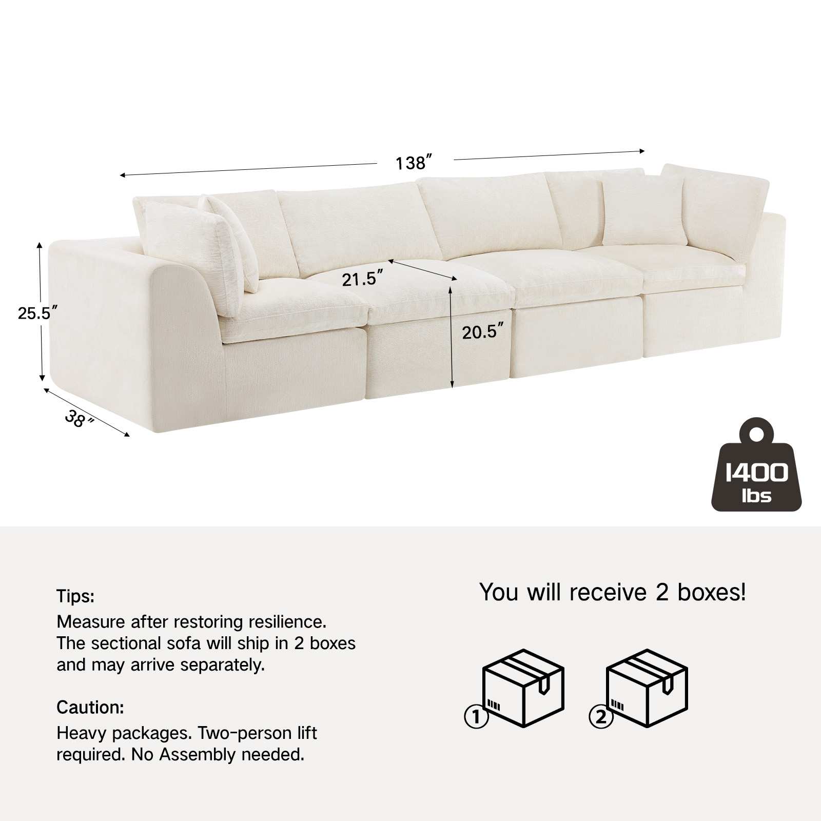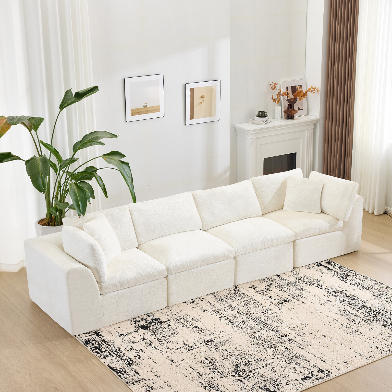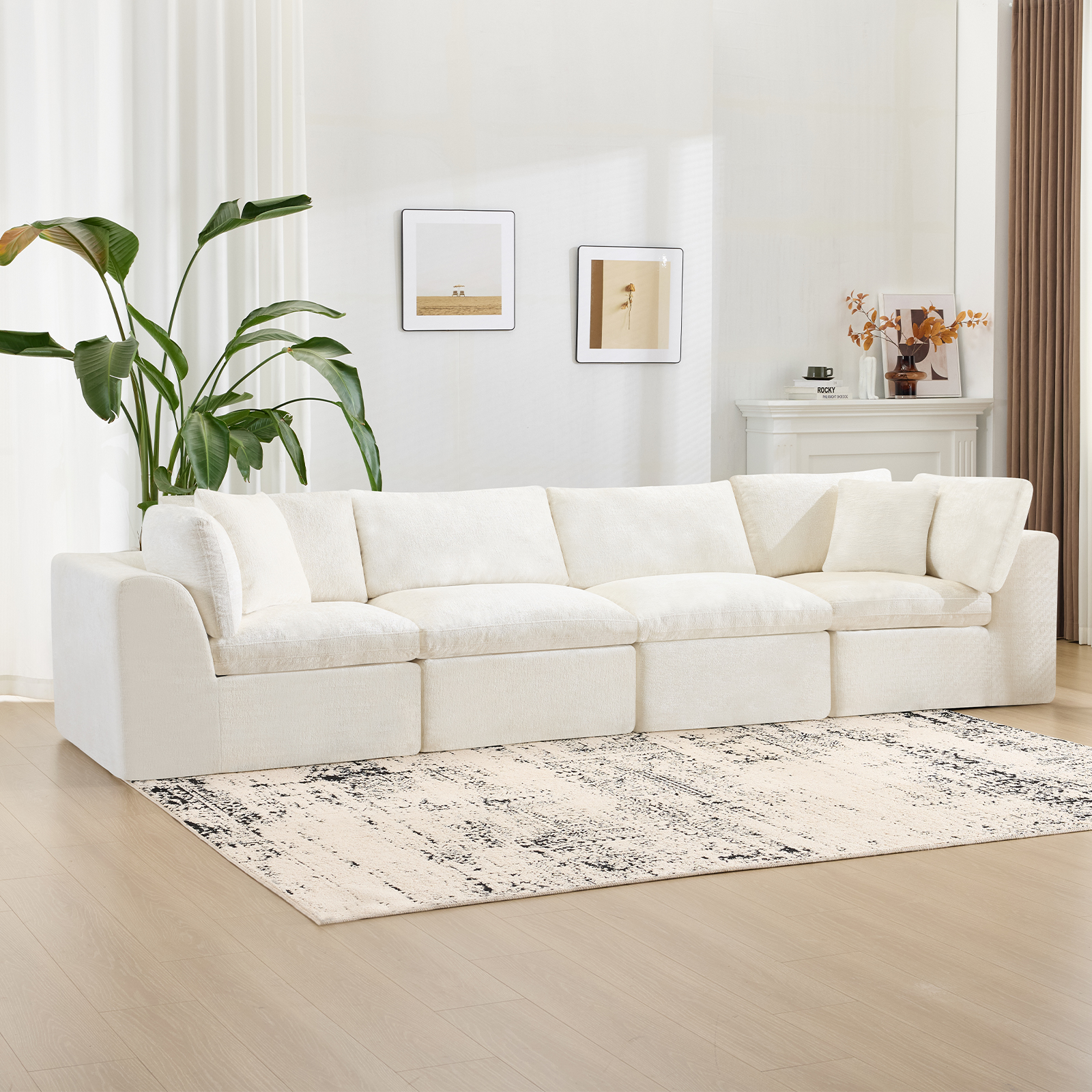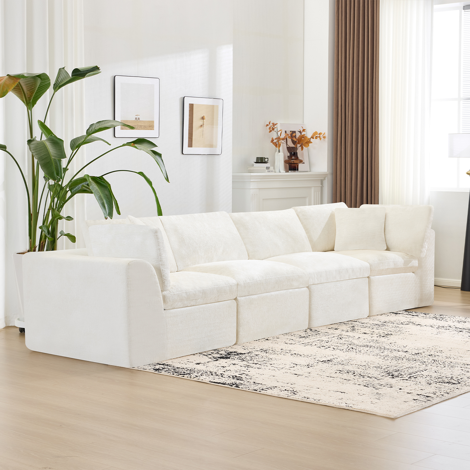 The 138-inch beige chenille modular sofa with toss pillows offers a versatile seating solution for any living space. Fully upholstered with a solid color soft and durable chenille upholstery, this modular set combines two end pieces and two middle sections to create a four seater sofa. The included toss pillows add an extra layer of comfort. With its plush foam frame, this sofa provides durable support for everyday use. The cushioned back and stylish wide arched arms enhance its contemporary design, making it a perfect centerpiece for any room. Experience a blend of luxury and functionality with this versatile modular sofa. 25.50-inch h x 138.00-inch w x 38.00-inch d.