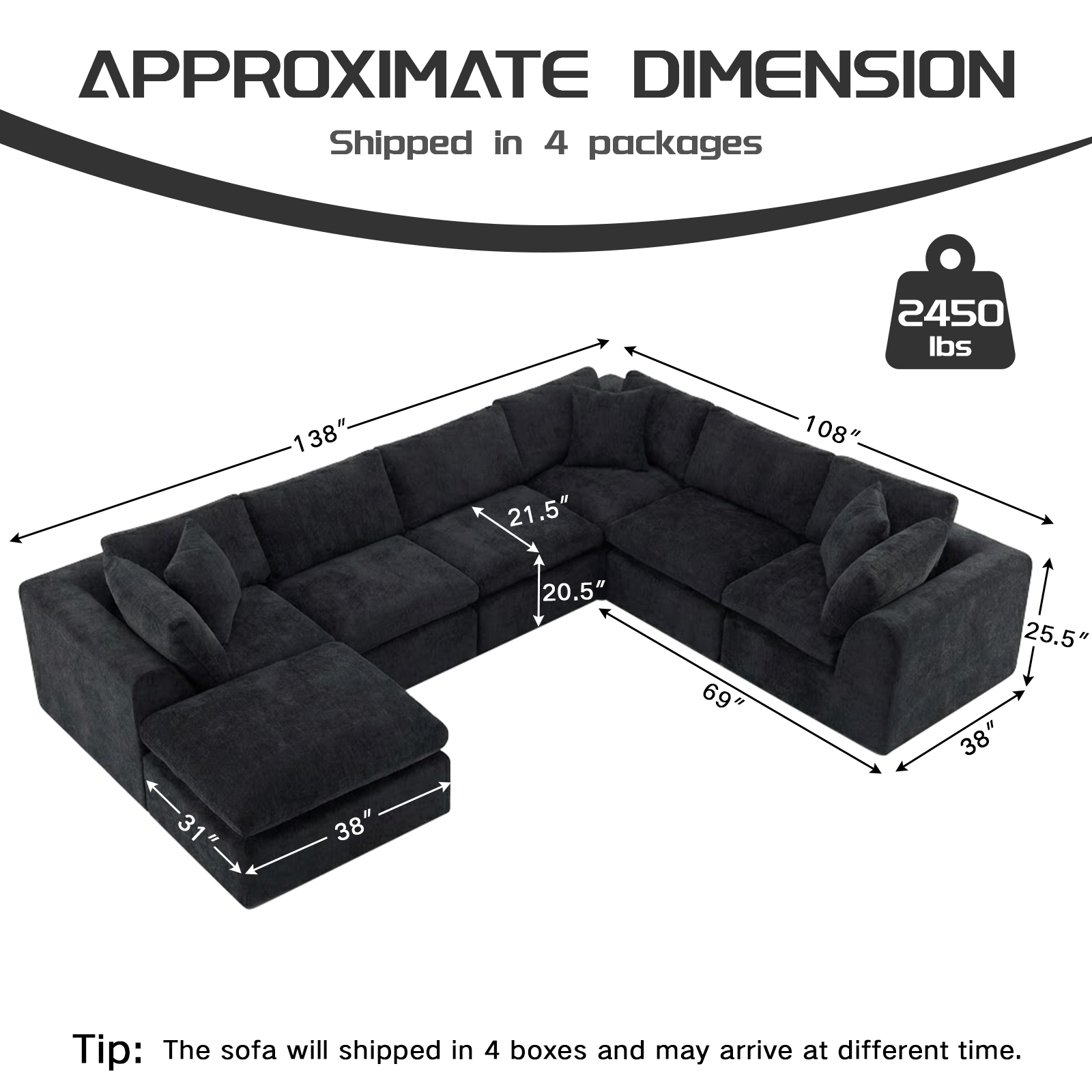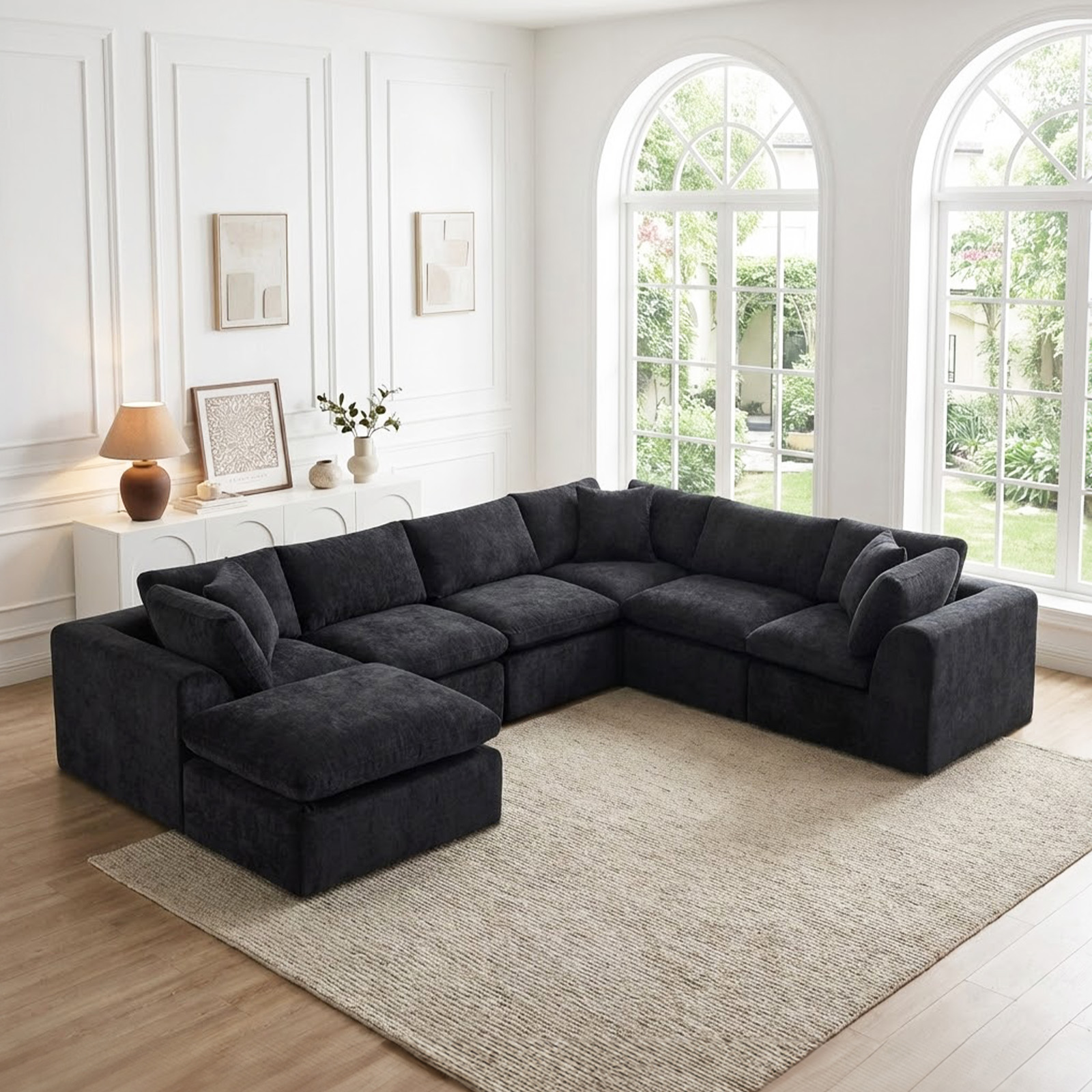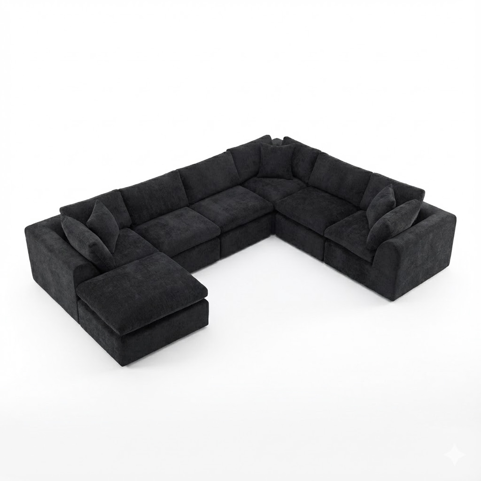 The 138-inch black chenille modular sofa chaise with ottoman and toss pillows offers a stylish and versatile addition to any living space. Its modular design allows for versatile configurations, making it perfect for gatherings or relaxation. Fully upholstered with a solid color soft and durable chenille upholstery, this modular set includes a moveable ottoman, two end pieces, three middle sections, and a corner wedge to create a versatile multi-seat sofa. Three included toss pillows add an extra layer of comfort. With its plush foam frame, this sofa provides durable support for everyday use. The cushioned back and stylish wide arched arms enhance its contemporary design, making it a perfect centerpiece for any room. Experience a blend of luxury and functionality with this versatile modular sofa. 25.50-inch h x 138.00-inch w x 108.00-inch d.