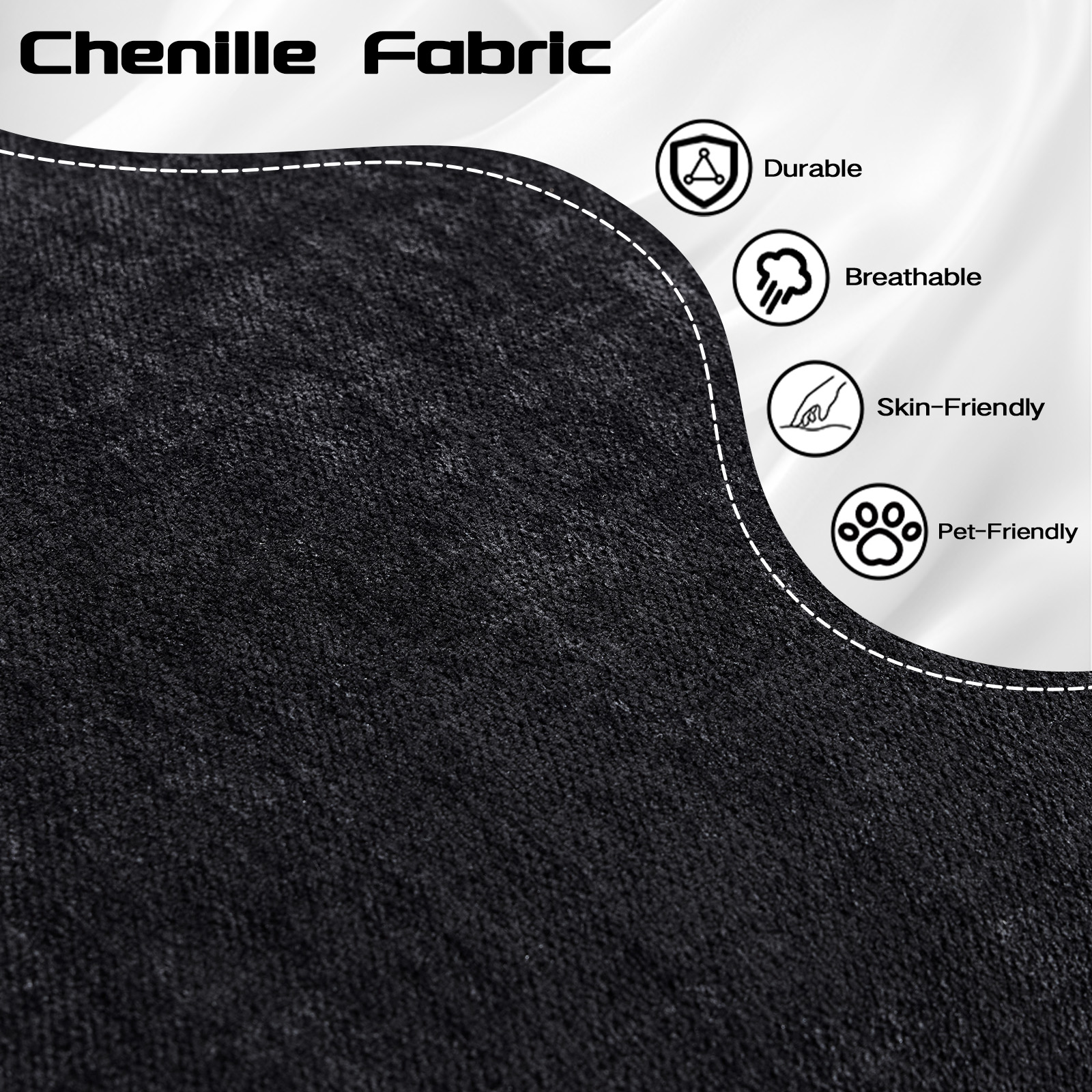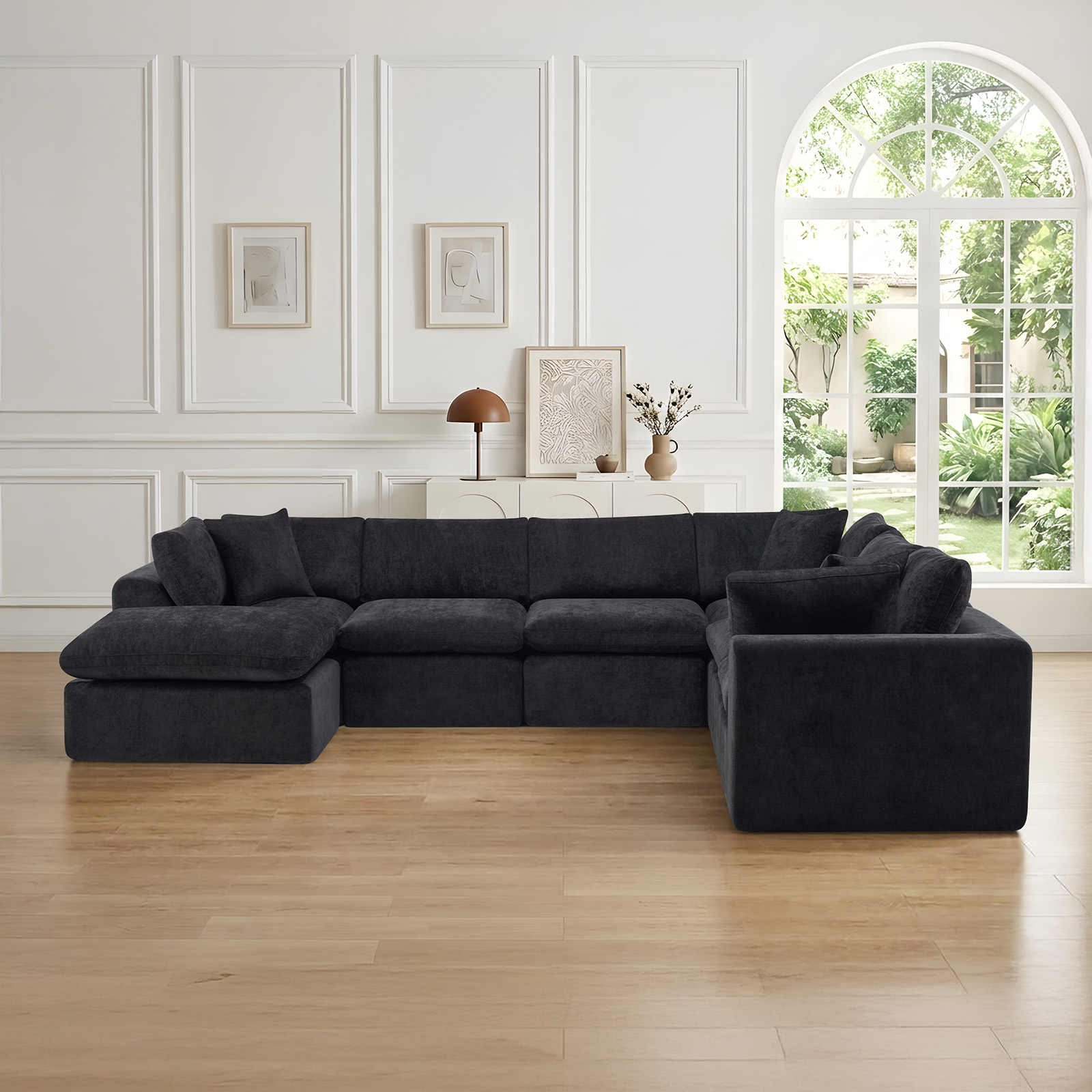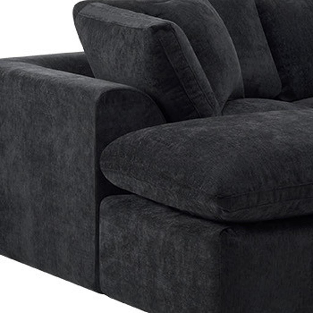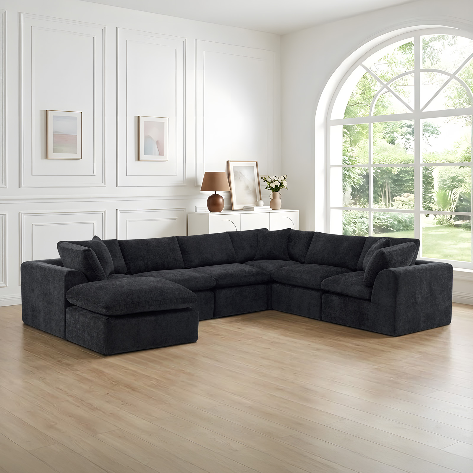 The 138-inch black chenille modular sofa chaise with ottoman and toss pillows offers a stylish and versatile addition to any living space. Its modular design allows for versatile configurations, making it perfect for gatherings or relaxation. Fully upholstered with a solid color soft and durable chenille upholstery, this modular set includes a moveable ottoman, two end pieces, three middle sections, and a corner wedge to create a versatile multi-seat sofa. Three included toss pillows add an extra layer of comfort. With its plush foam frame, this sofa provides durable support for everyday use. The cushioned back and stylish wide arched arms enhance its contemporary design, making it a perfect centerpiece for any room. Experience a blend of luxury and functionality with this versatile modular sofa. 25.50-inch h x 138.00-inch w x 108.00-inch d.