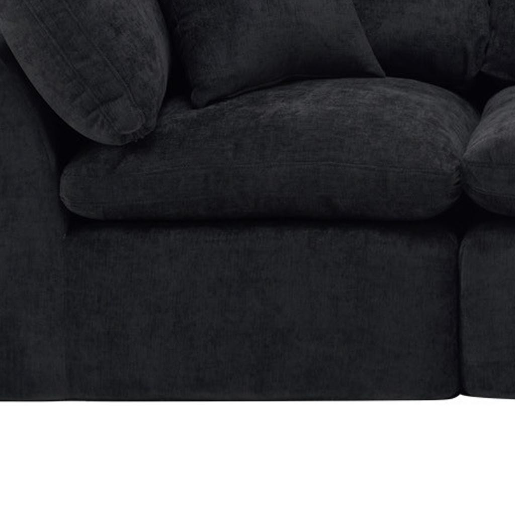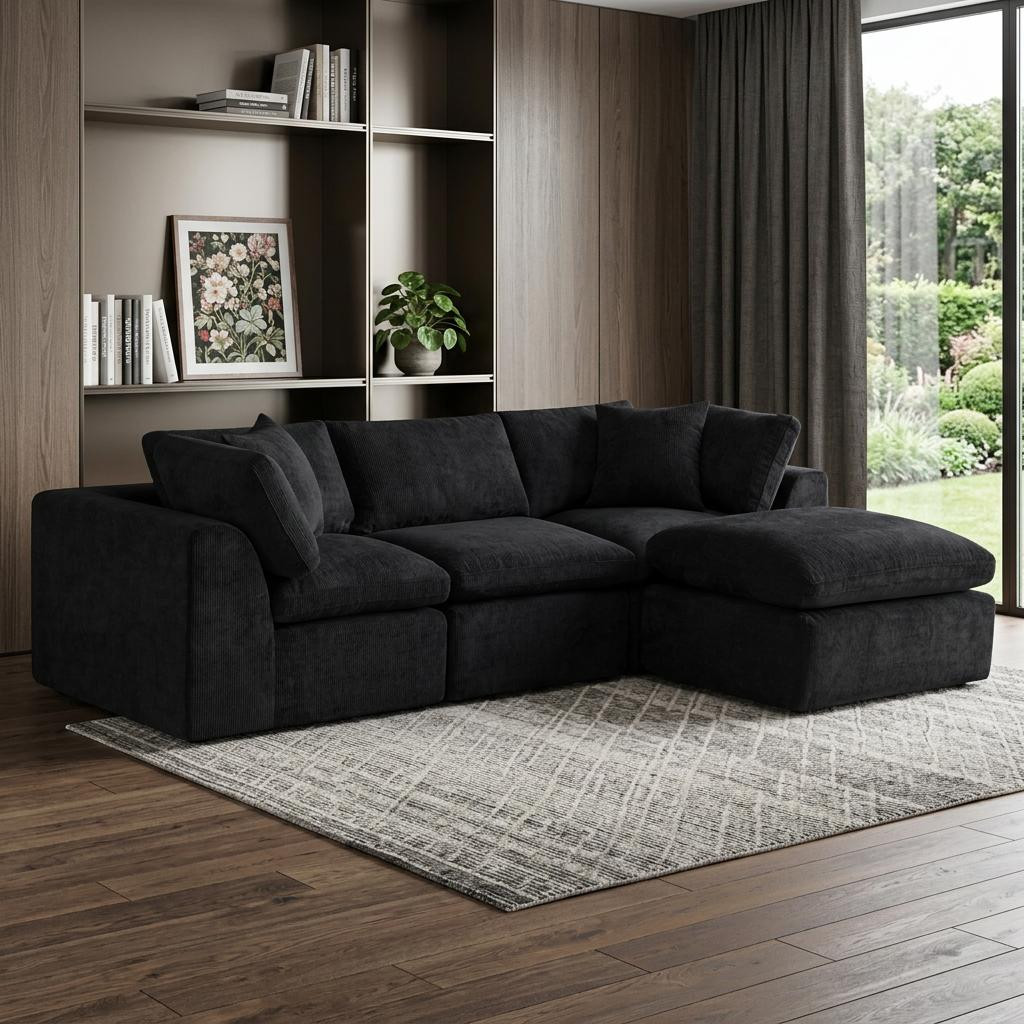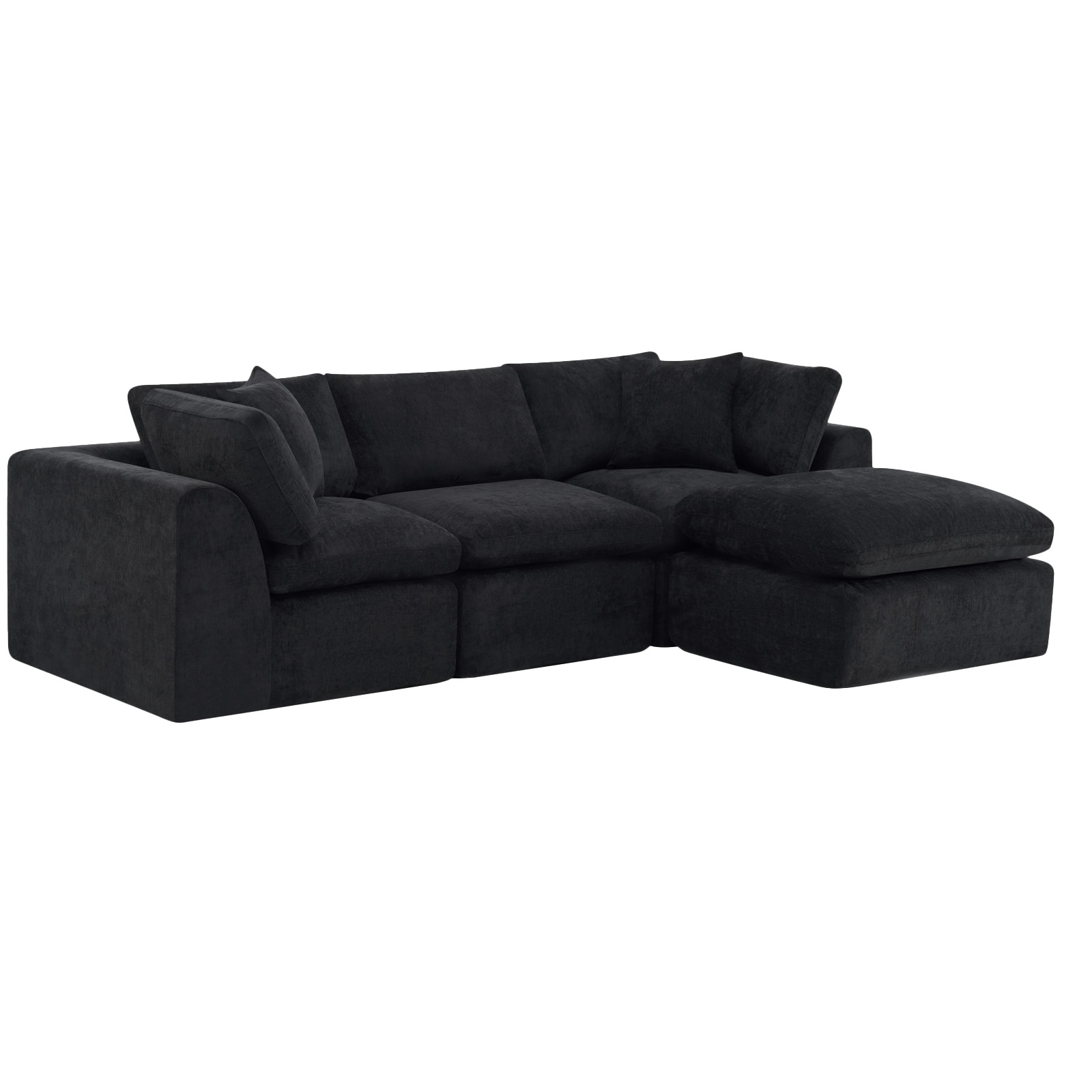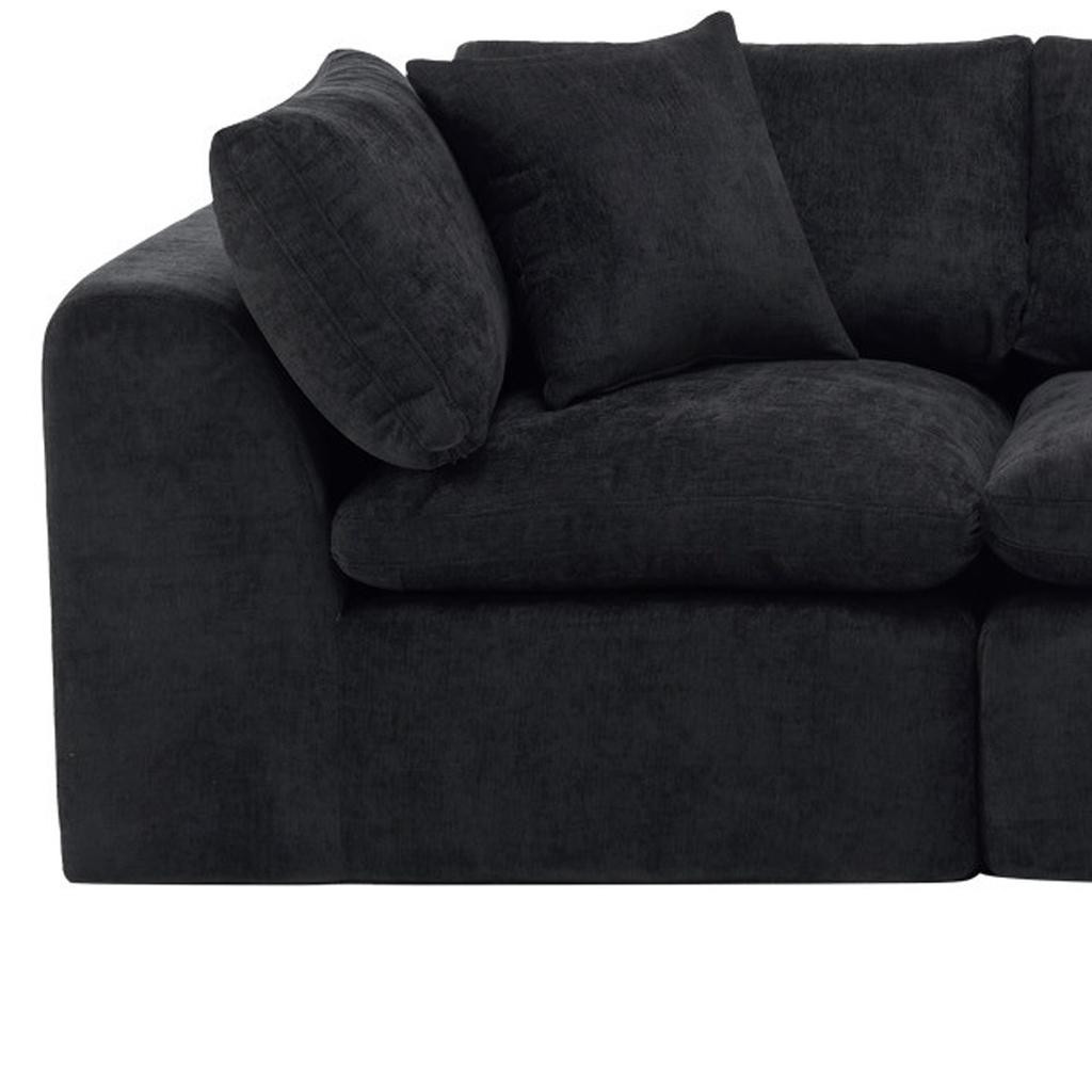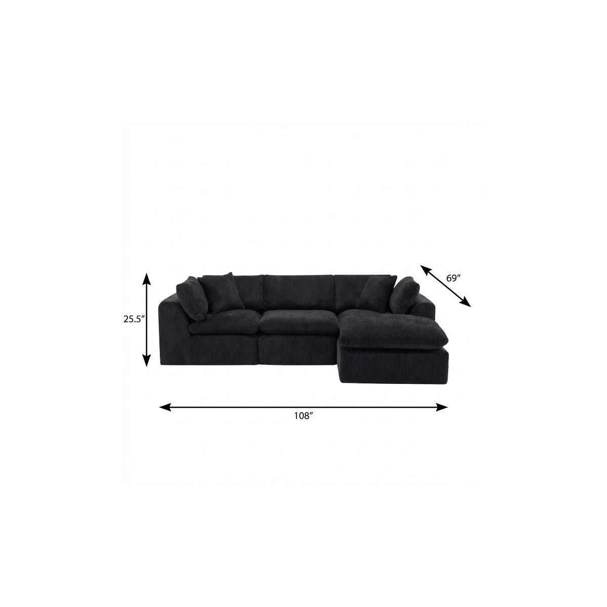 The 108-inch black chenille modular sofa with ottoman and toss pillows offers a contemporary touch to your living space. Fully upholstered with a solid color soft and durable chenille upholstery, this modular set combines an ottoman, two end pieces and middle to create a three seat sofa. The included toss pillows add an extra layer of comfort. With its plush foam frame, this sofa provides durable support for everyday use. The cushioned back and stylish wide arched arms enhance its contemporary design, making it a perfect centerpiece for any room. Experience a blend of luxury and functionality with this versatile modular sofa. 25.50-inch h x 108.00-inch w x 69.00-inch d.