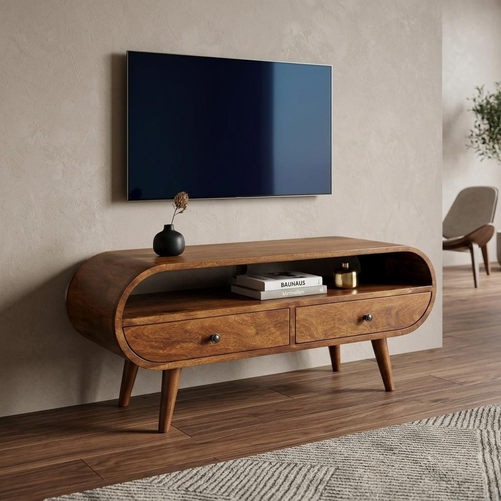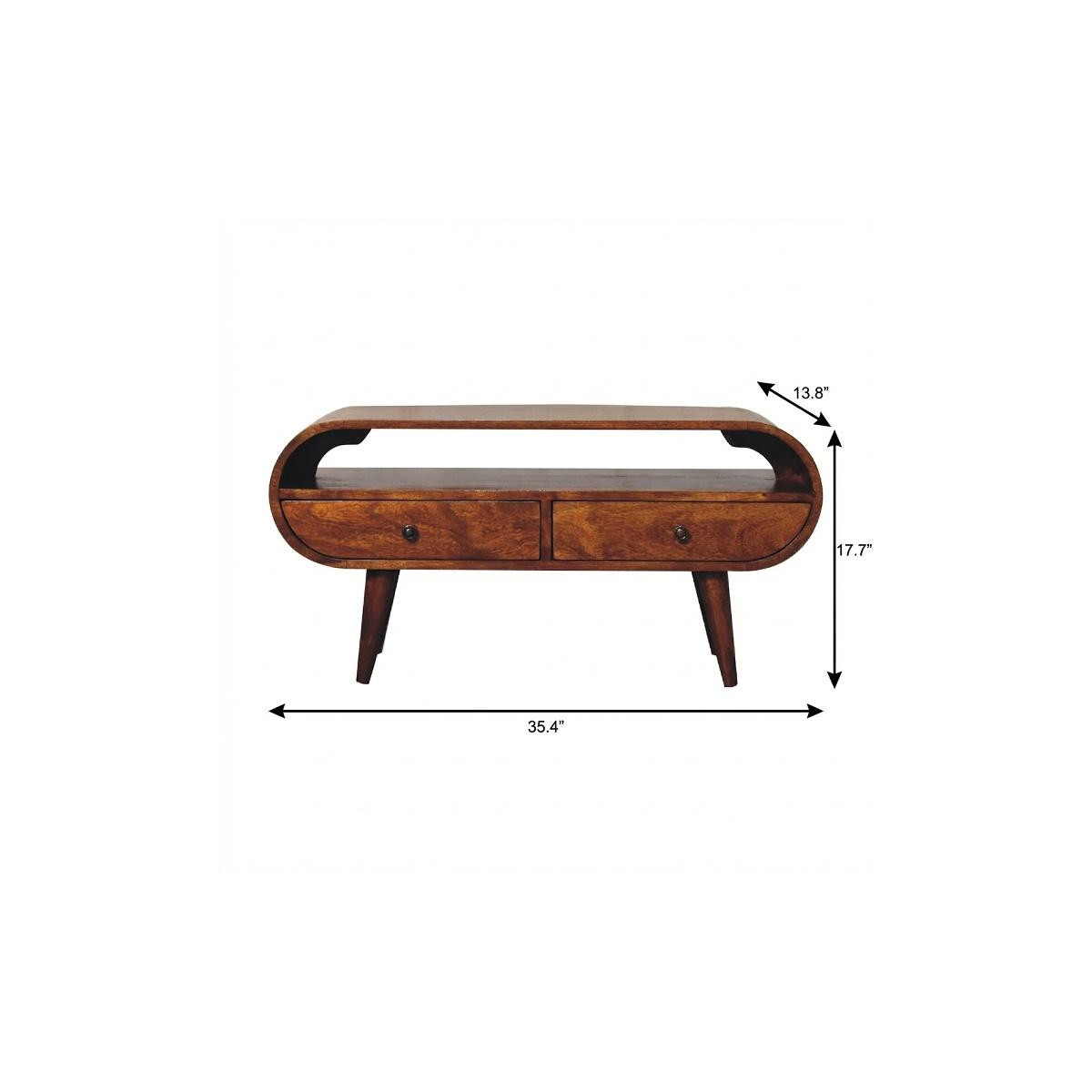 Practical, space saving, and good looking, this 35-inch brown solid wood enclosed and open storage tv stand is a versatile media storage solution. Designed to be sturdy and long lasting, this versatile furniture piece is crafted from durable solid wood and features a modern design style. A cord cut out hole is ideal for wire and cable management to keep your space look tidy. Convert your room into a special place with your favorite collectibles and tv accessories that is suitable for living room, bedroom, or office. 17.70-inch h x 35.40-inch w x 13.80-inch d.
